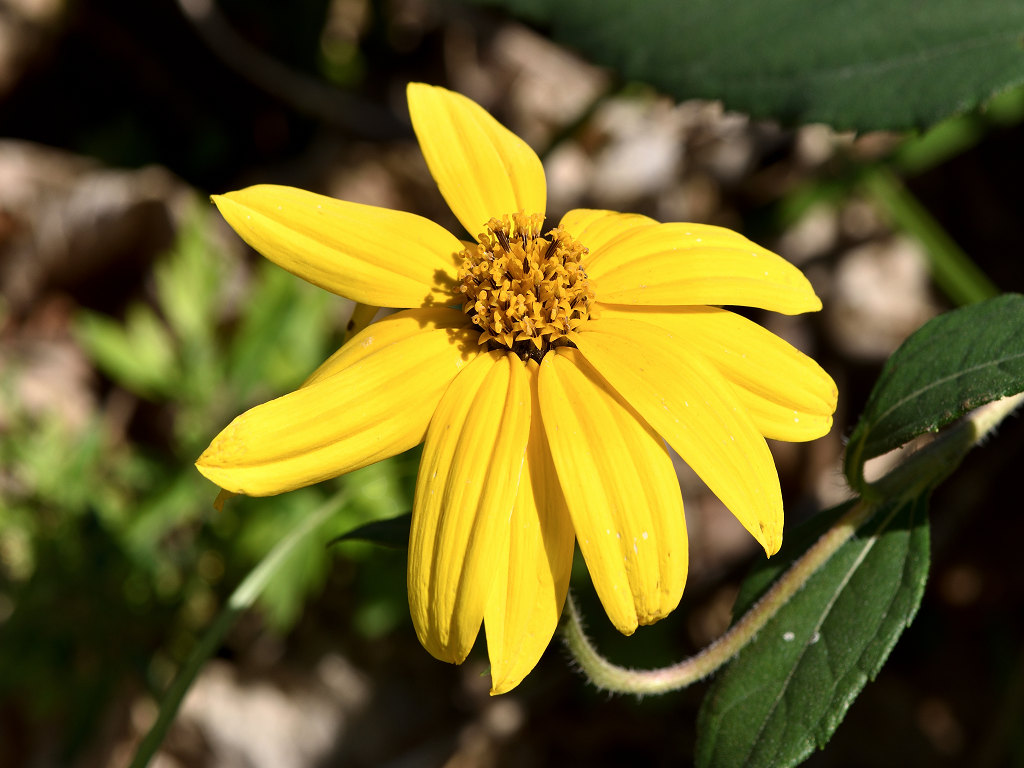 黄色い舌状花が10−20まいつき、中央に半球形の筒状花が集合した花が茎の上部で多数咲く