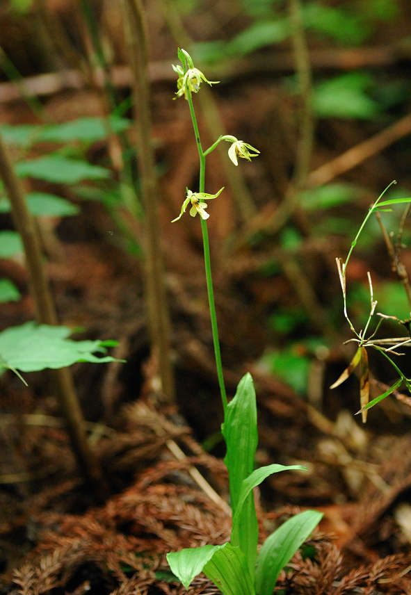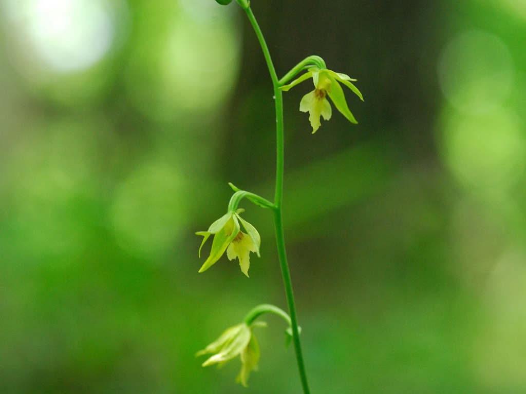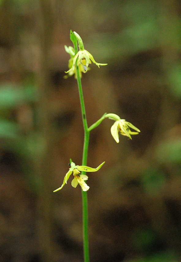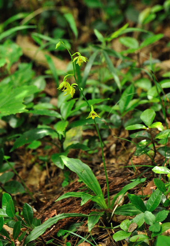 エビネの仲間 葉は広い披針形で数枚つく。花はまばらに数個つく。萼片は披針形で、広がっていて先が尖る。唇弁は萼片と同じ位の長さで、先は3裂する