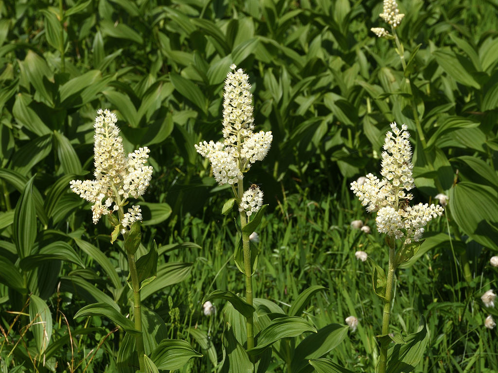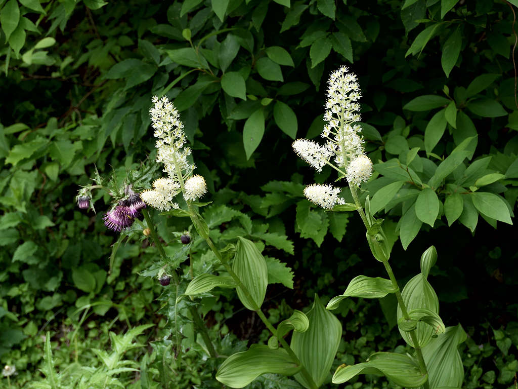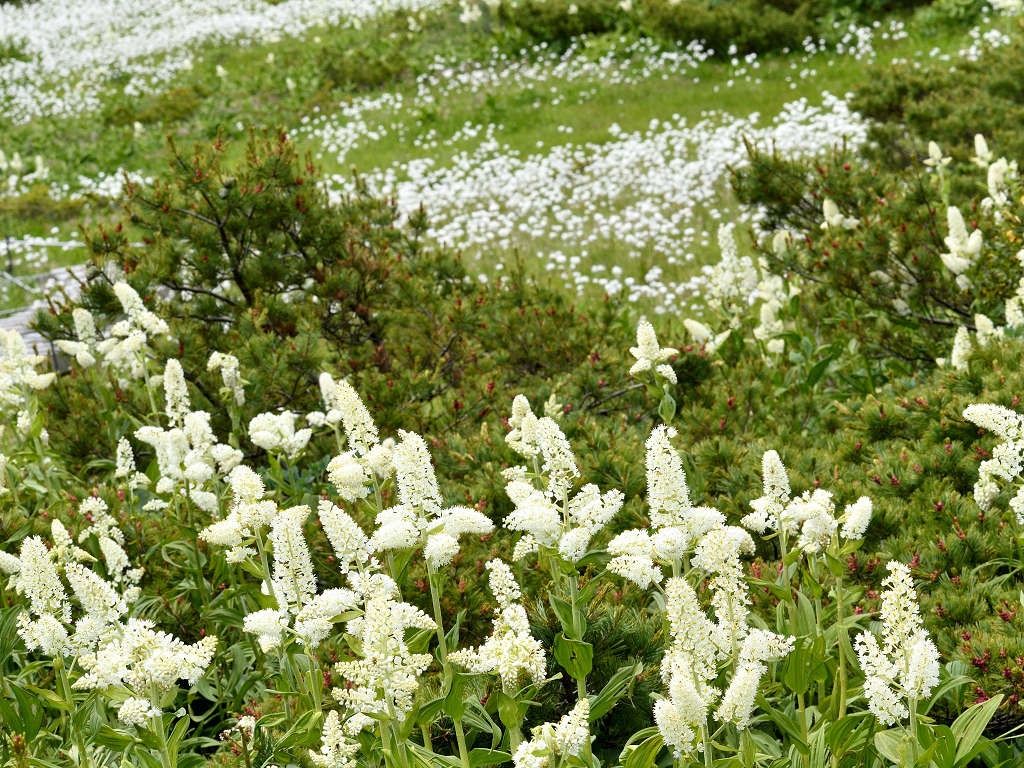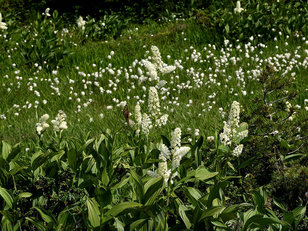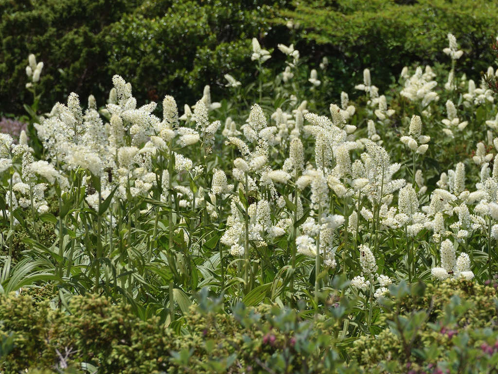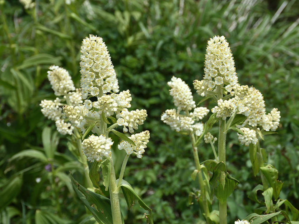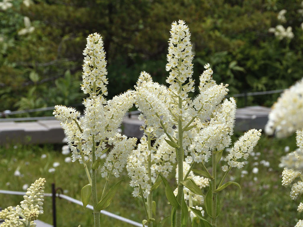 高さ1m程度にもなる花茎 バイケイソウの花やや緑かかっているが本種は白い。また花びらが丸みがあり梅の花のようなのがコバイケイソウ、花びらが尖がってるこの花がバイケイソウ