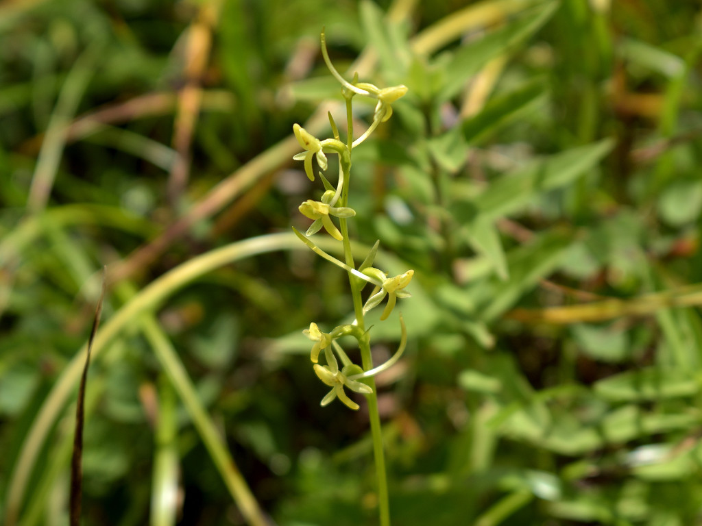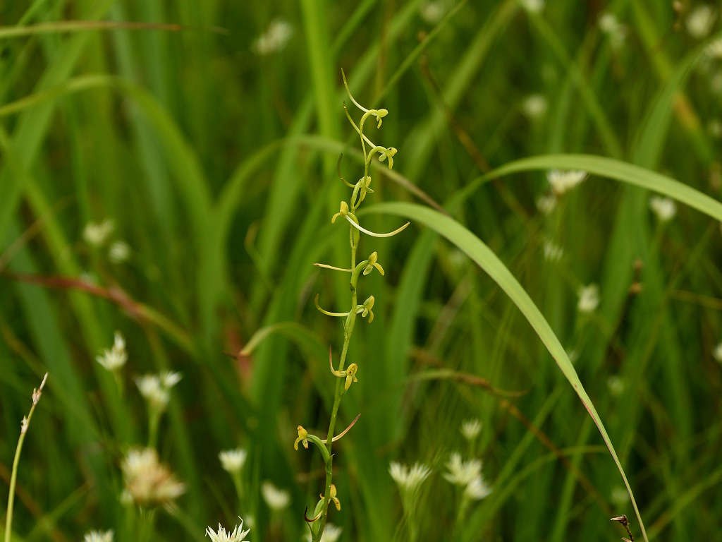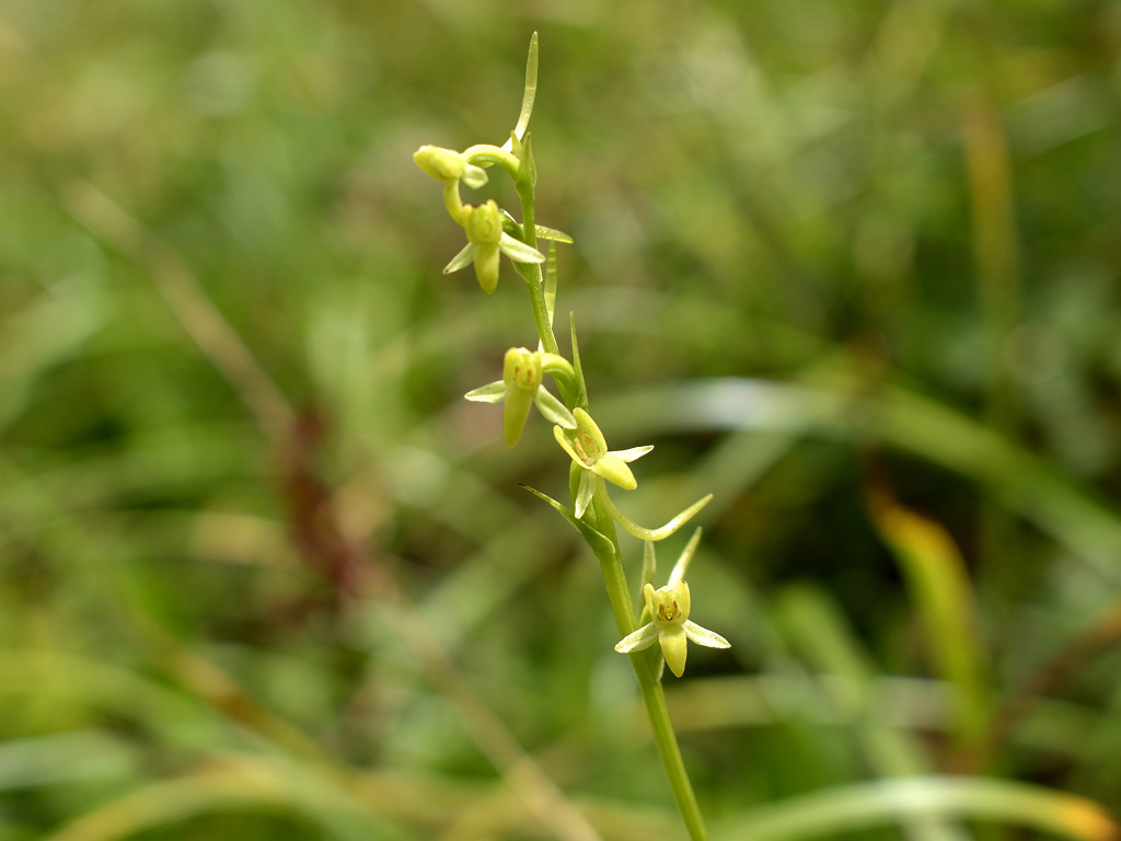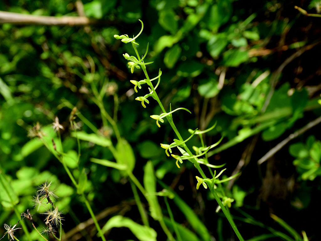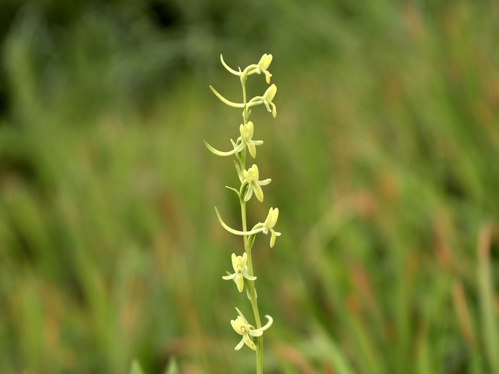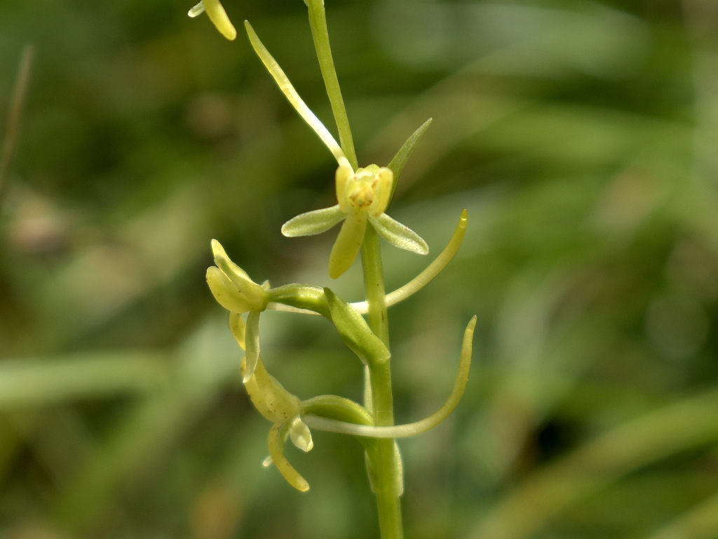穂状花序に一方にかたよって淡黄緑色の花を数個まばらにつける 似ているホソバノキソチドリは距が下〜前方に曲がる