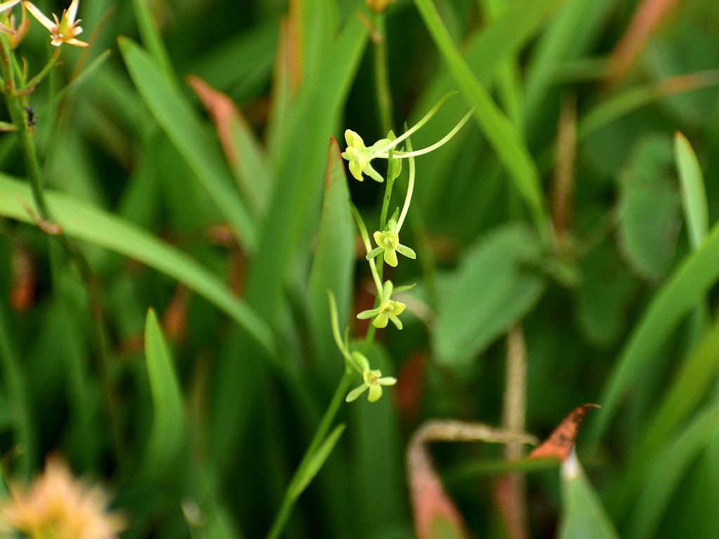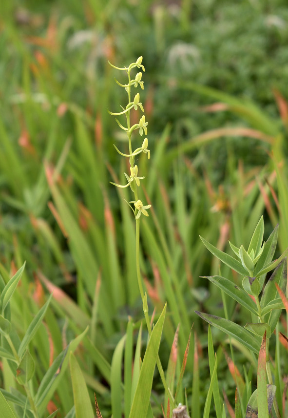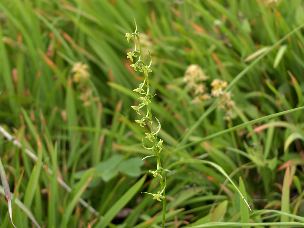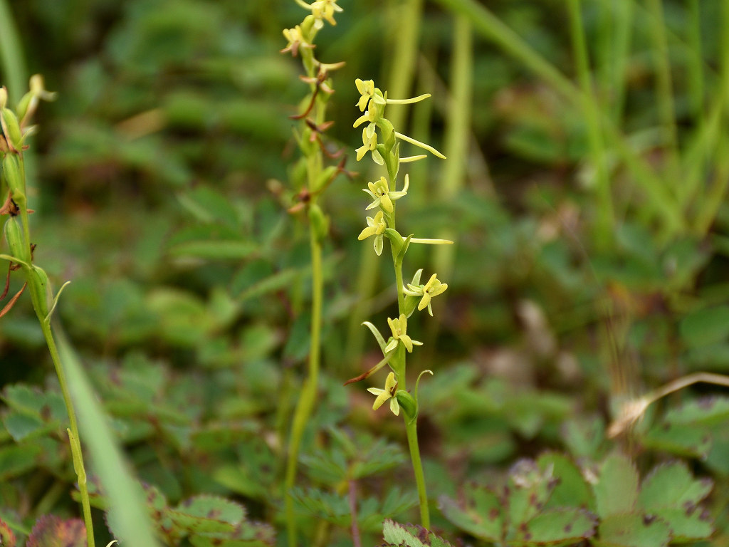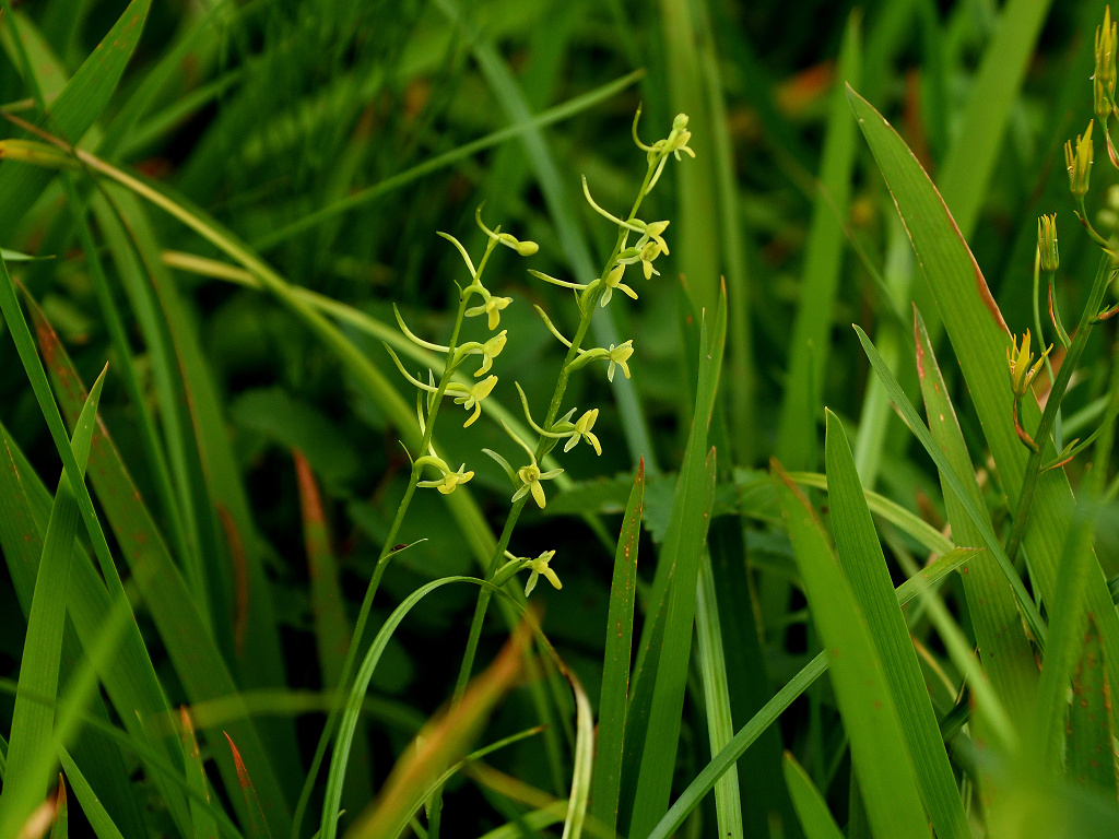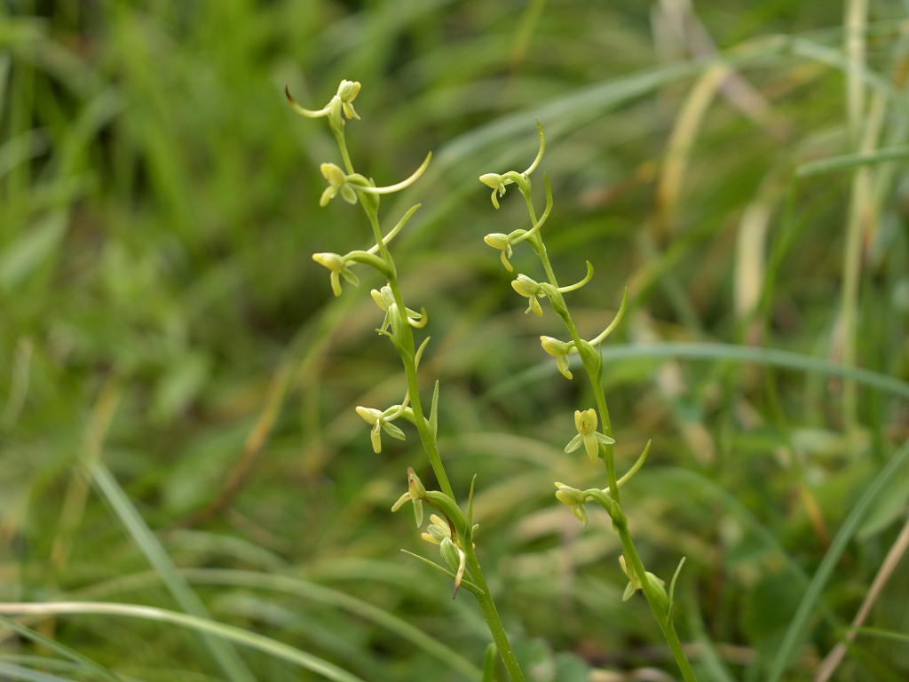 穂状花序に一方にかたよって淡黄緑色の花を数個まばらにつける 似ているホソバノキソチドリは距が下〜前方に曲がる