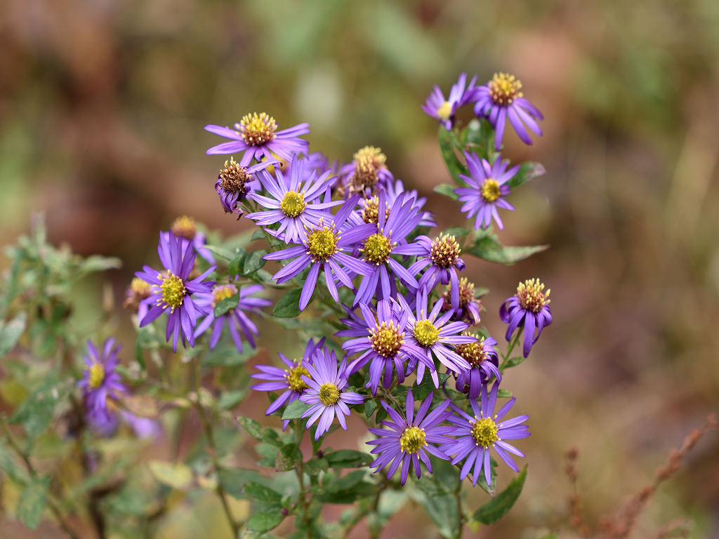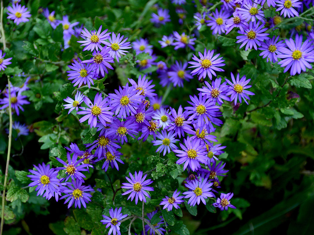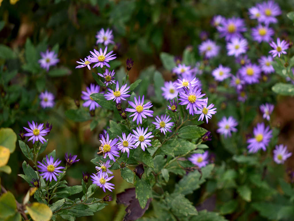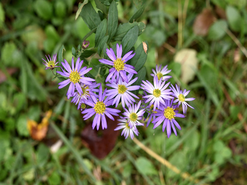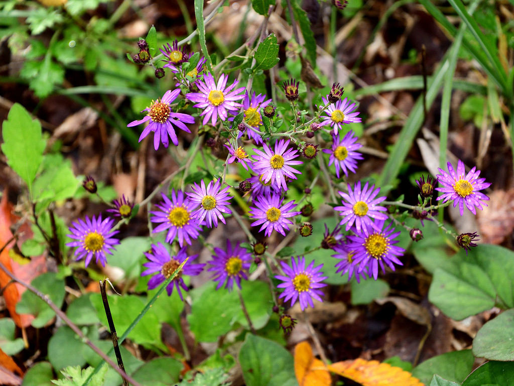 濃青紫色の花弁と黄色い筒状花からなる小花を沢山咲かせる ノコンギクより花色が青く、花付きが良い