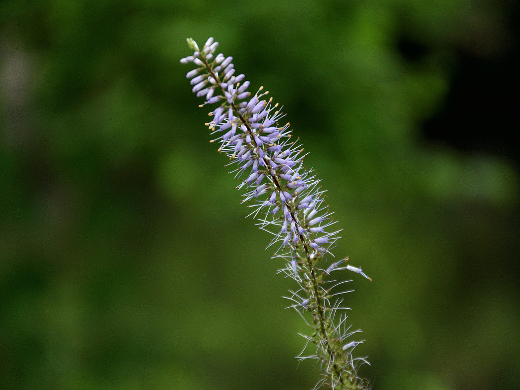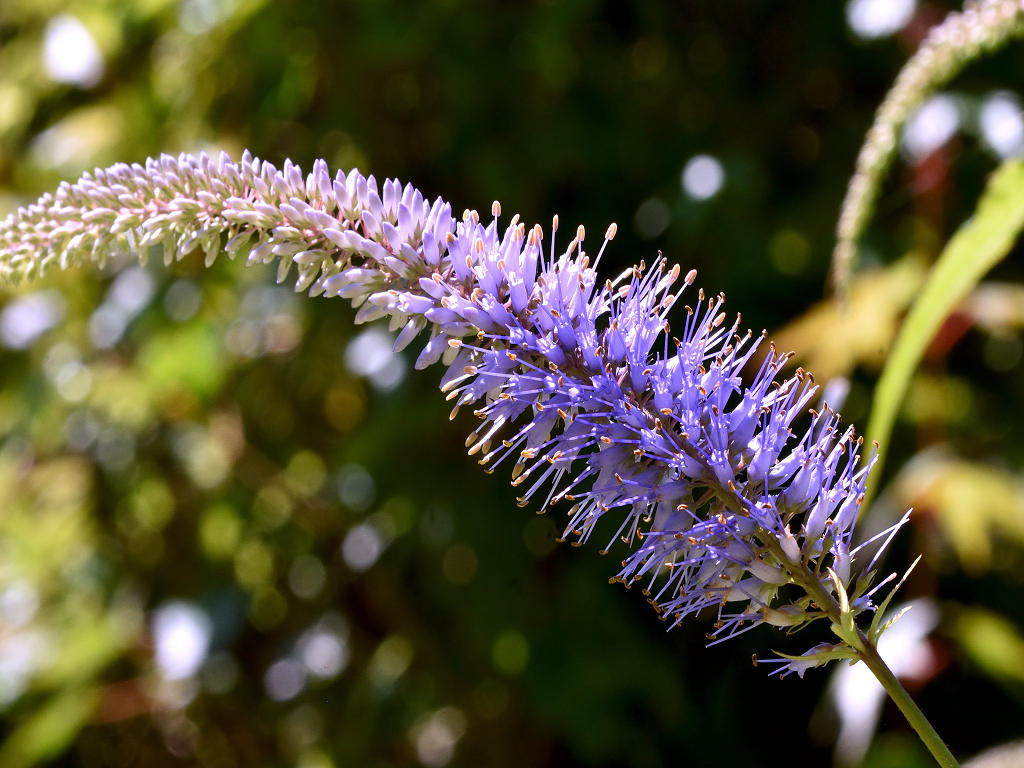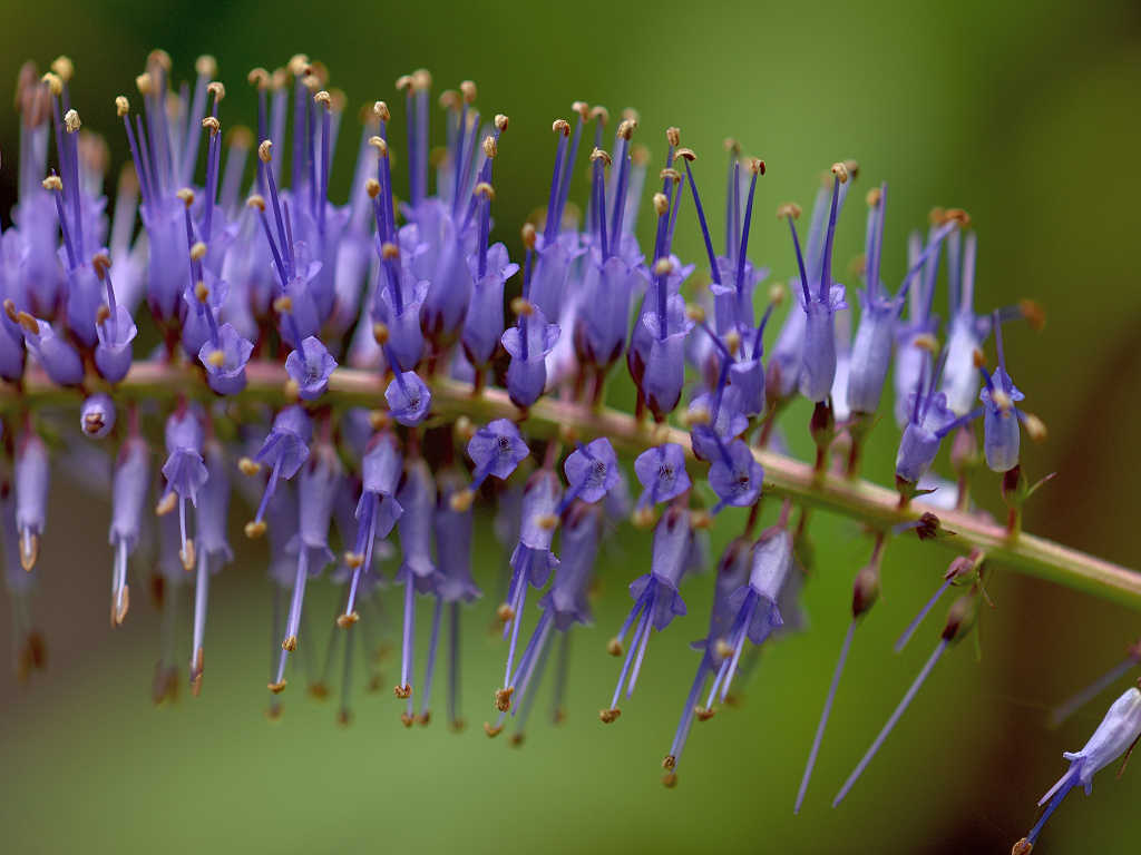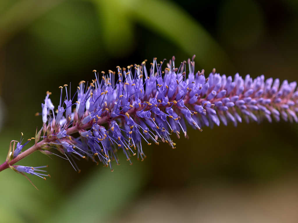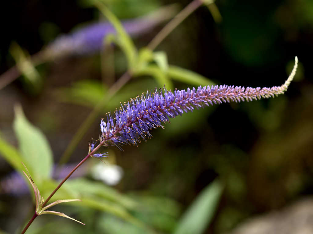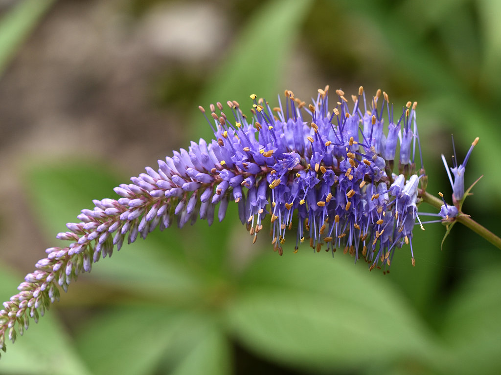 花は青紫のの筒形 花の先は浅く4裂 雄しべが2本花から突き出る これらの花が多数円錐状に集合する