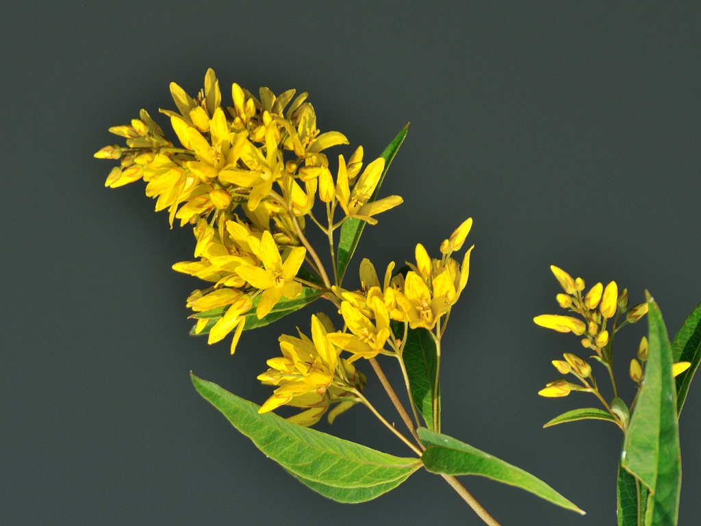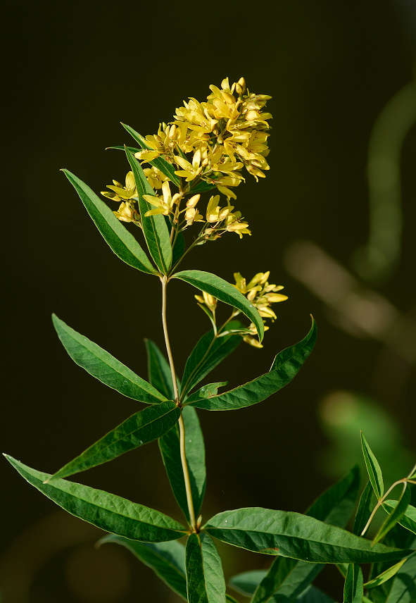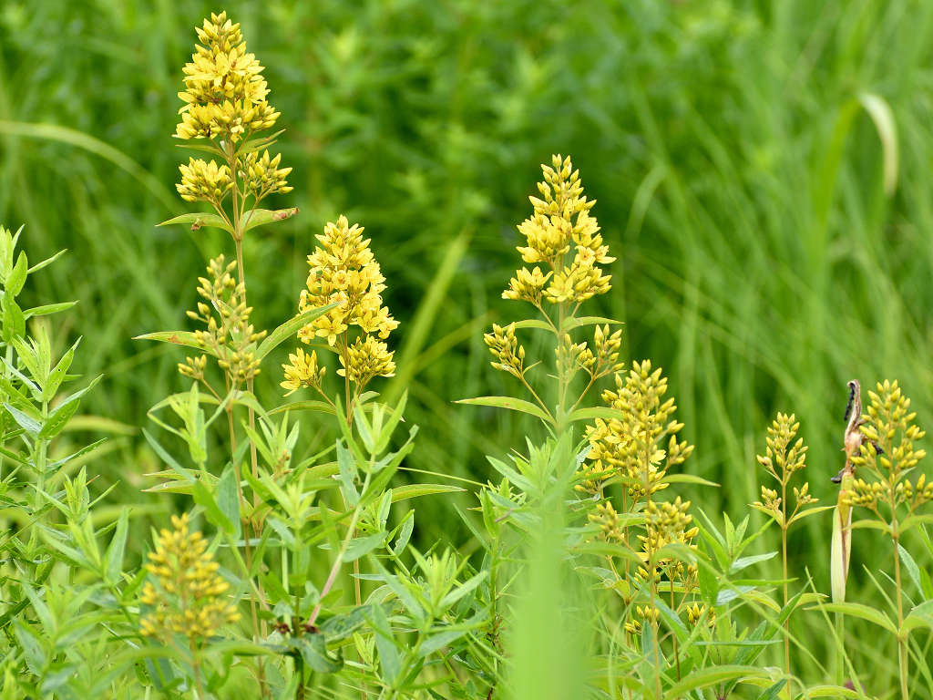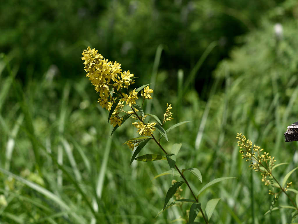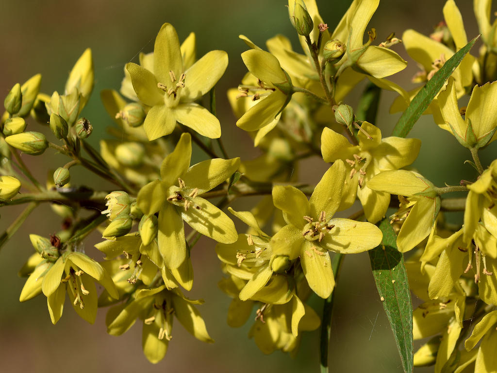 黄色い5弁の花に見えるが下でつながっている合弁花 葉は笹の葉形が3-4枚輪生する