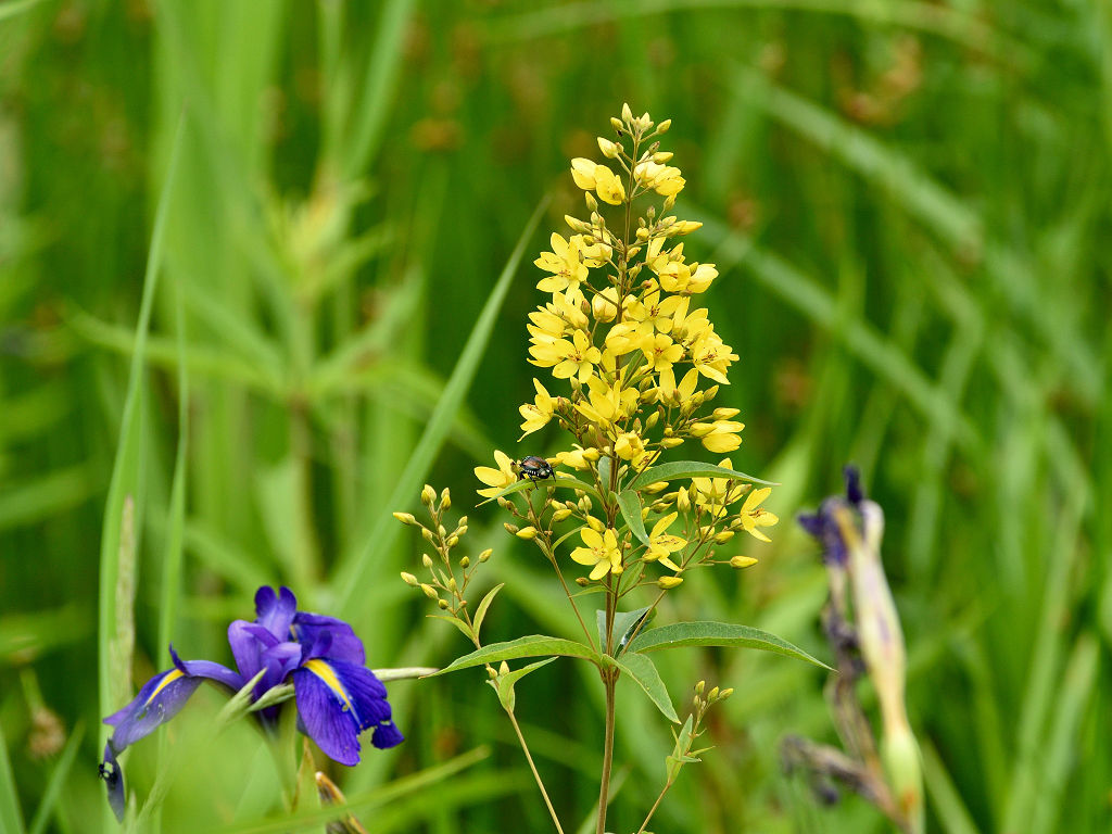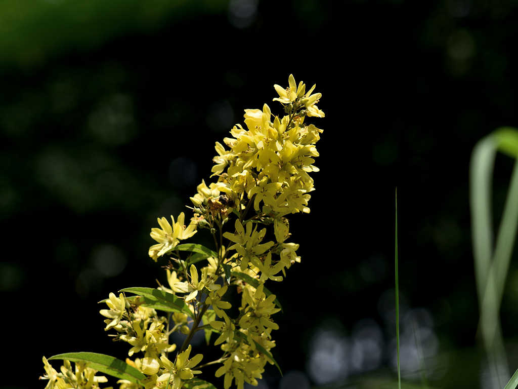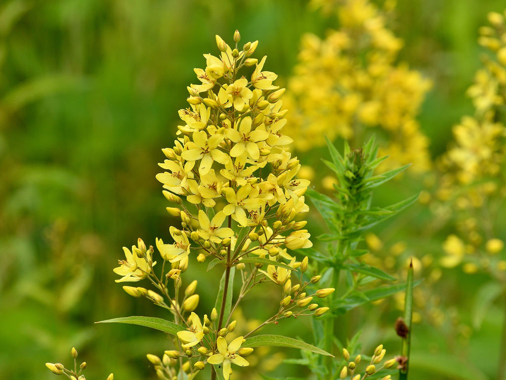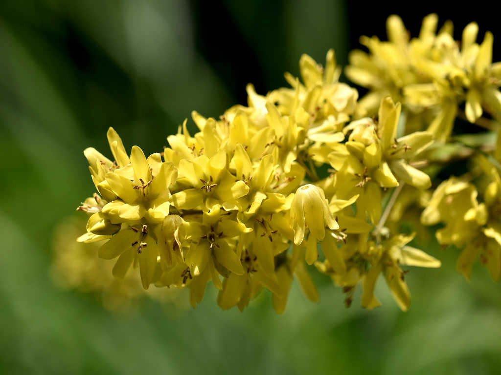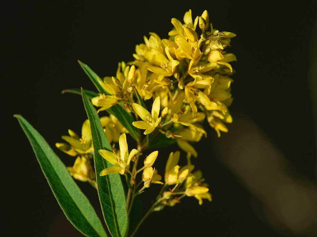 黄色い5弁の花に見えるが下でつながっている合弁花 葉は笹の葉形が3-4枚輪生する