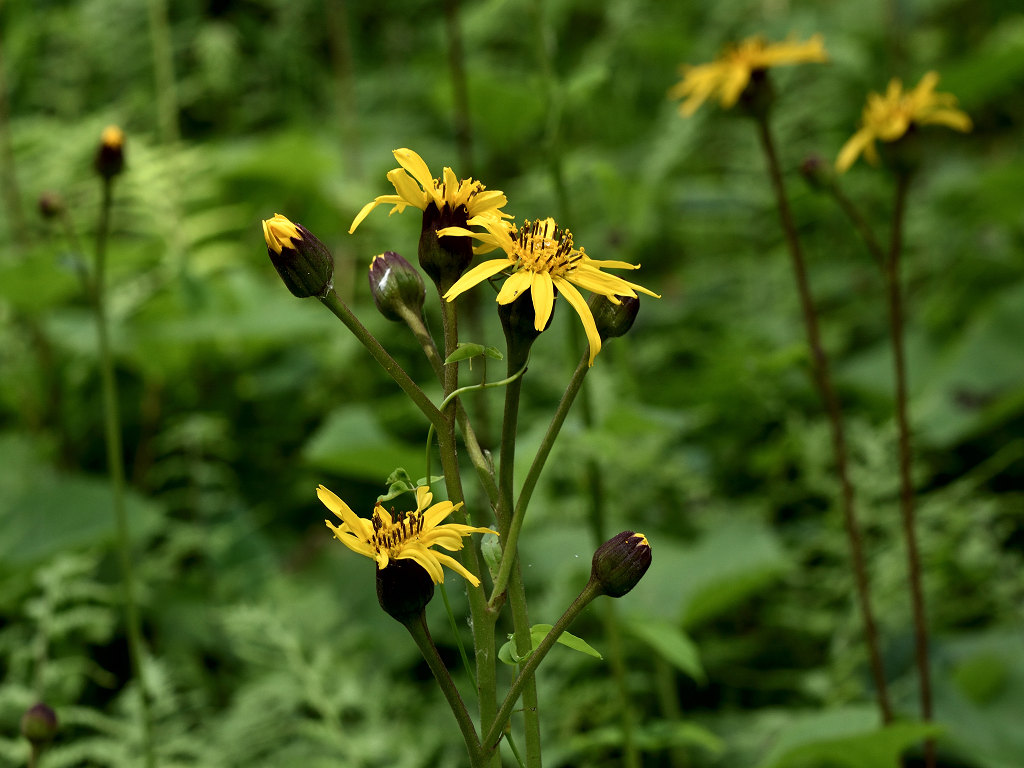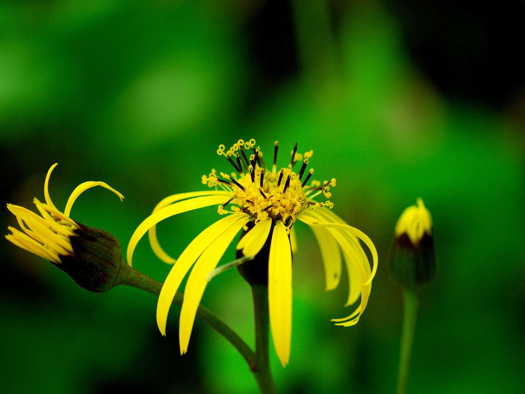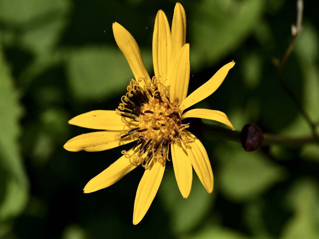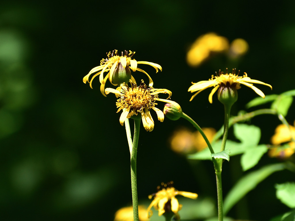 花は茎の上部で分かれて咲く 黄色い花が咲き花弁は10−15枚 中央は筒状花の集合体