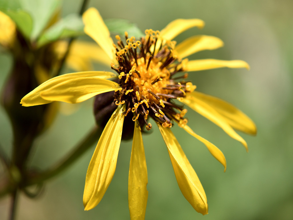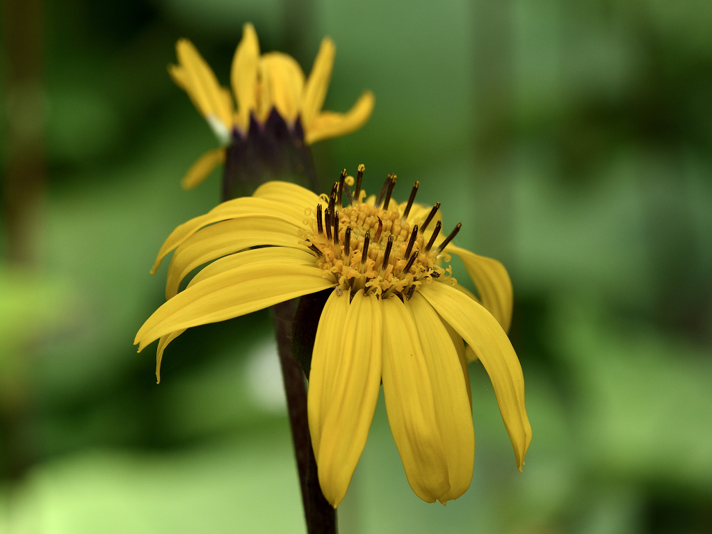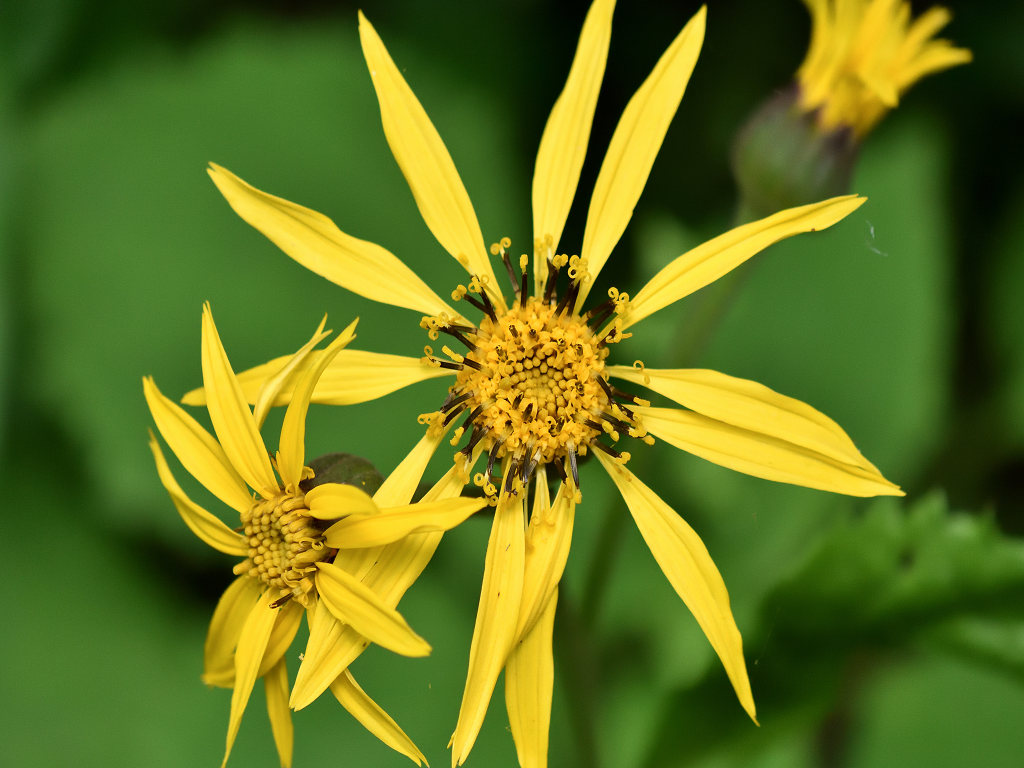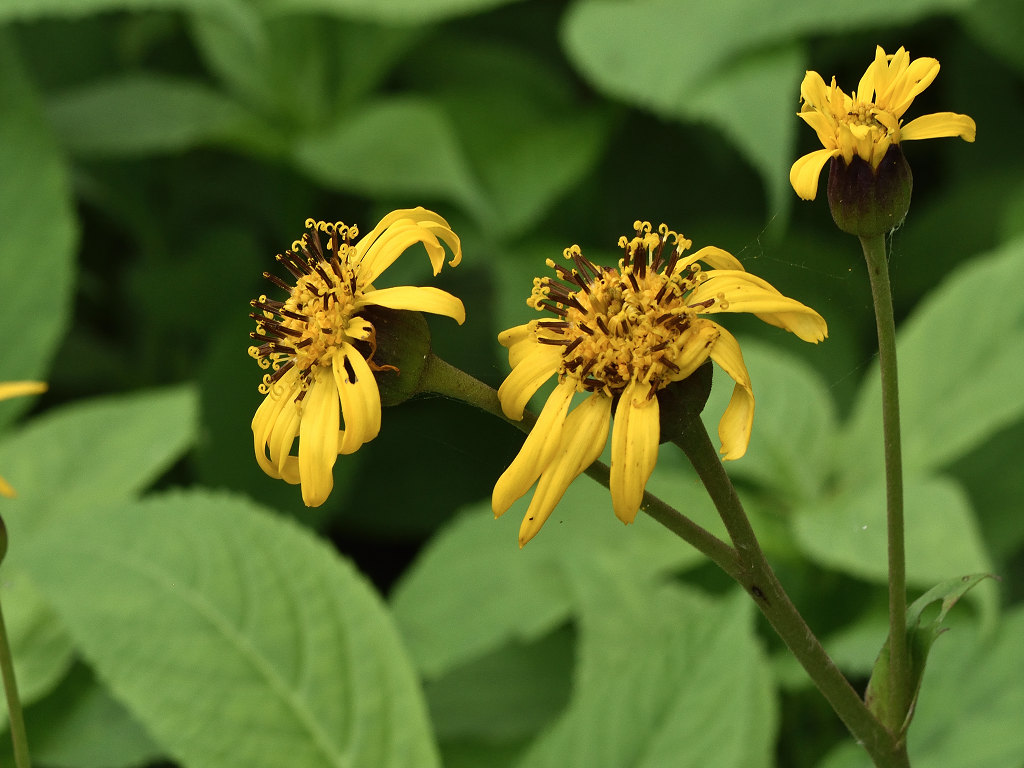 花は茎の上部で分かれて咲く 黄色い花が咲き花弁は10−15枚 中央は筒状花の集合体