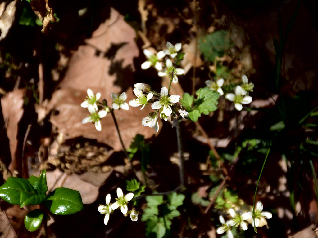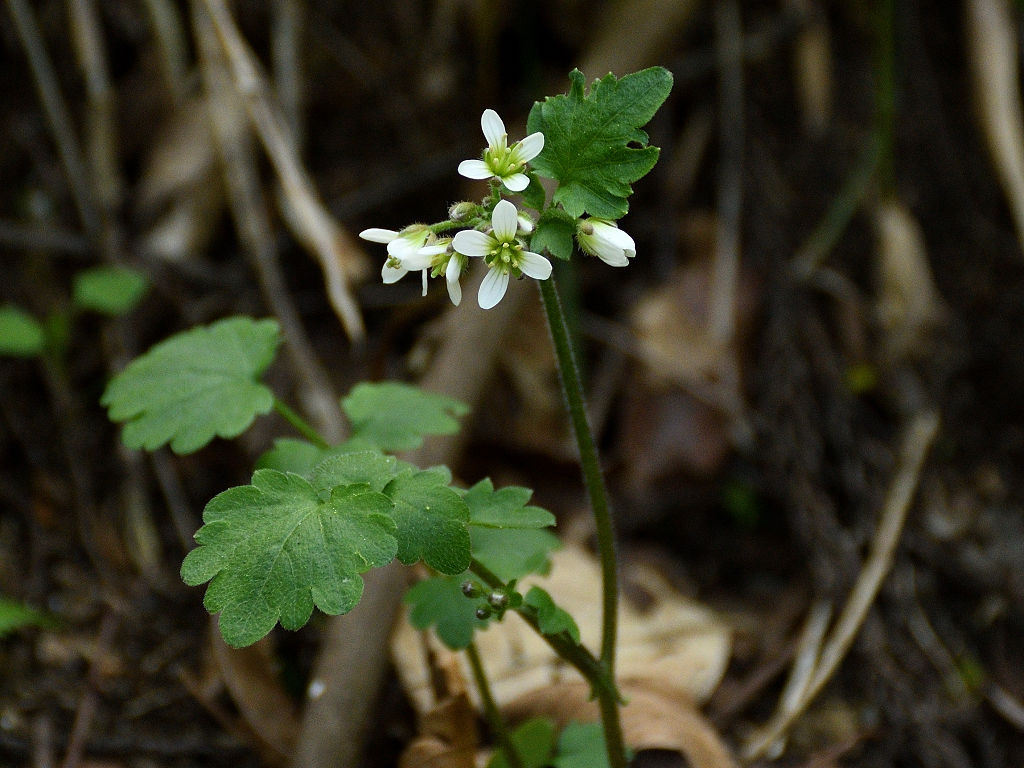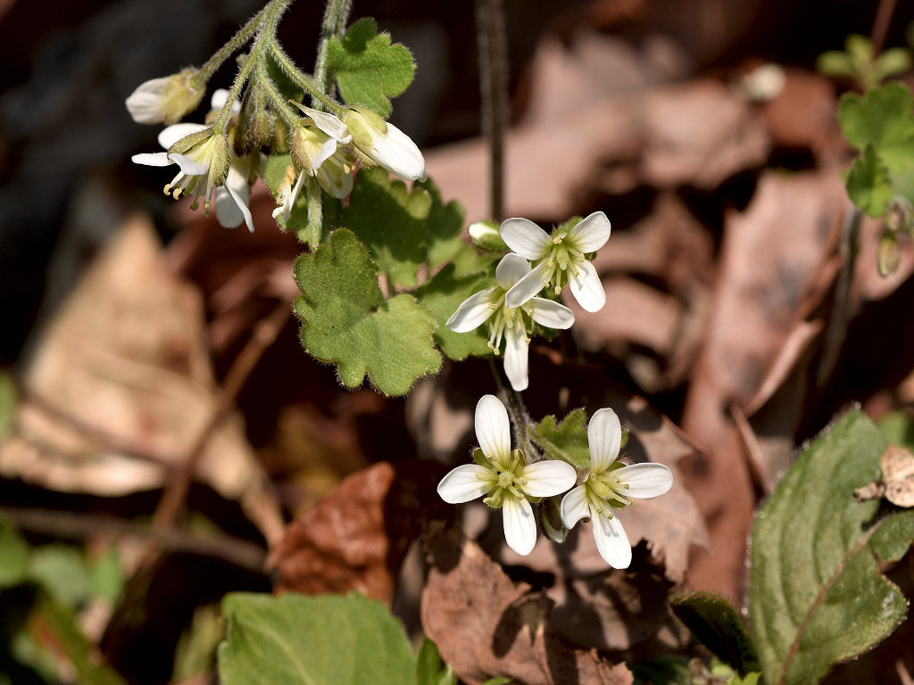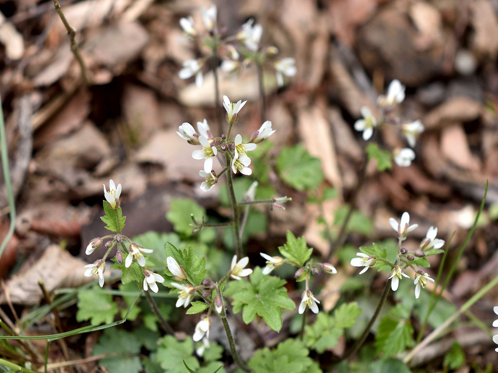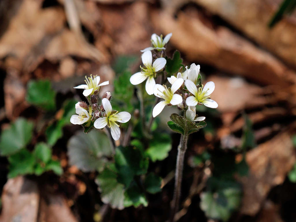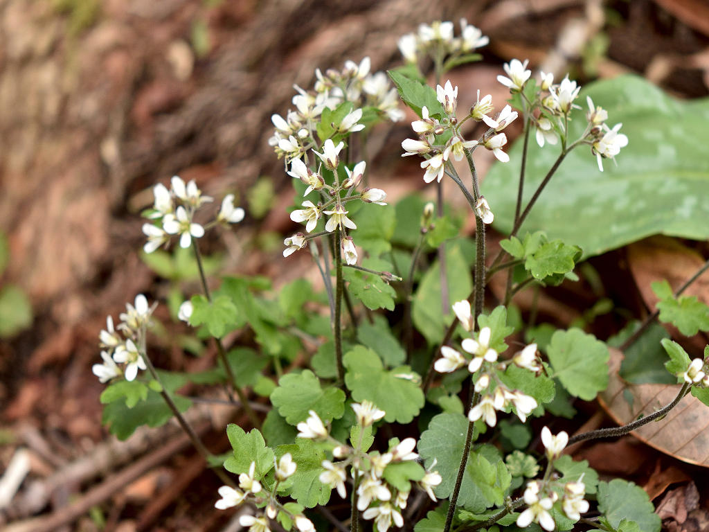 花弁は4枚の白い花 ガクも4枚 茎は途中で枝別れし、長い葉柄の先に3−7枚の丸い木葉を付ける