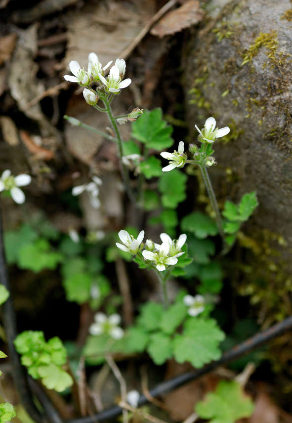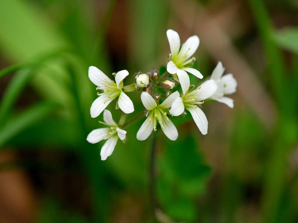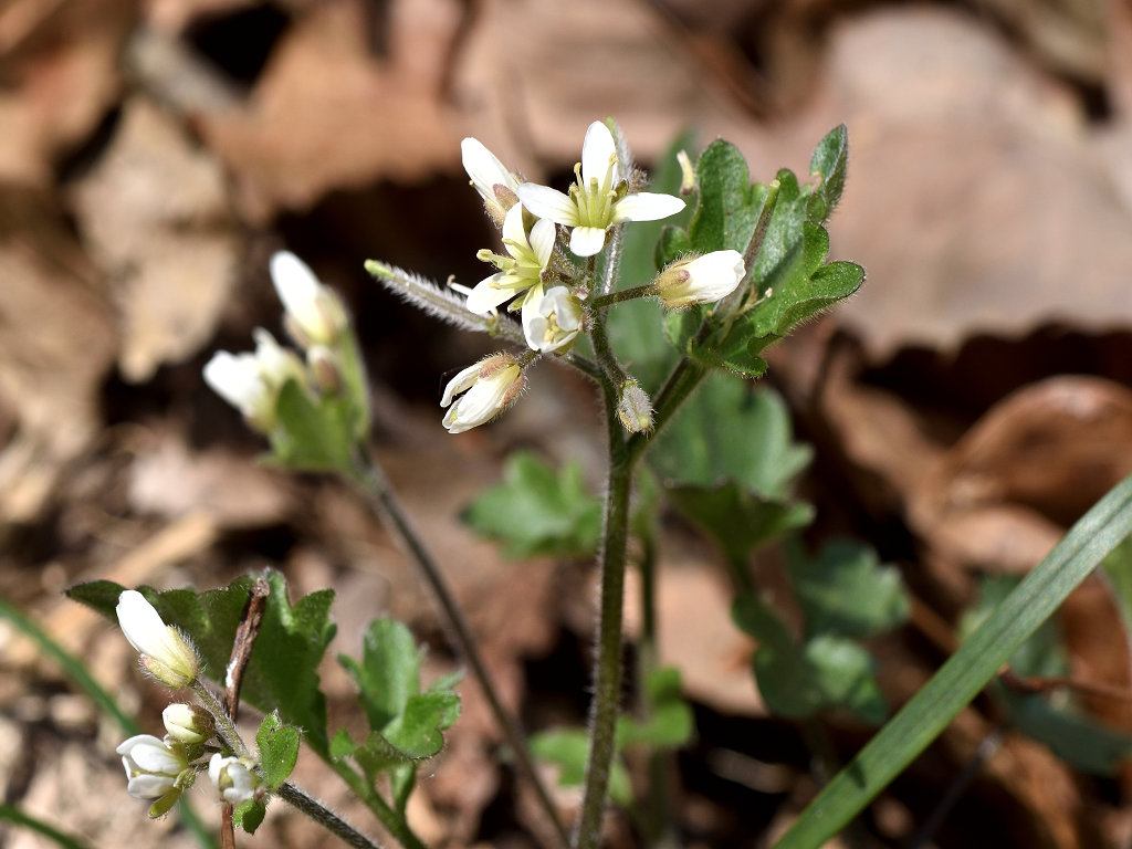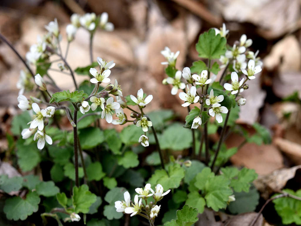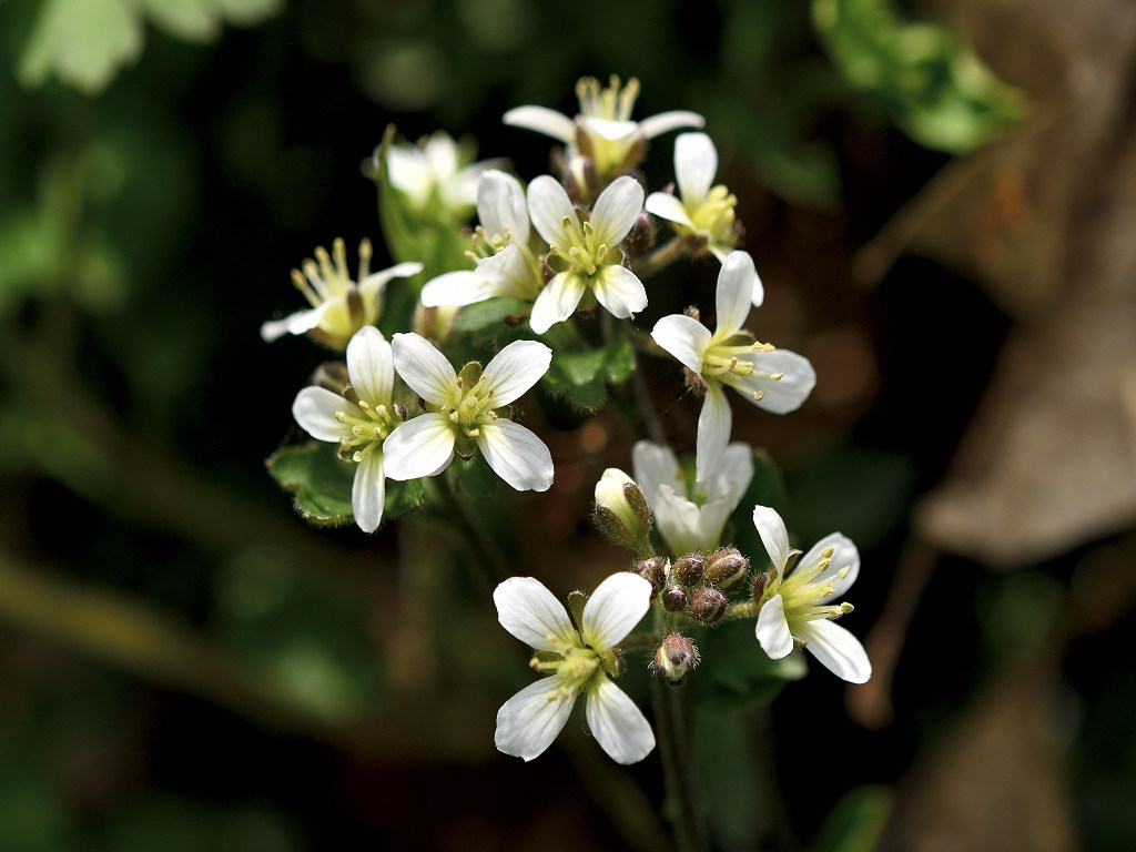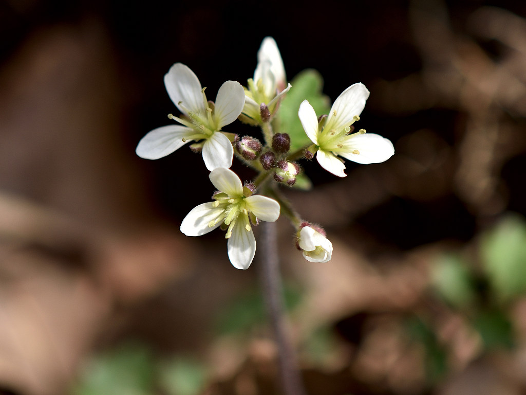 花弁は4枚の白い花 ガクも4枚 茎は途中で枝別れし、長い葉柄の先に3−7枚の丸い木葉を付ける