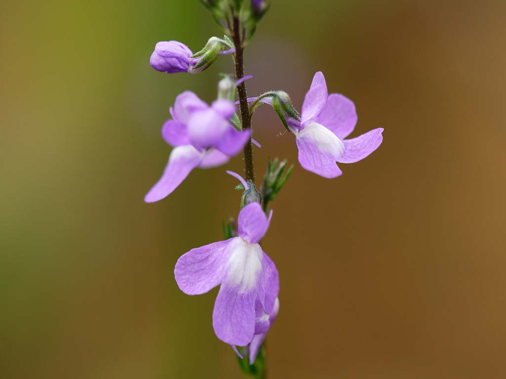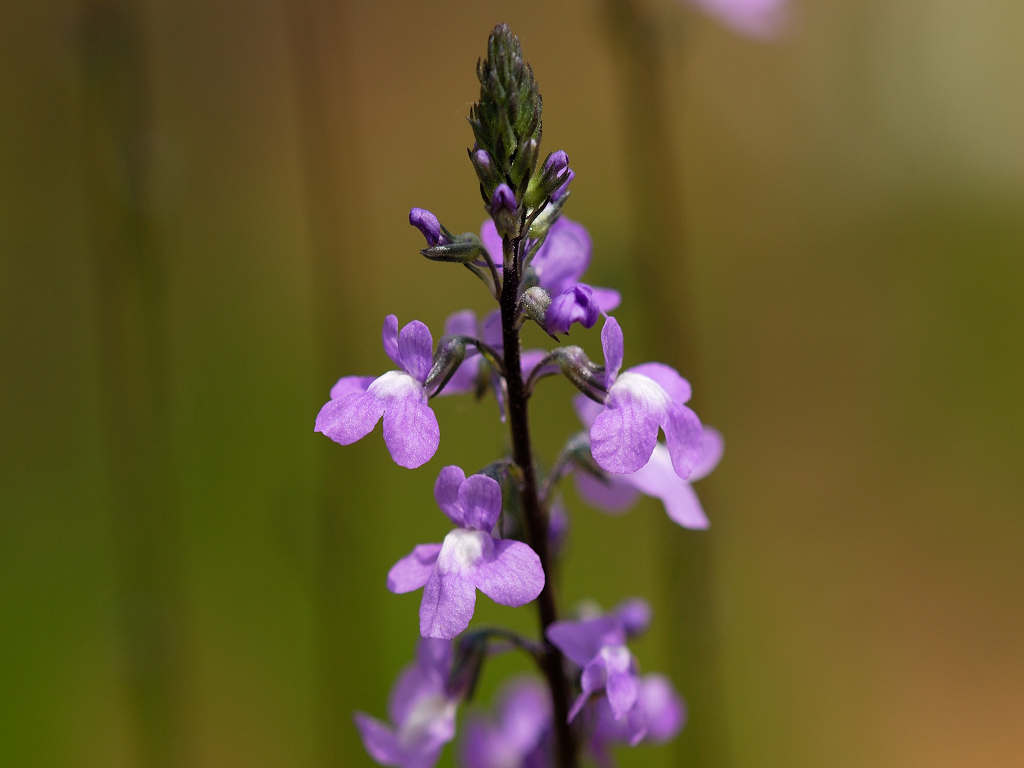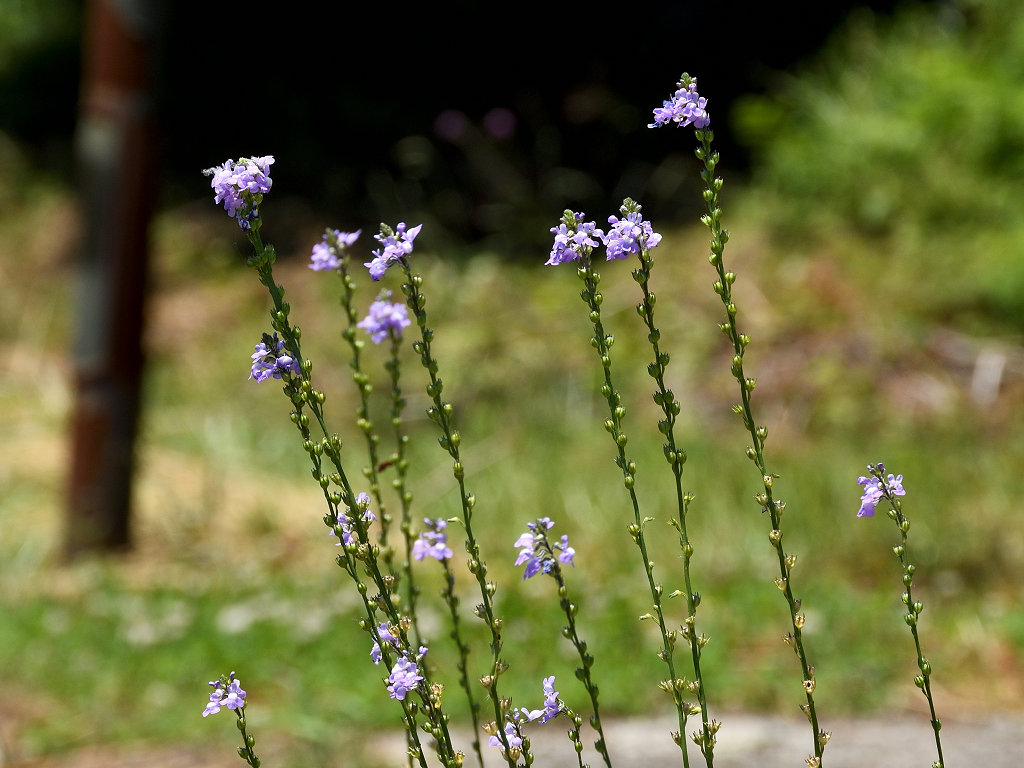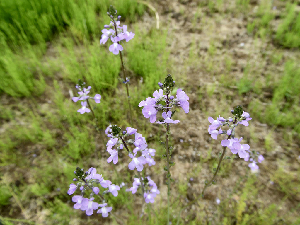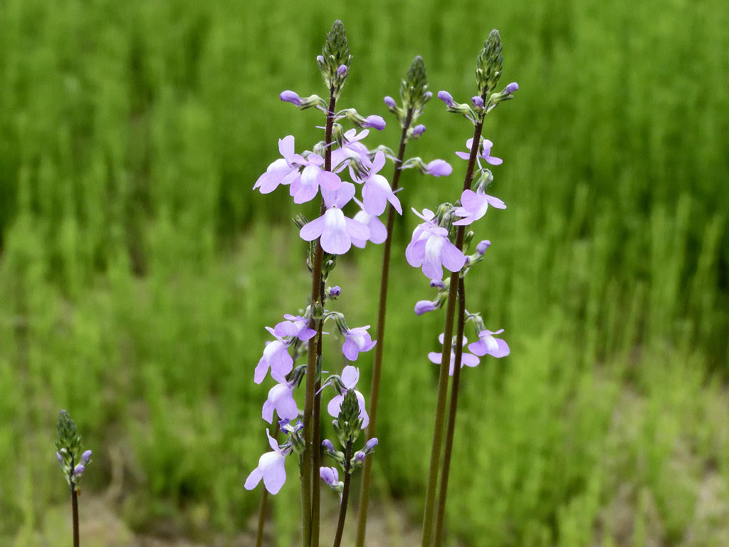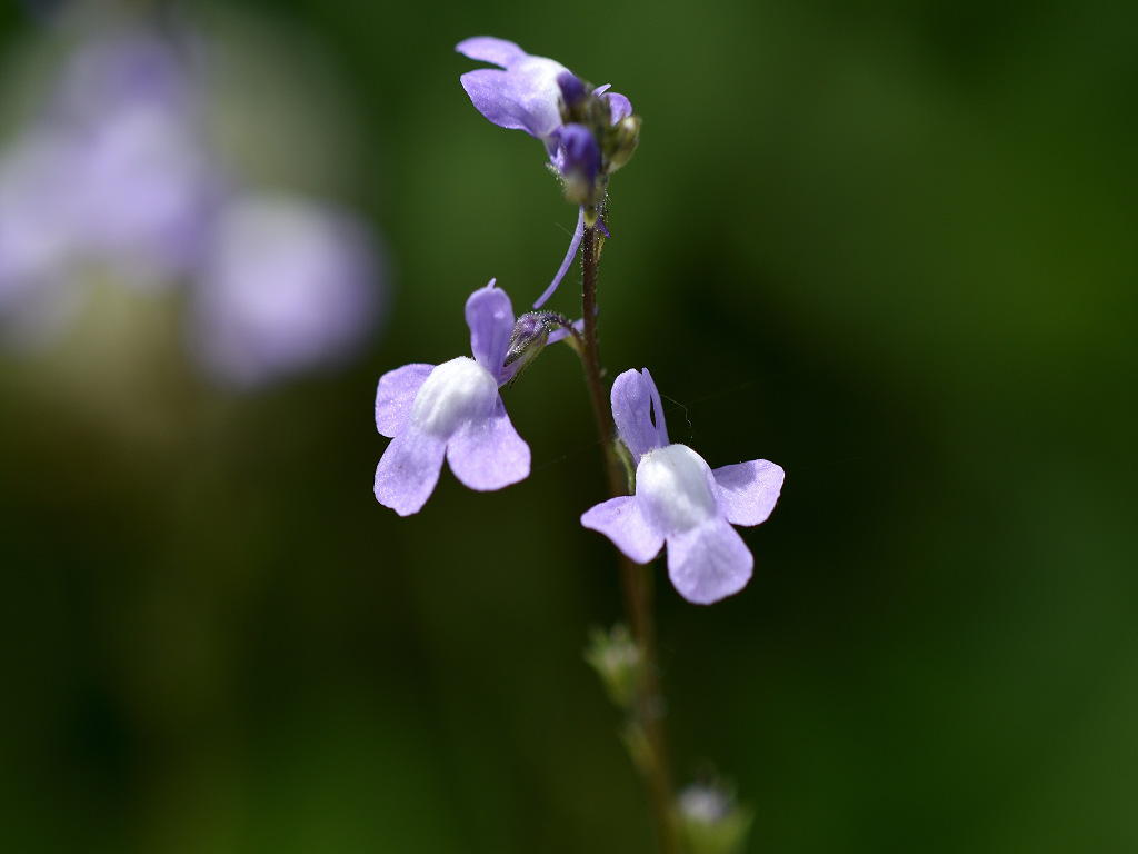 茎の上部に花が付く 花は唇形で下の唇が大きい 下唇は3っつに裂け中央部が真っ白で盛り上がる 尻尾のような距が付く