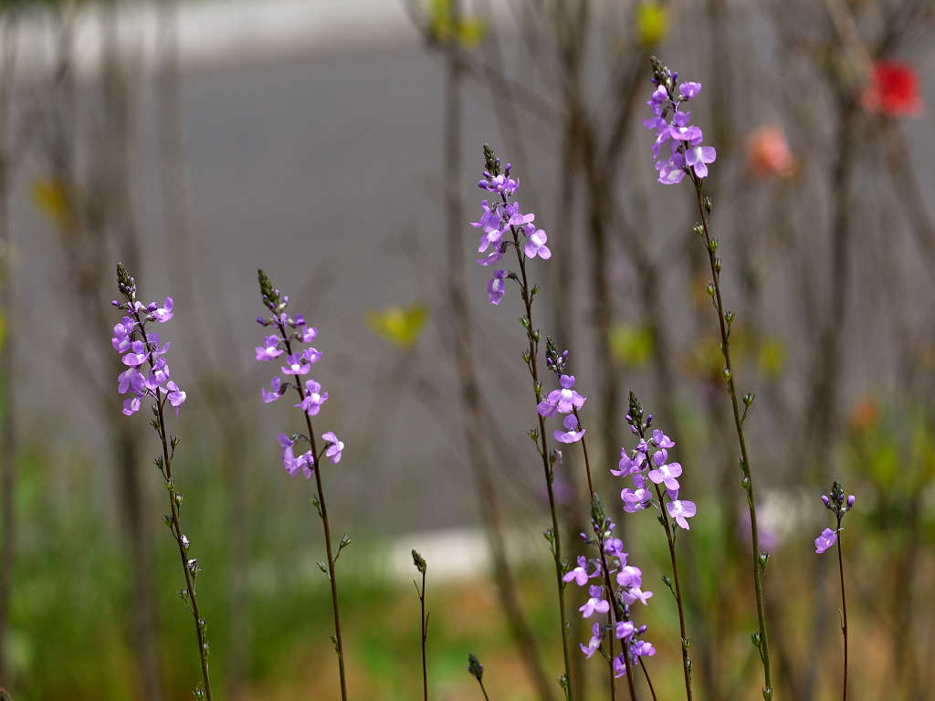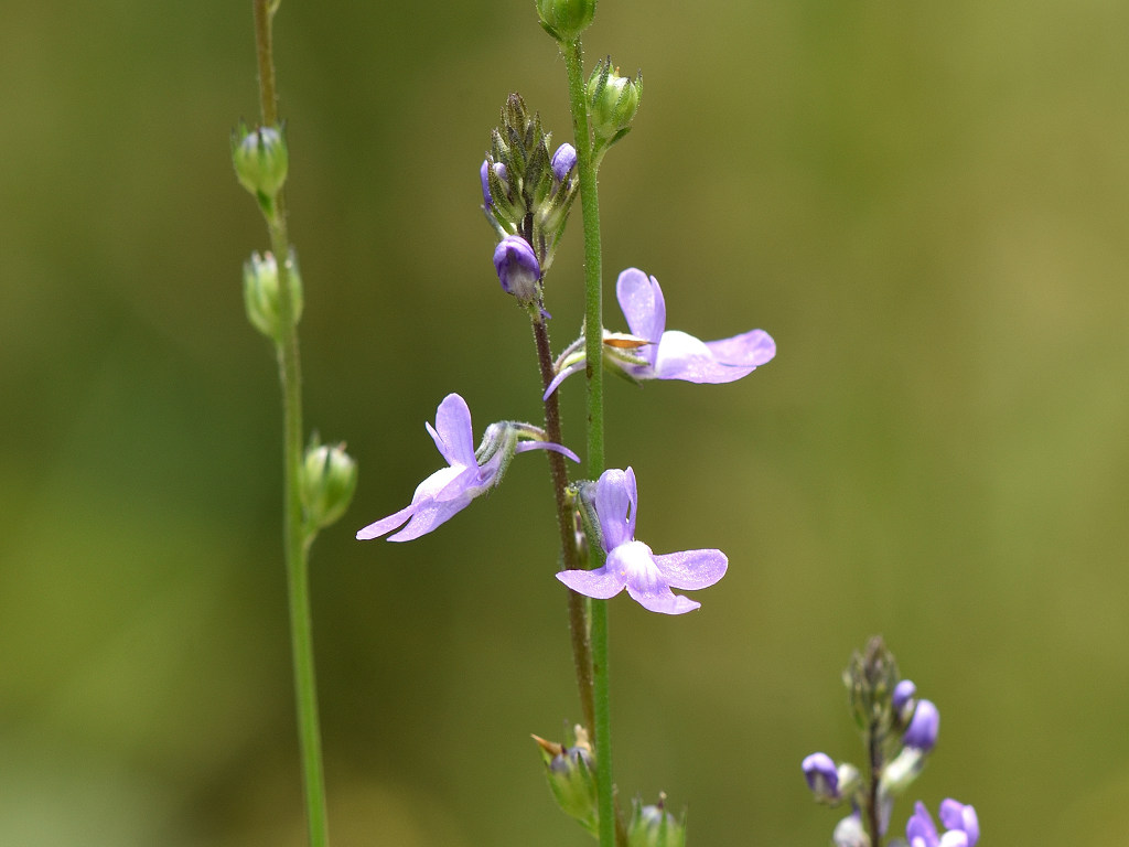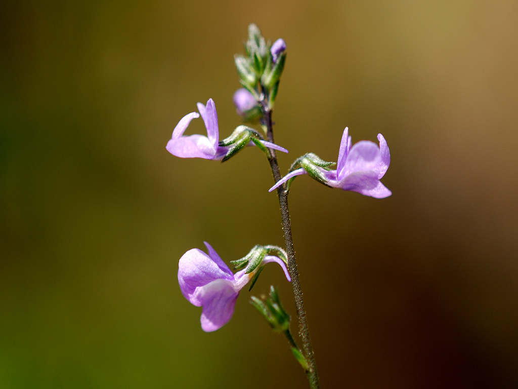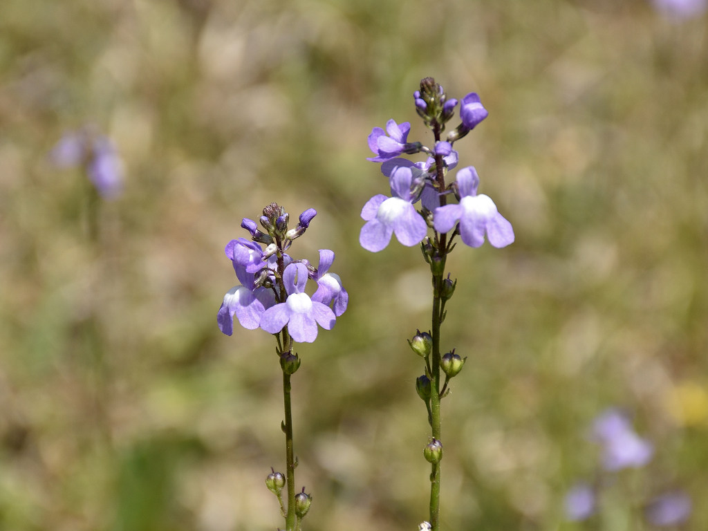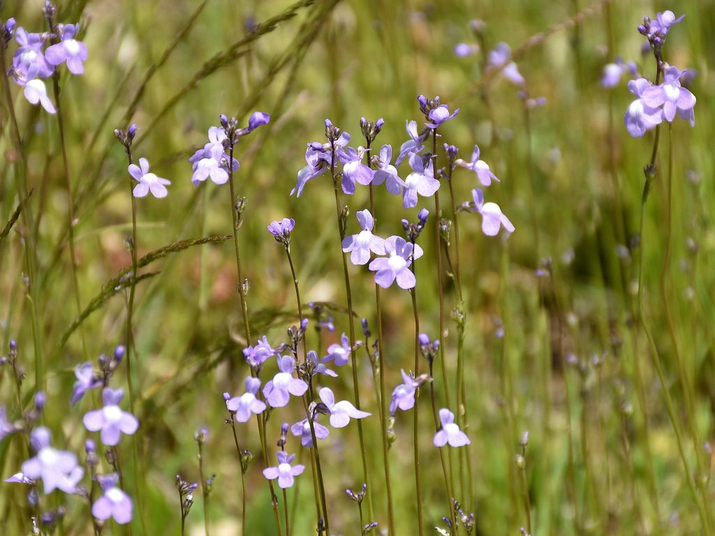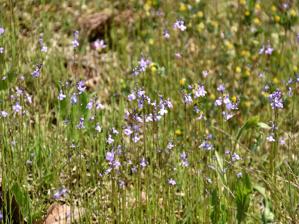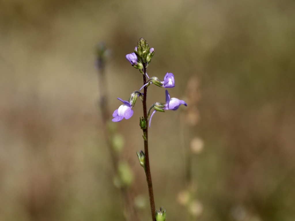 茎の上部に花が付く 花は唇形で下の唇が大きい 下唇は3っつに裂け中央部が真っ白で盛り上がる 尻尾のような距が付く