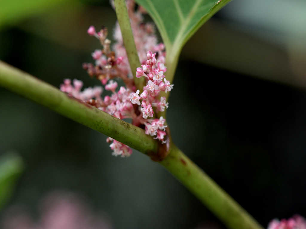 紅色を帯びた小さな花を穂状にたくさんつける 雌雄異株 雄花は漏斗形で先が5つに裂け、花粉が見える。雌花は先が5つに裂け、中に3本の花柱(雌しべ)が見える