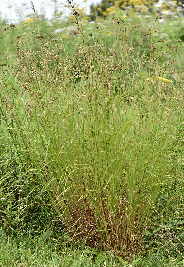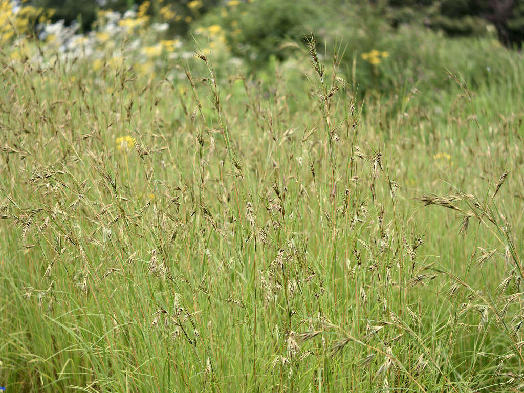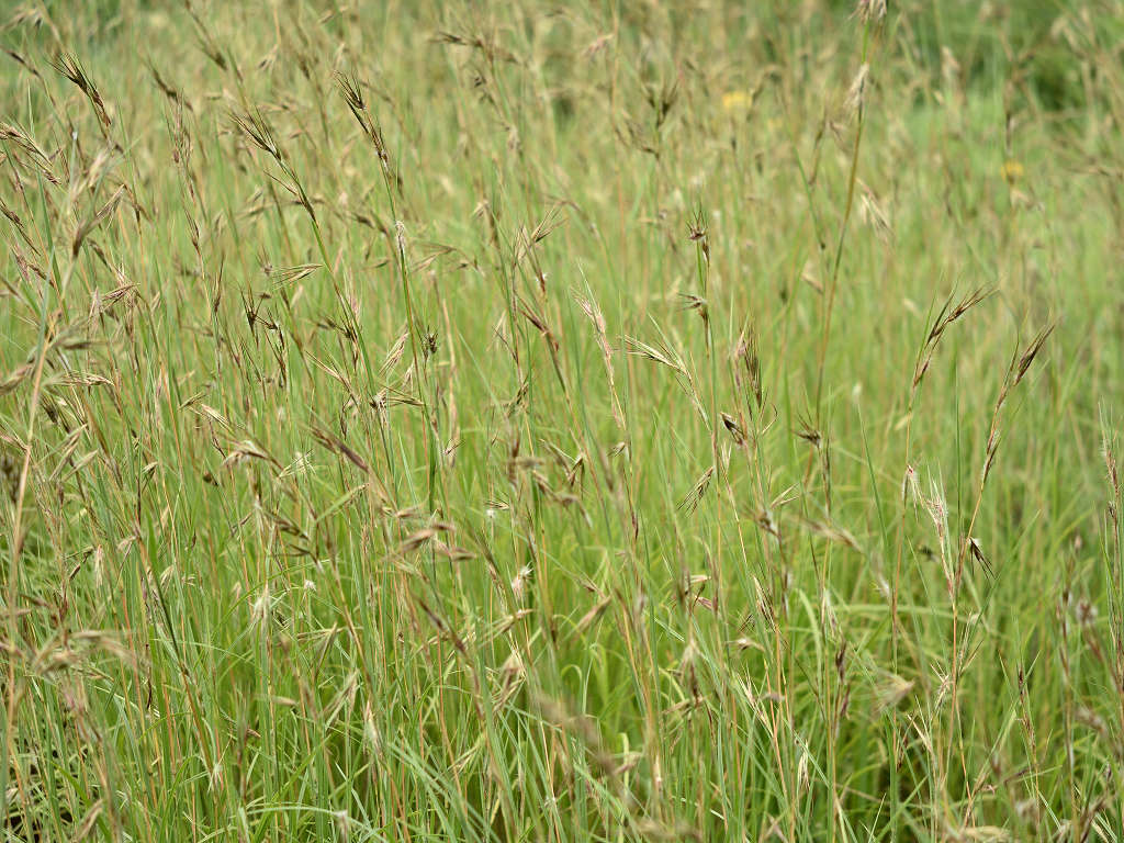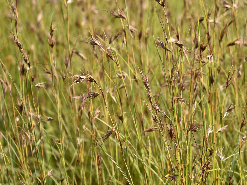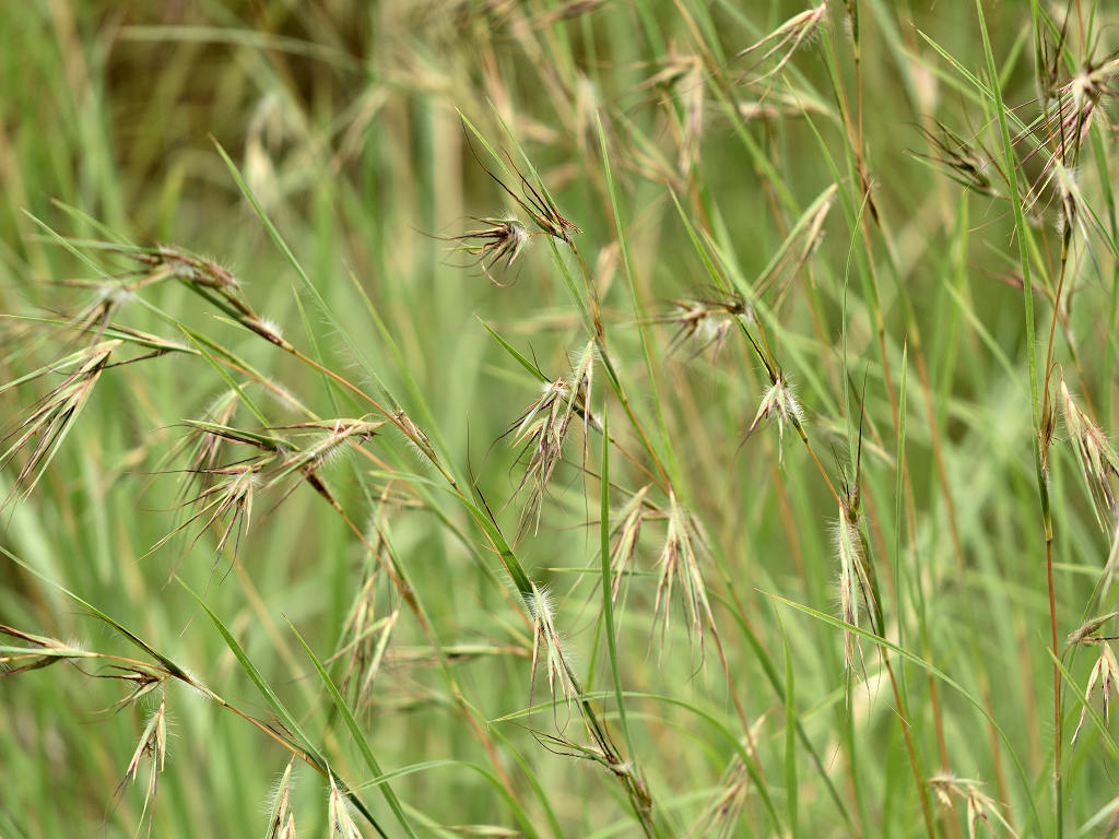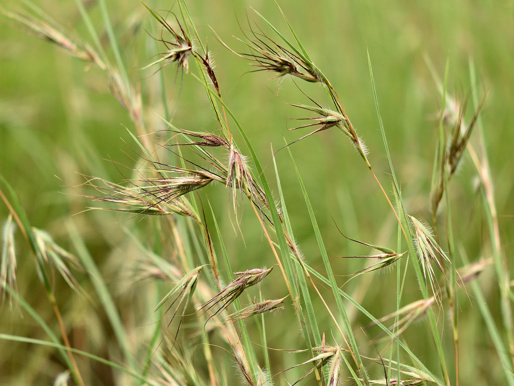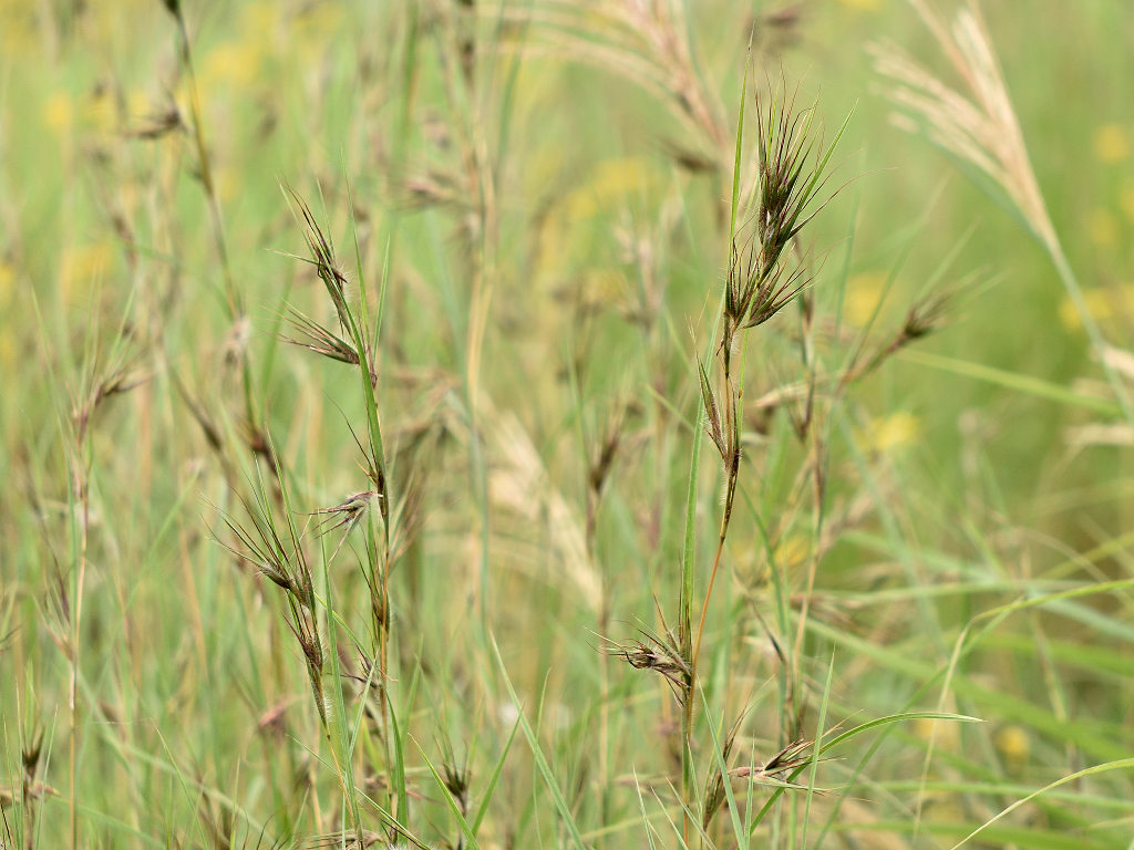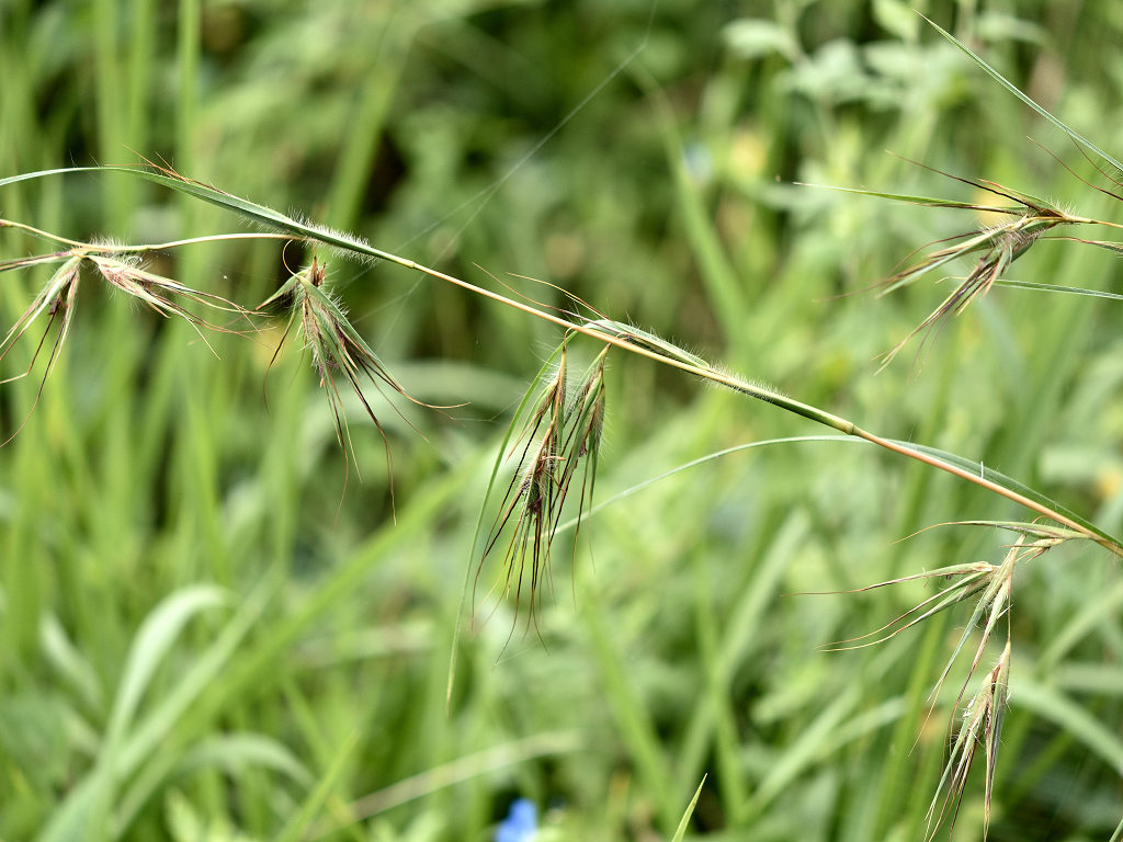 上部の葉腋から短い枝をだし、6個の小穂が集まった穂を出し、小穂は結実すると太い褐色の芒がある