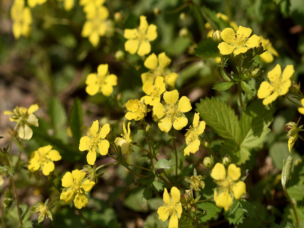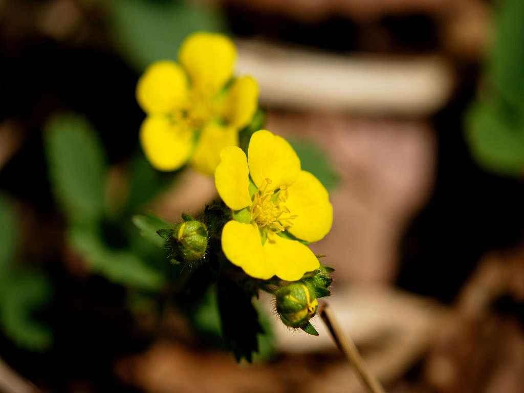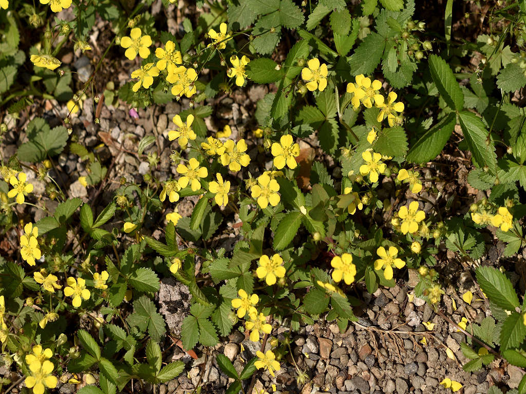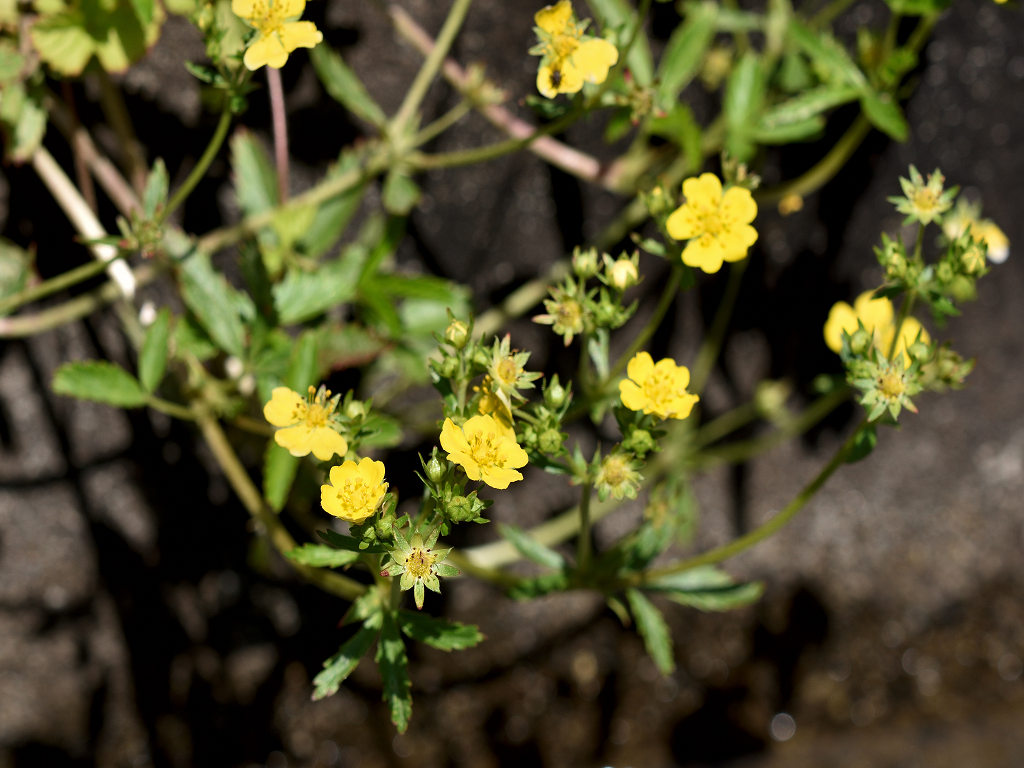 花径は5−10p 途中に小さな葉が付く 上部で枝別れし5弁の黄色い花を付ける