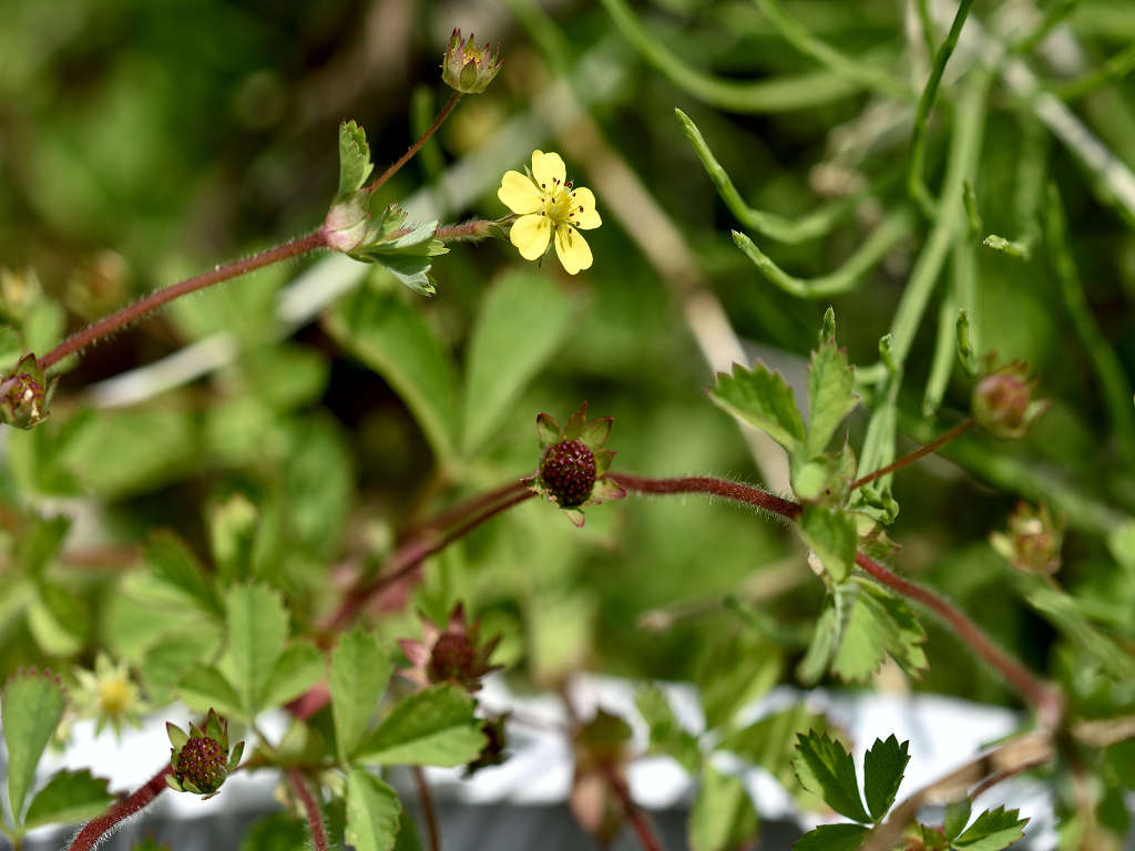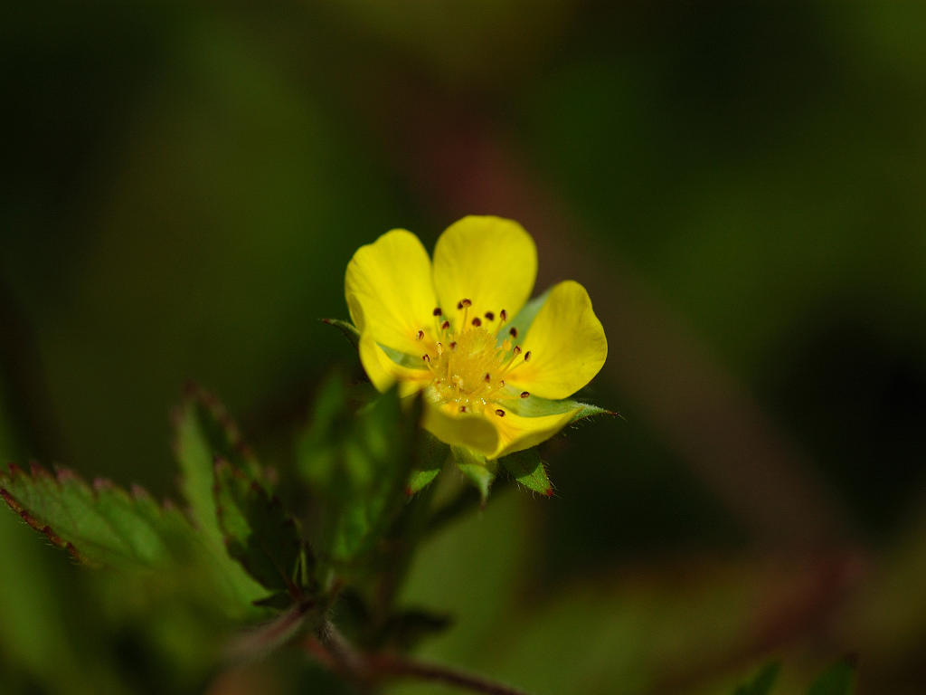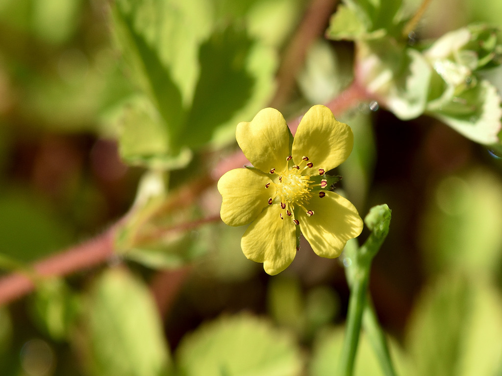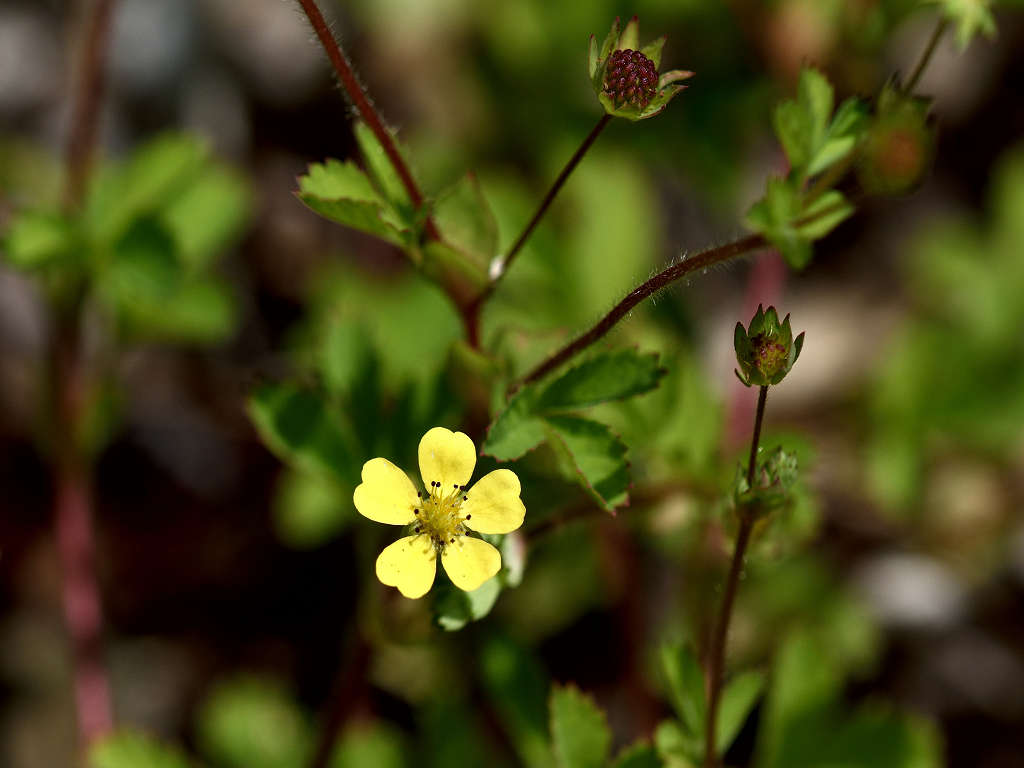 茎は所々枝別れしその上部で花柄を伸ばし1つずつ花を付ける 黄色い花の花弁は5枚 花弁と花弁との隙間に尖ったガクが見える