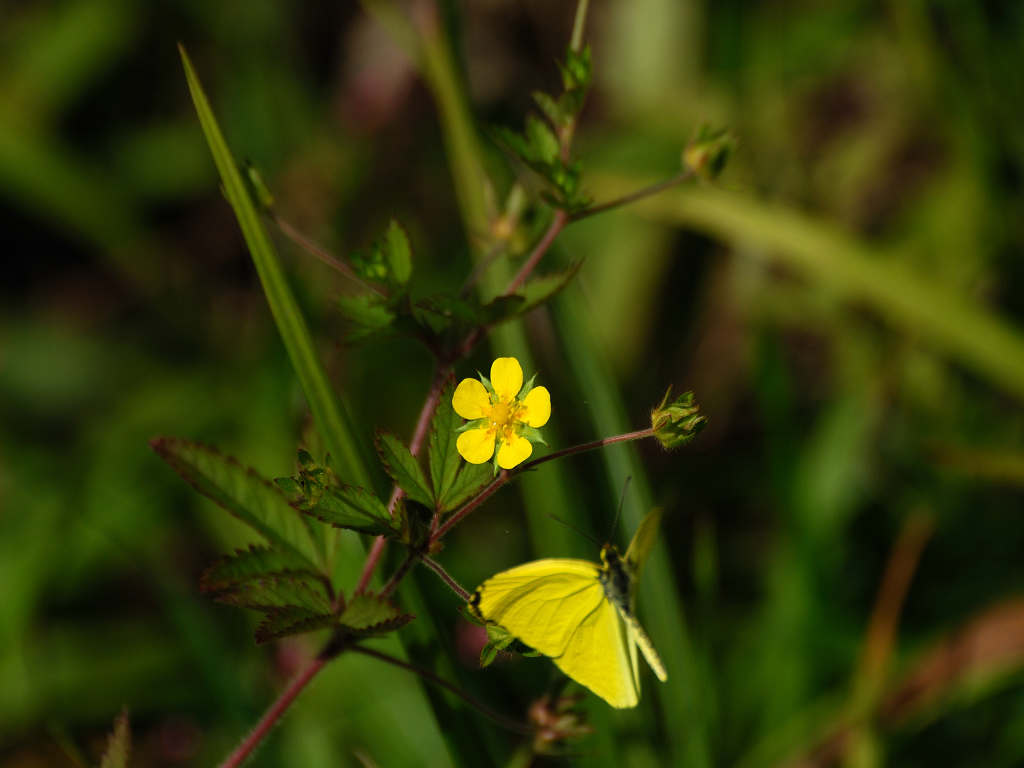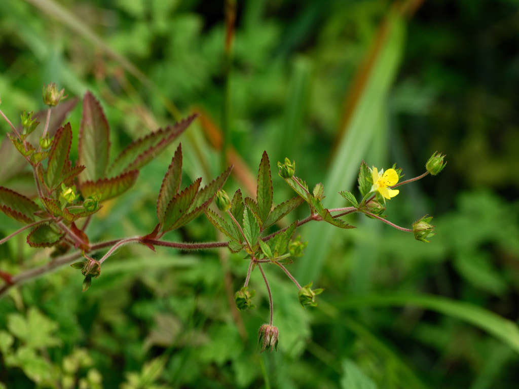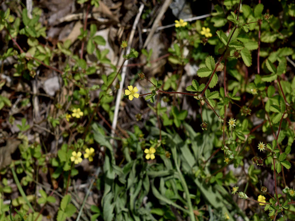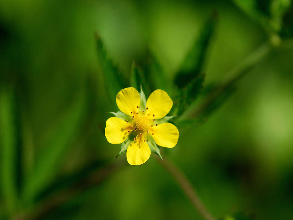 茎は所々枝別れしその上部で花柄を伸ばし1つずつ花を付ける 黄色い花の花弁は5枚 花弁と花弁との隙間に尖ったガクが見える