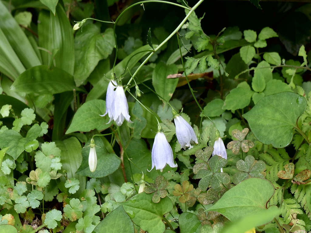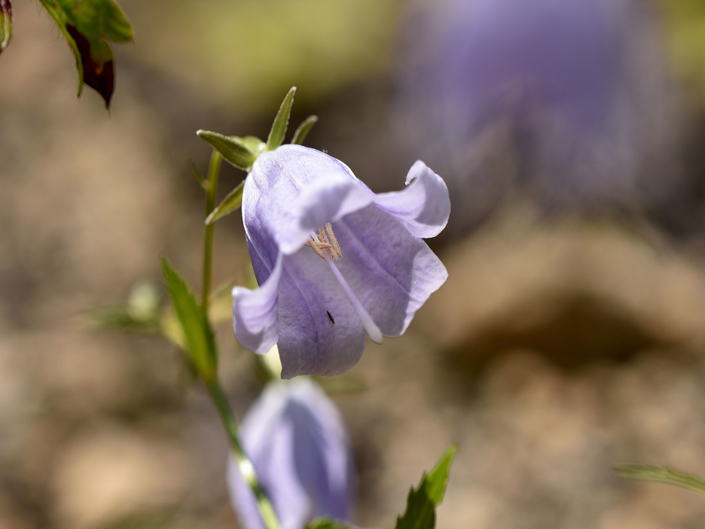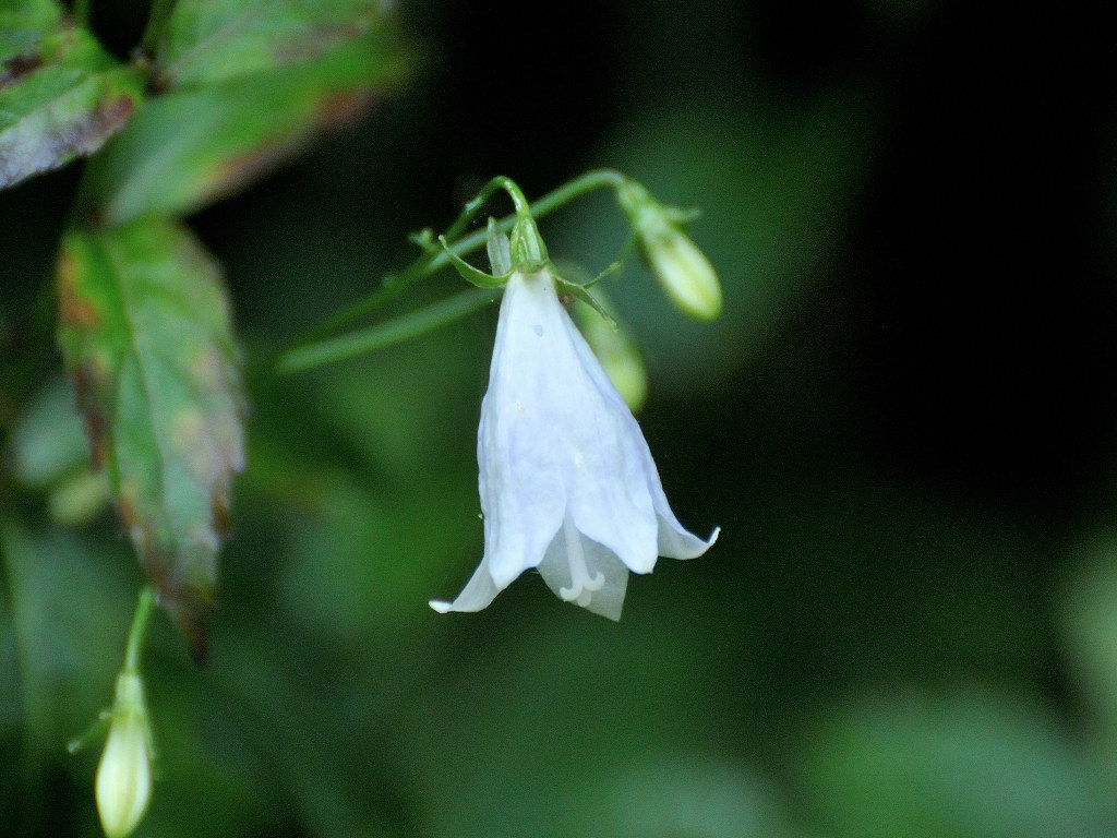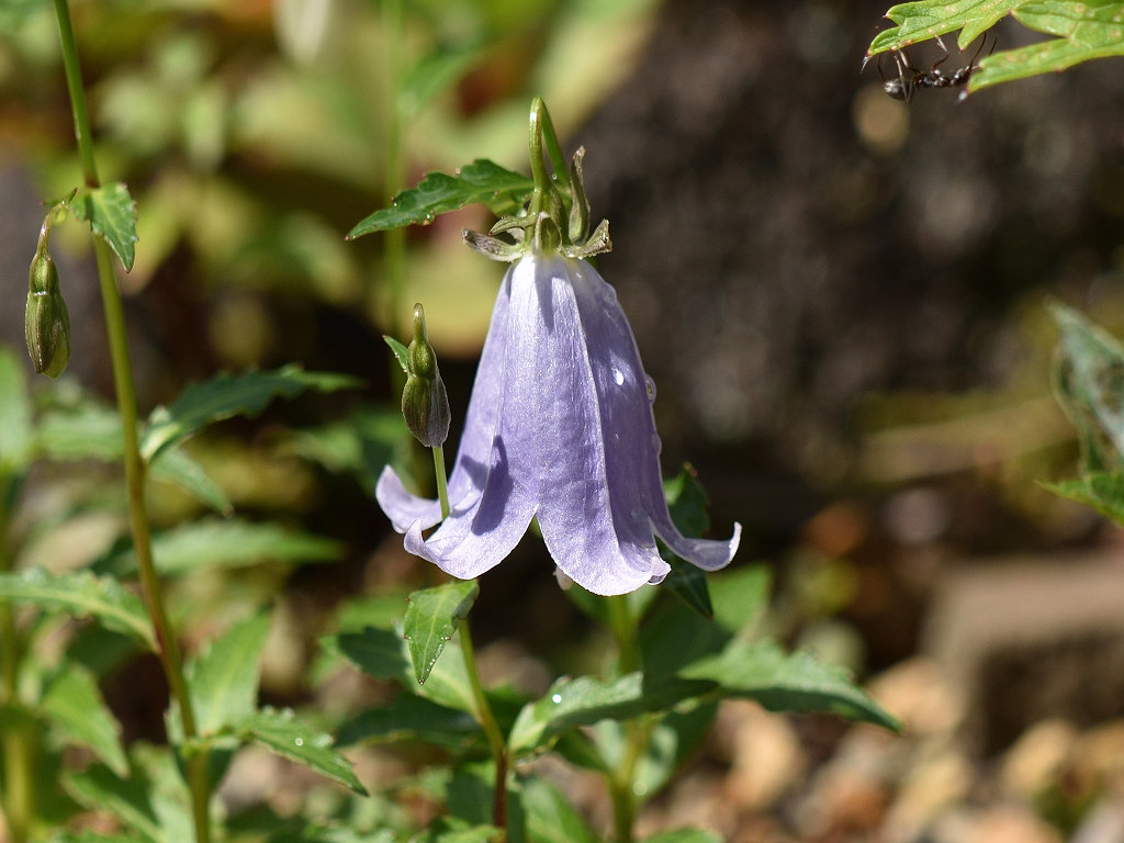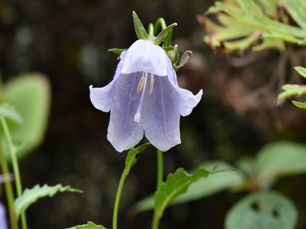 釣り鐘型の花です。萼片に鋸歯がない 茎の先に一つだけ花をつけ、おしべの先が花ビラから飛び出す
