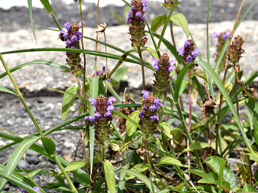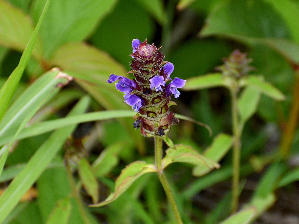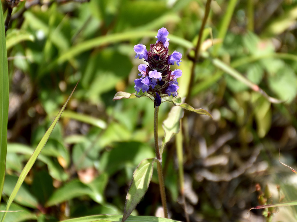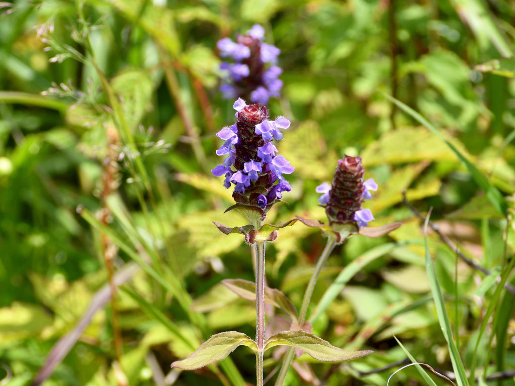 ウツボグサより小型で、茎の基部から匍匐枝を出さない 葉に柄がある ウツボグサの頭はスゲ笠のように広がるが本種は上唇はかぶと状で広がらない