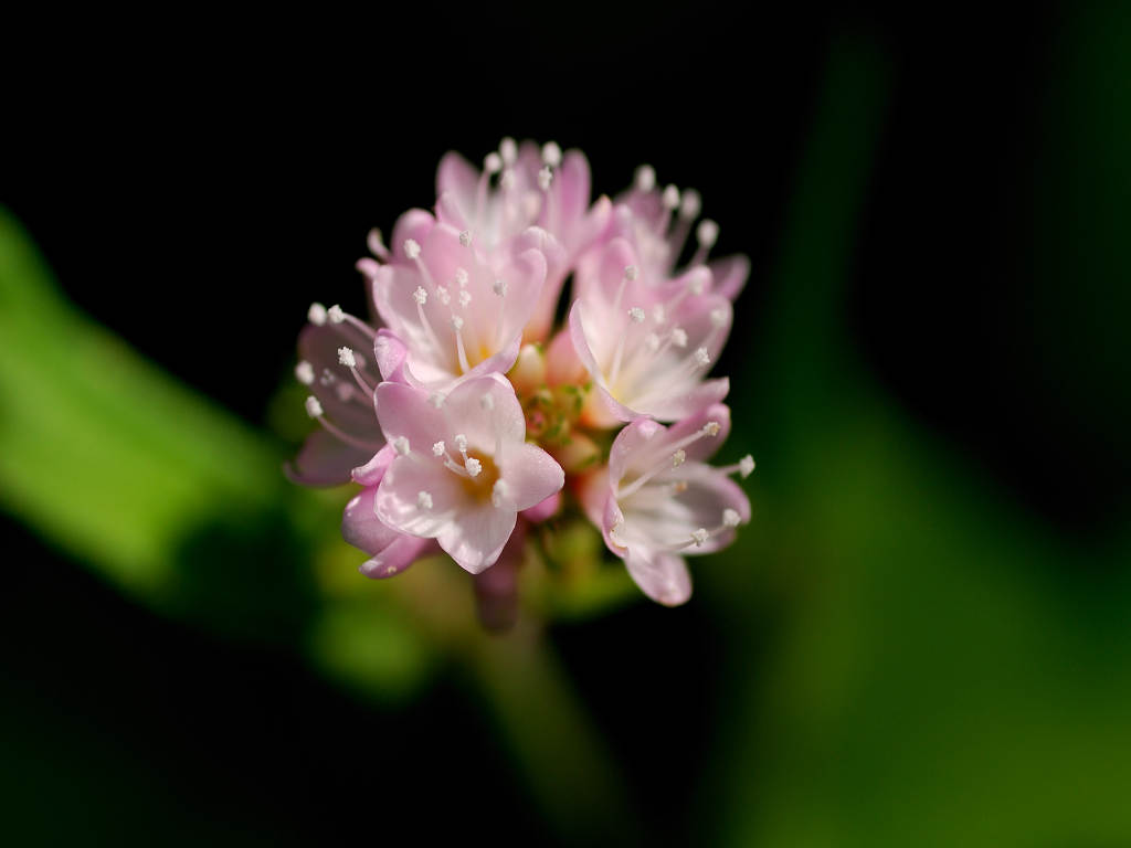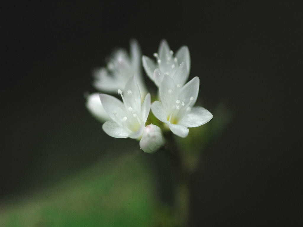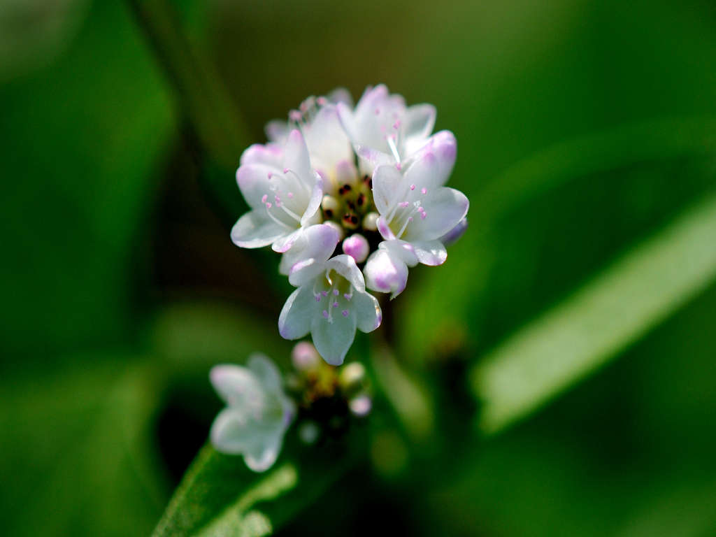 花は小さく、花弁状のガクが5裂 裂片の先は紅色がぼかし状に入っている