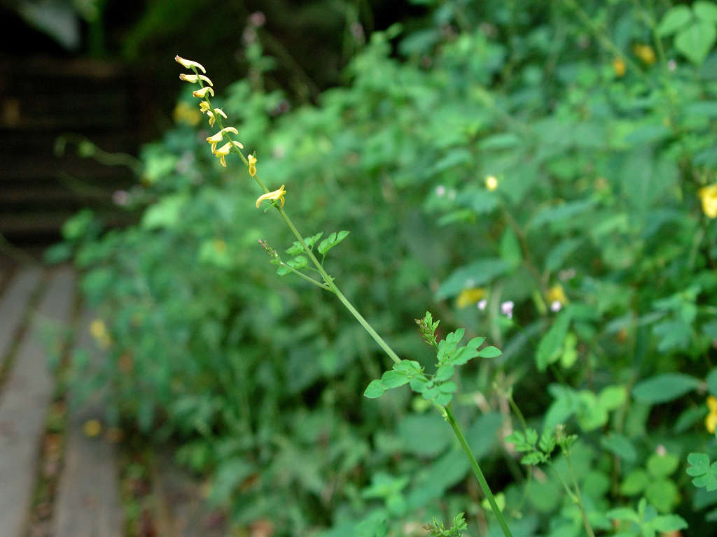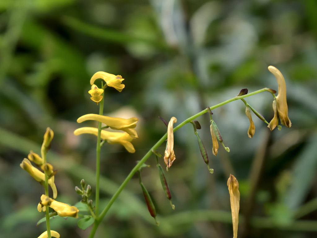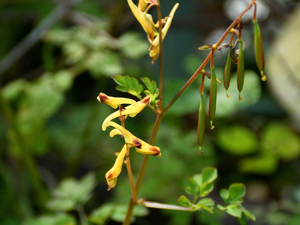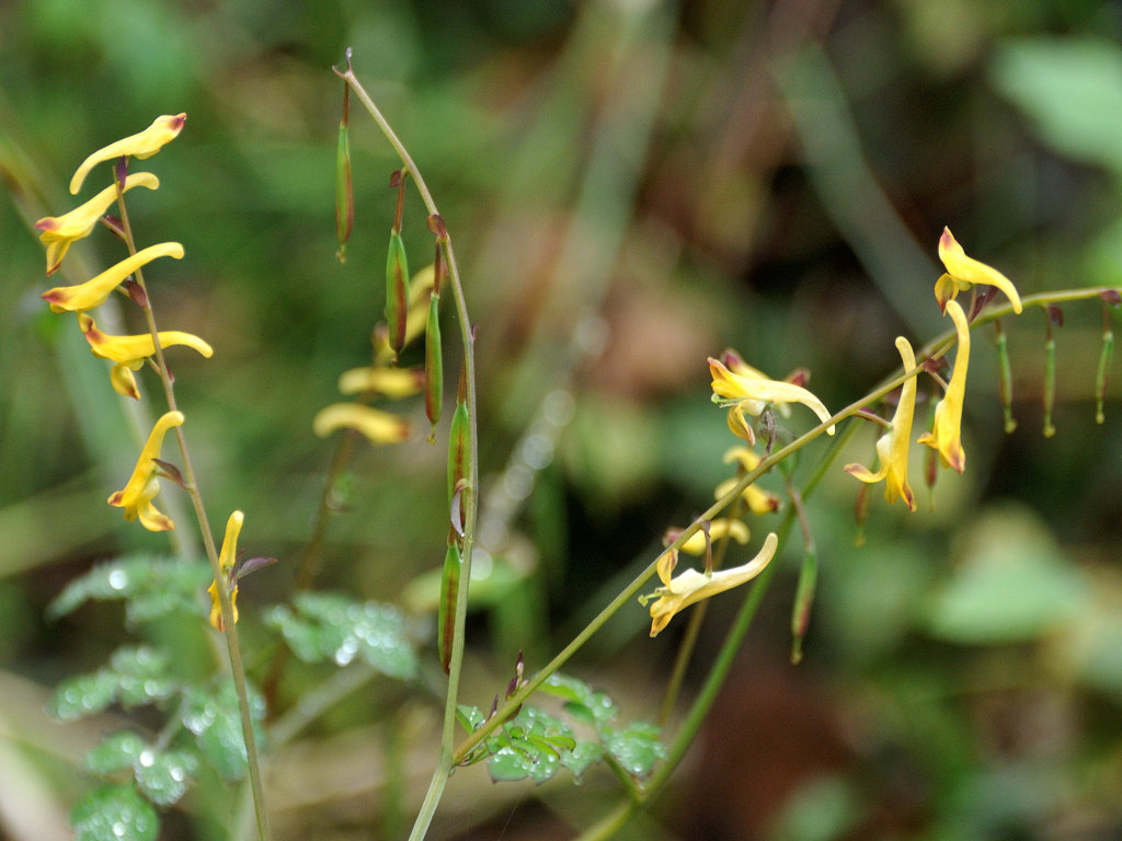 キケマン属で秋に咲く花 花姿が蔓性で、実が一列にやや長い実を付けるので「ナガミ」