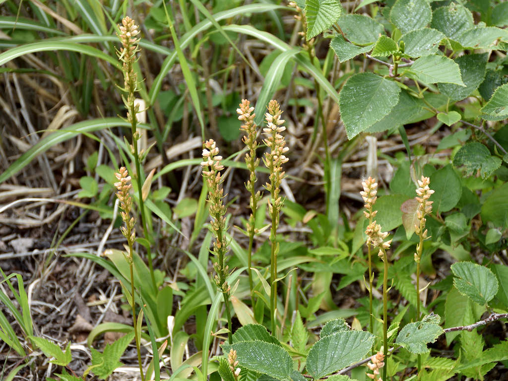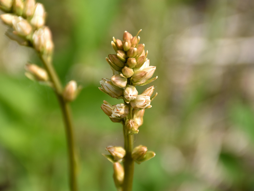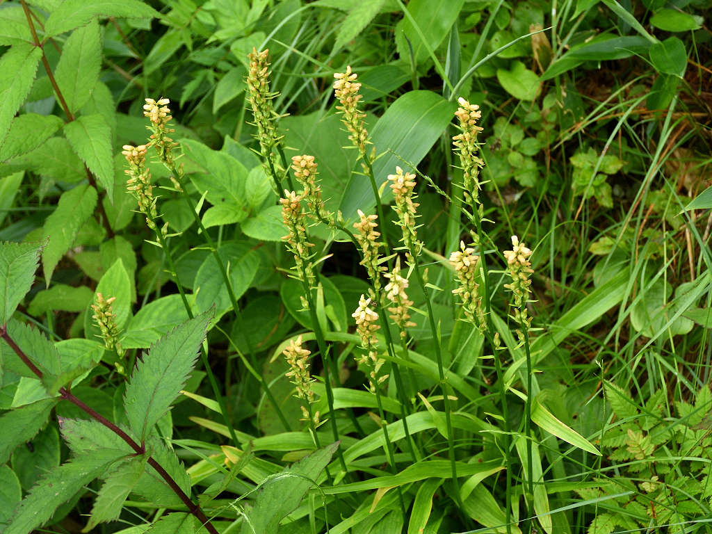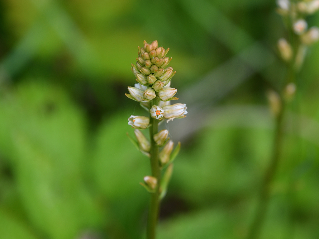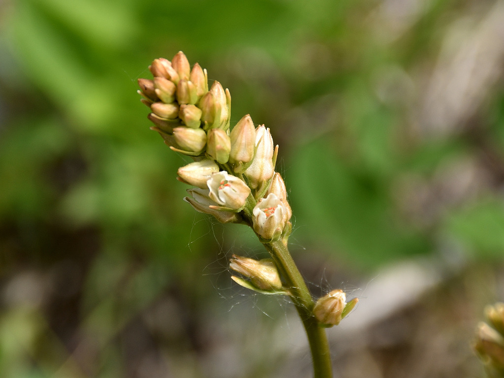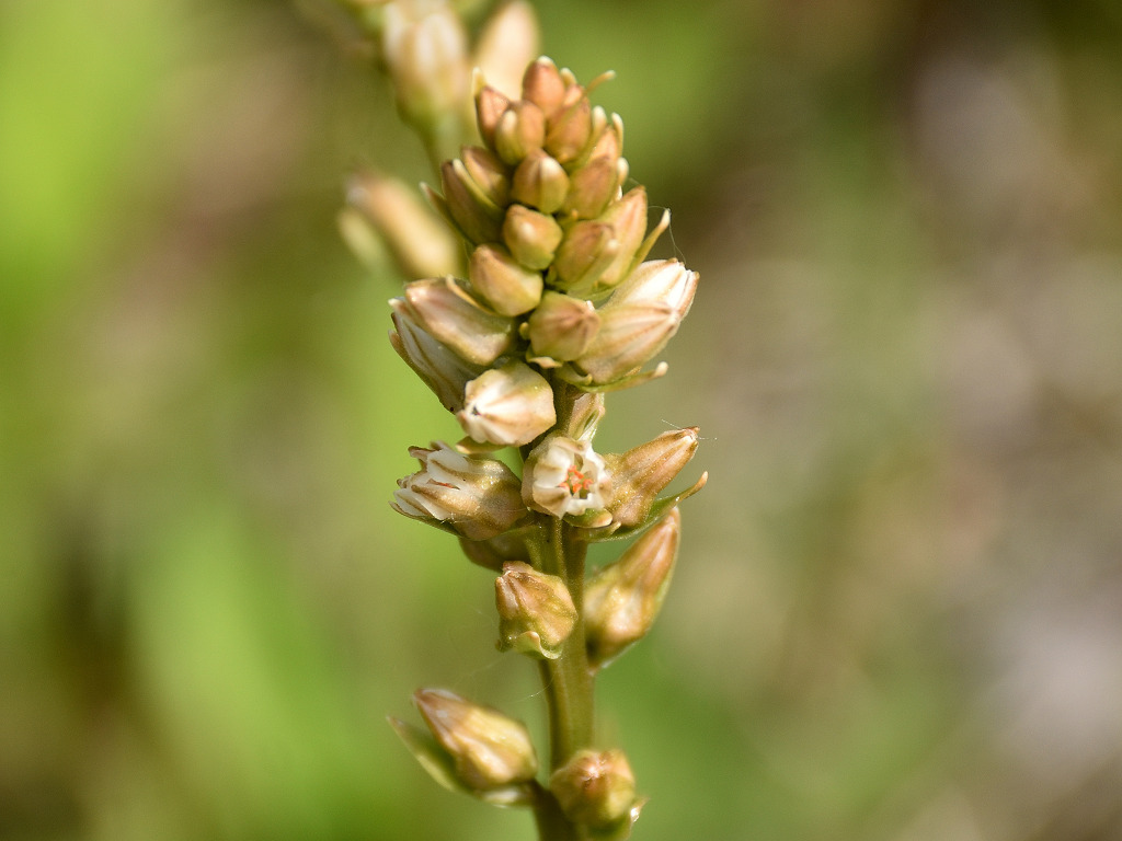 ノギランに似た花で花穂がベタつく 葉の側の小さな包をイネ科の「芒」と見立てて付いた名