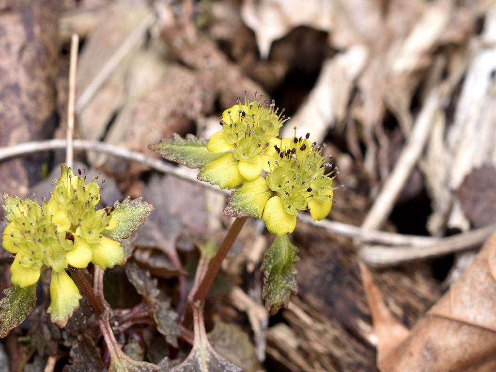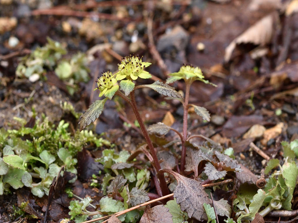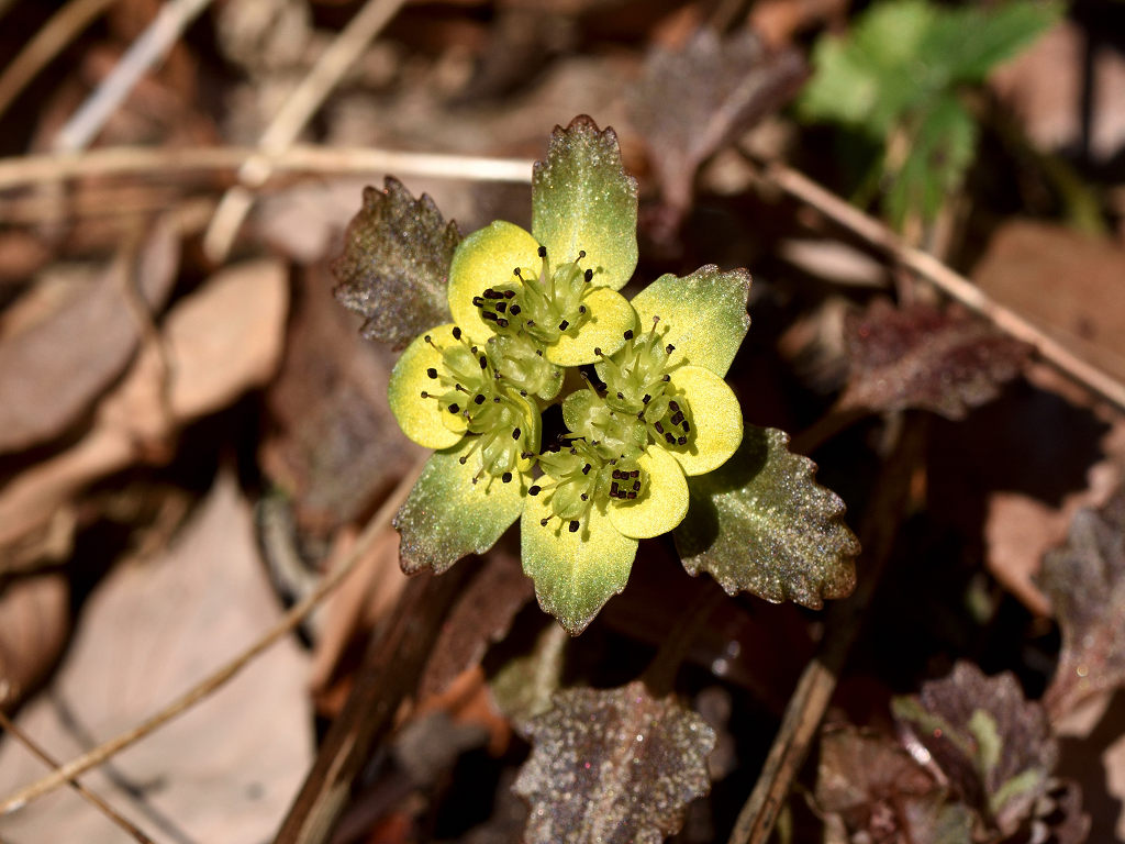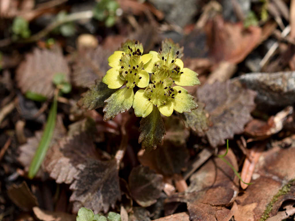 | 花の特徴 | ガクは丸みを帯び平開 色は黄緑色から黄色でオシベは6〜8本ガクから大きく飛び出す。葉は対生、葯は赤褐色、ヨゴレネコノメに似ているが ガグが開平(ヨゴレは直立) ガク片の色が黄色、黄緑色(ヨゴレは灰色、褐色) ガク片の先が尖る(ヨゴレは先が鈍形) 雄しべの本数 8本ガクより長い(ヨゴレは4−8本 ) |