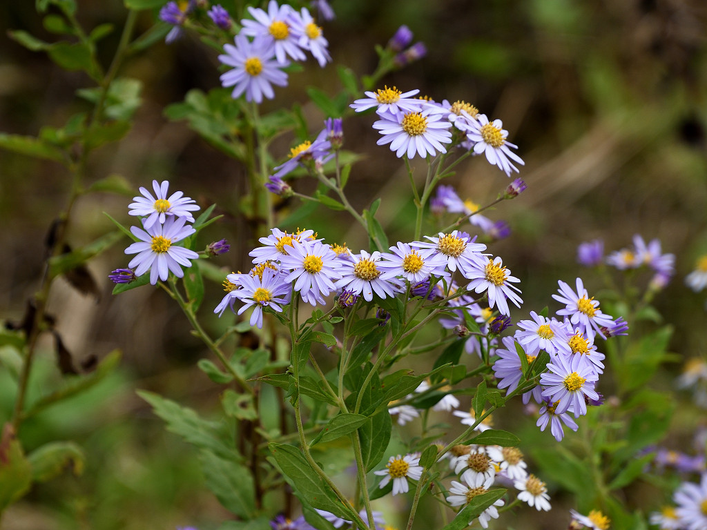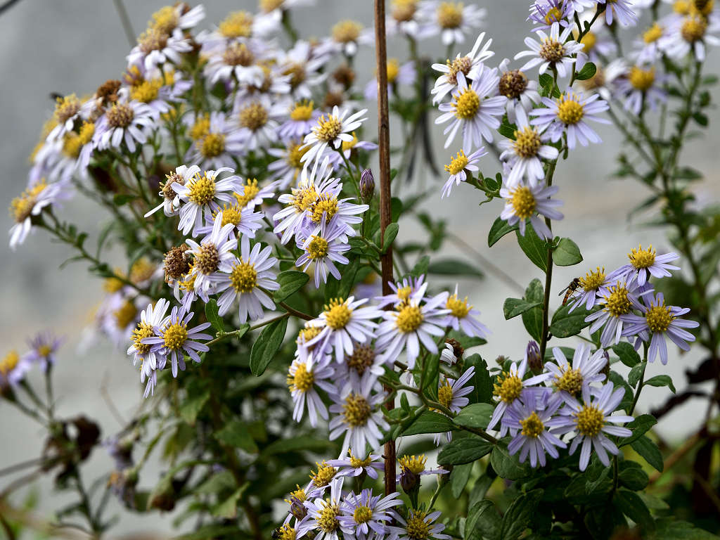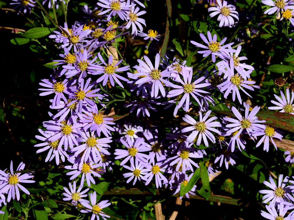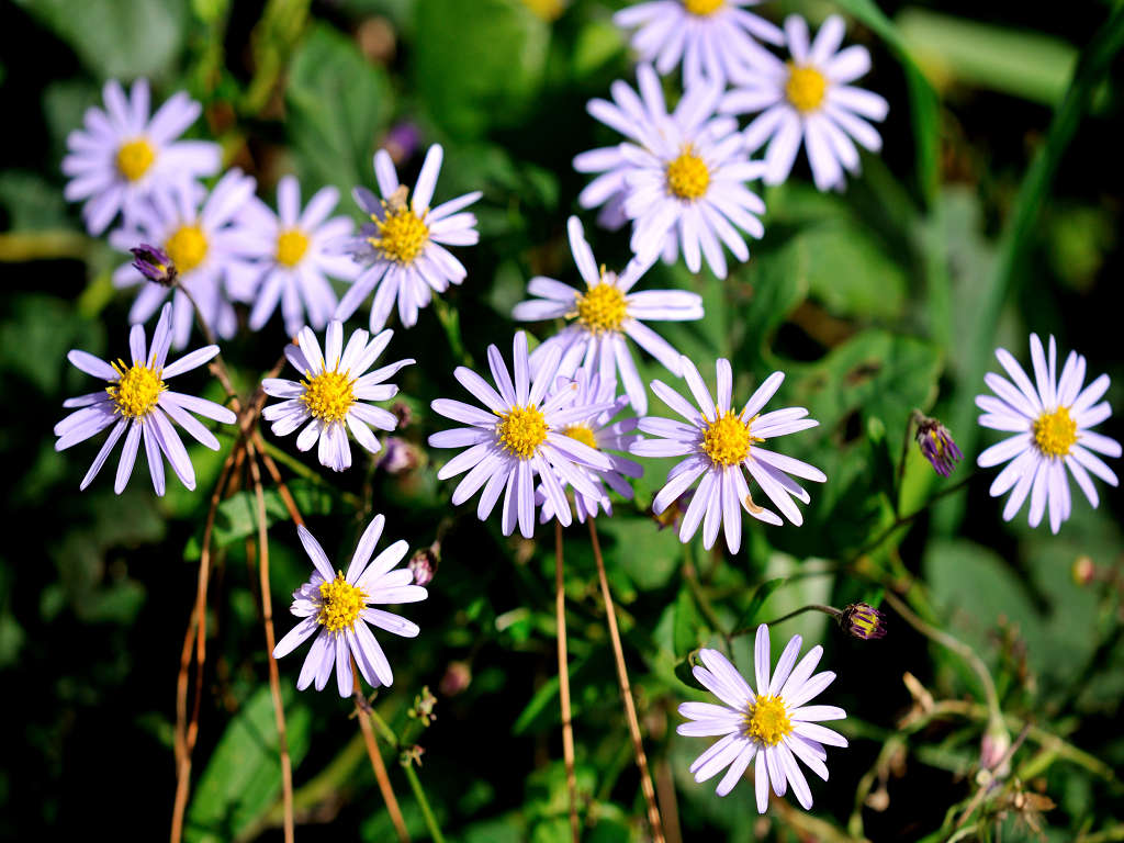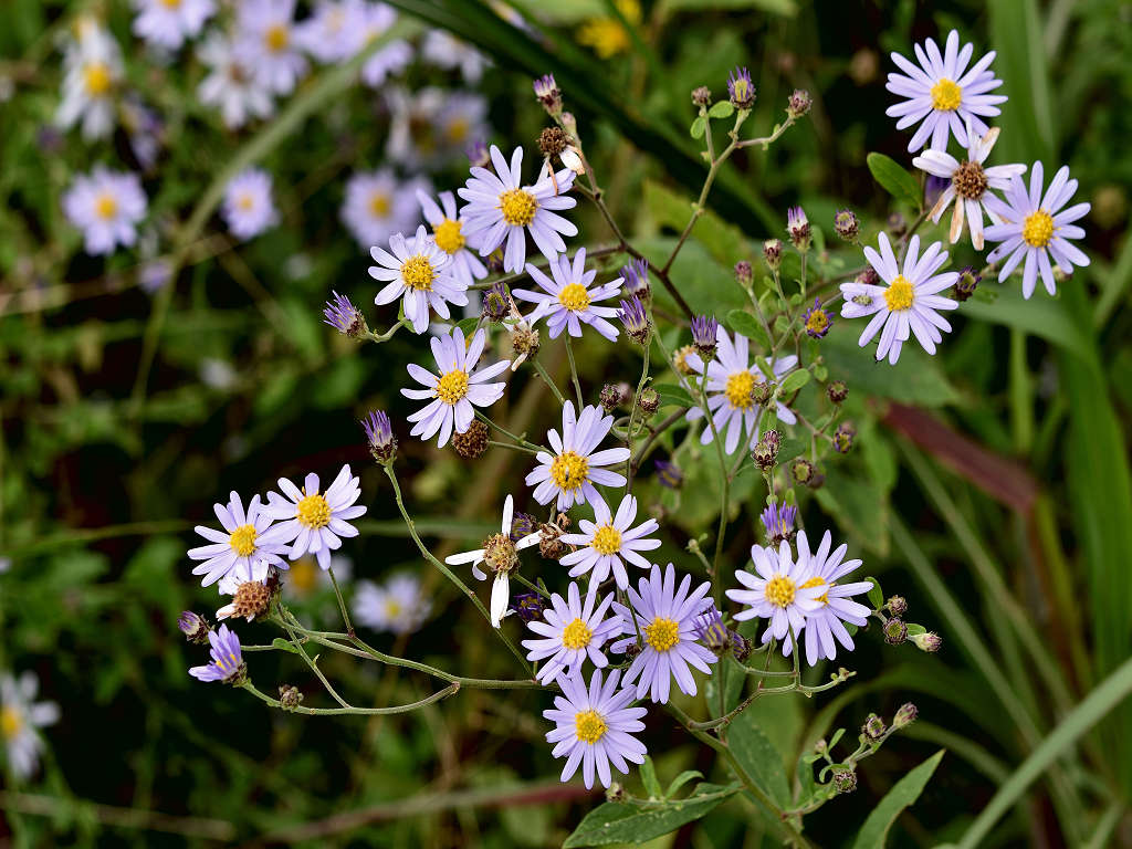 茎の上部で細かく枝別れし、先端に淡紫色の花を咲かす 花弁は舌状花で15−20枚