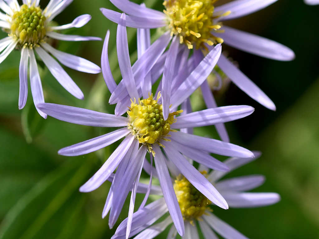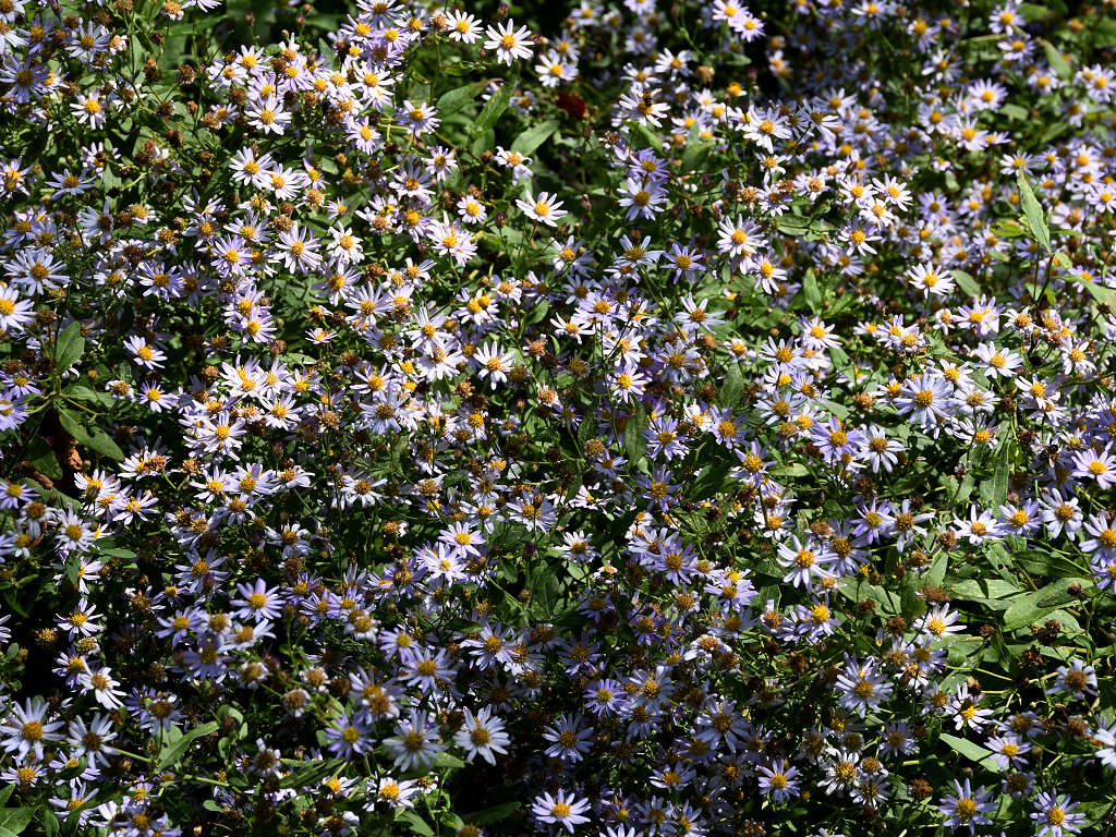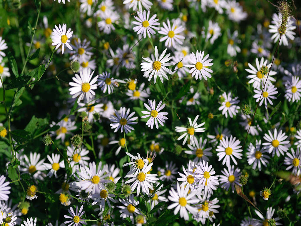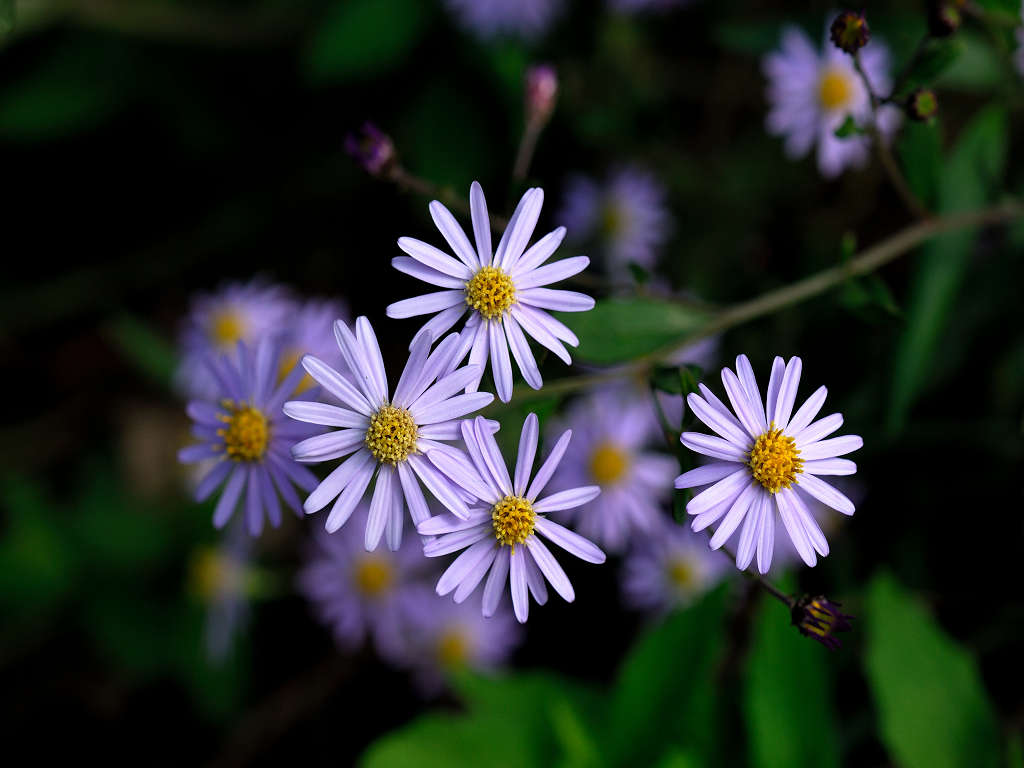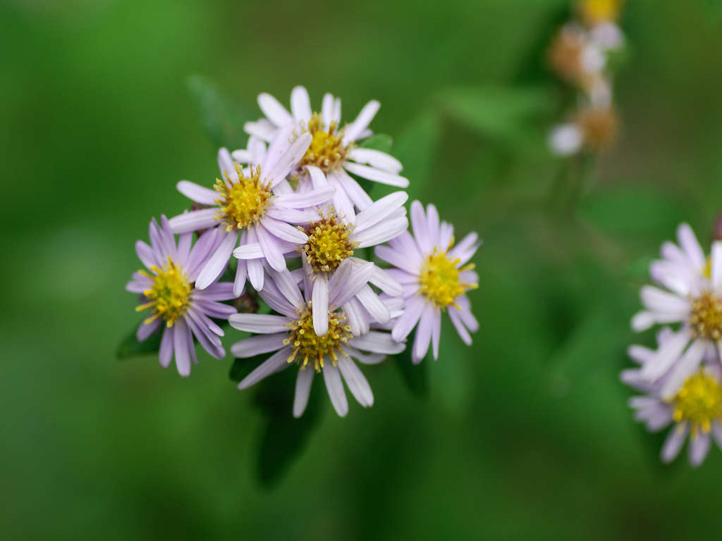 茎の上部で細かく枝別れし、先端に淡紫色の花を咲かす 花弁は舌状花で15−20枚