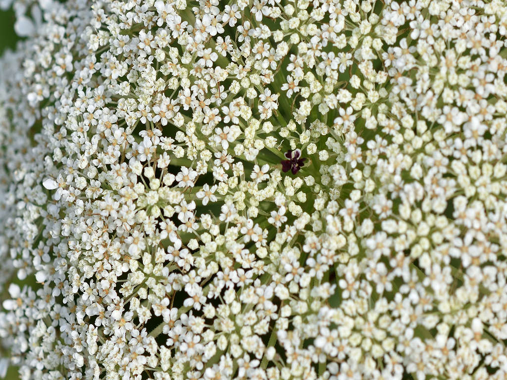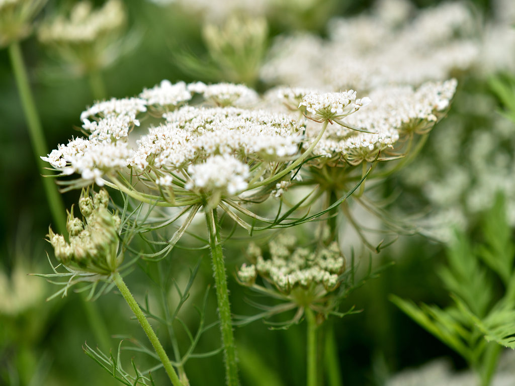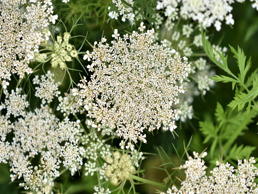 夏に、レースのような白い小花を集合させて咲かせる 2・3回3で羽状複葉で葉色は緑色