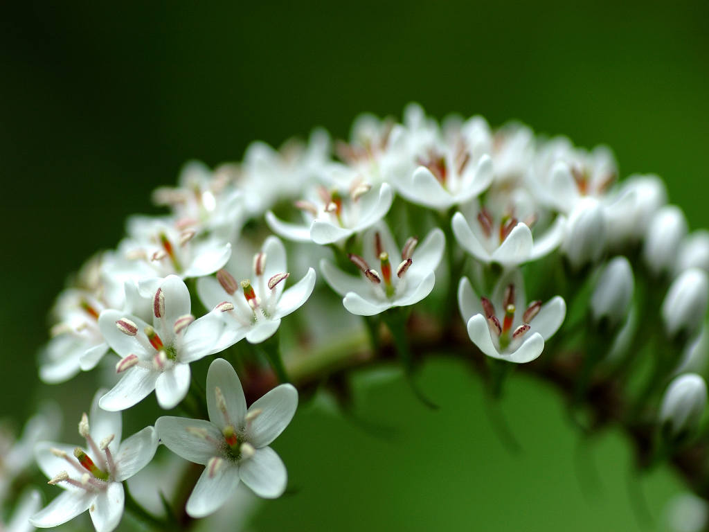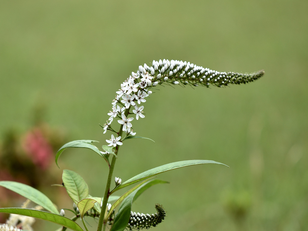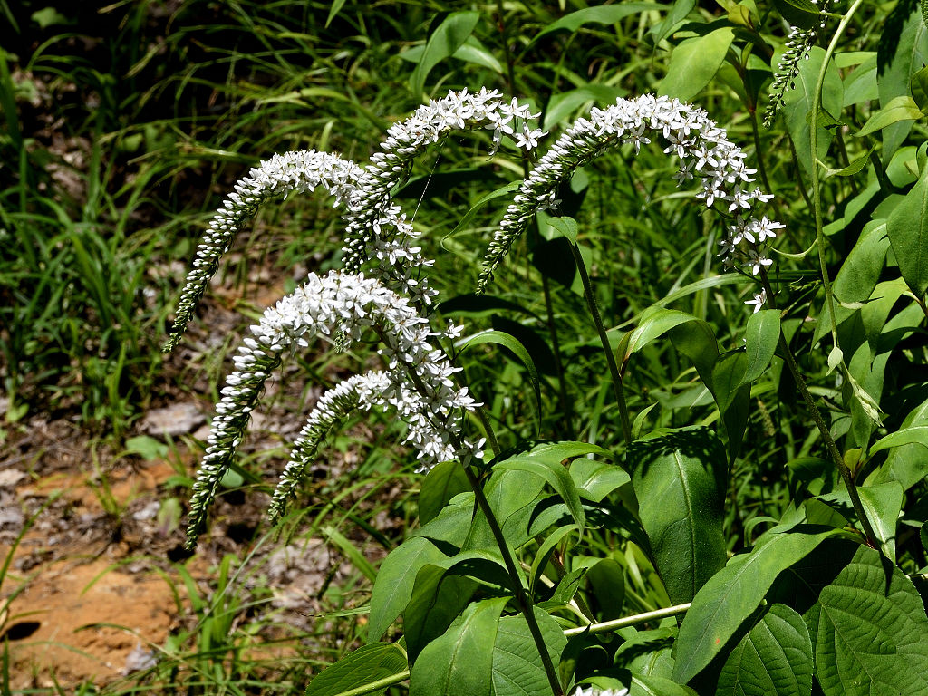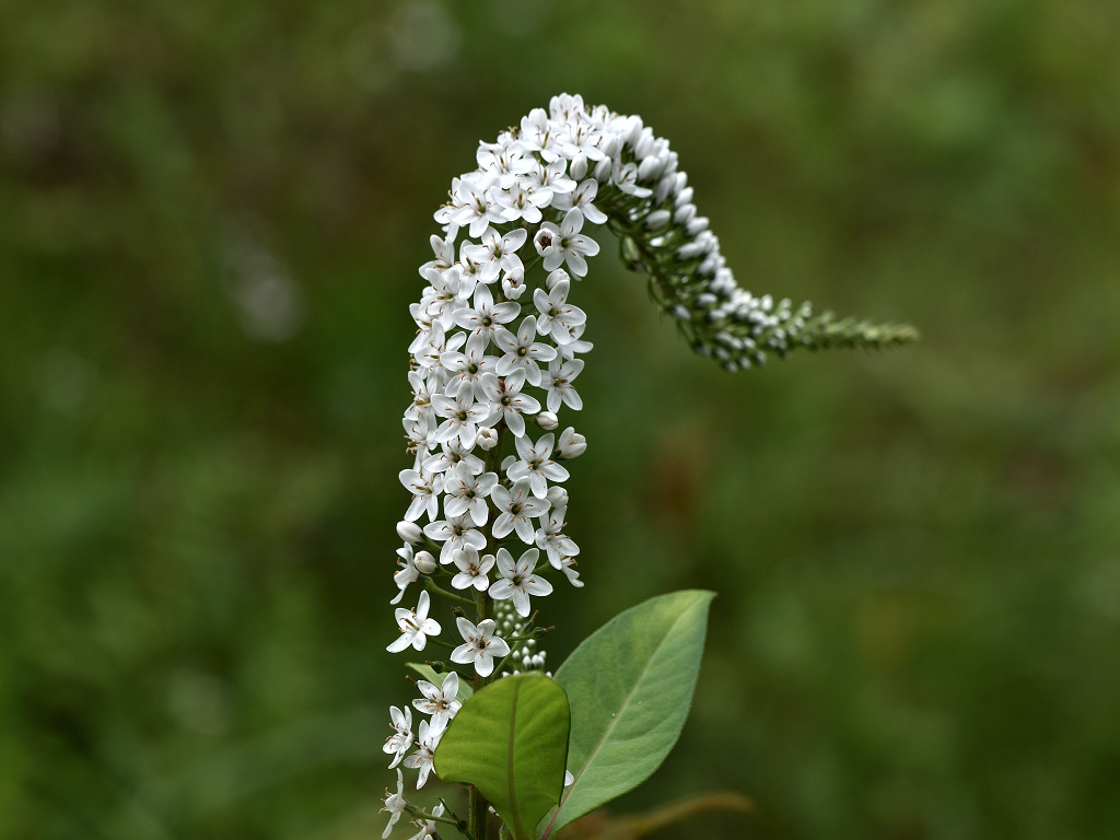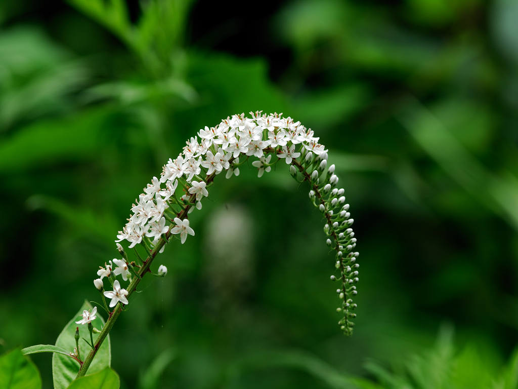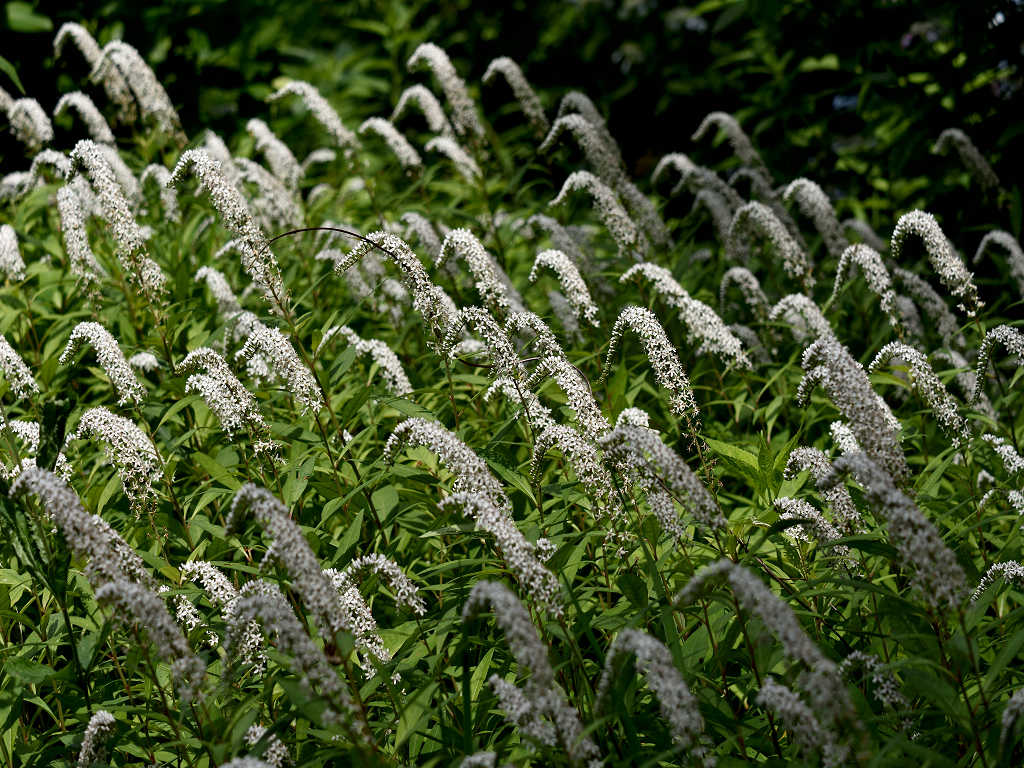 根元のほうから先端に向けて 白い花が一斉に同じ方向に咲き上がっていく