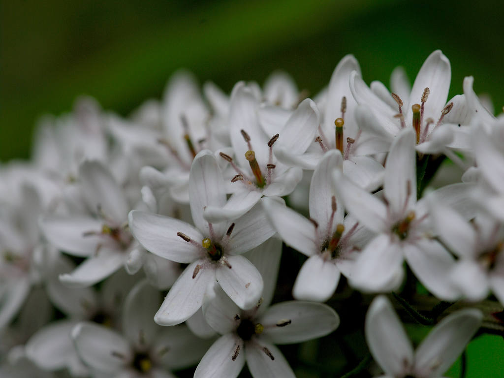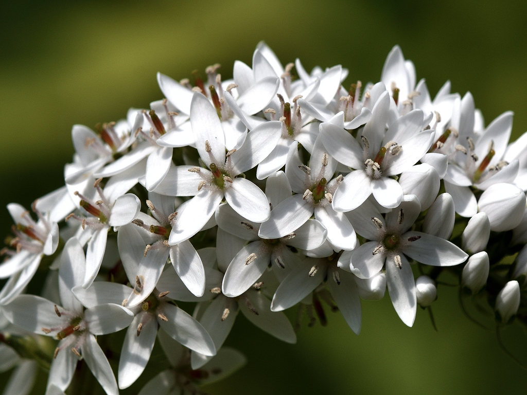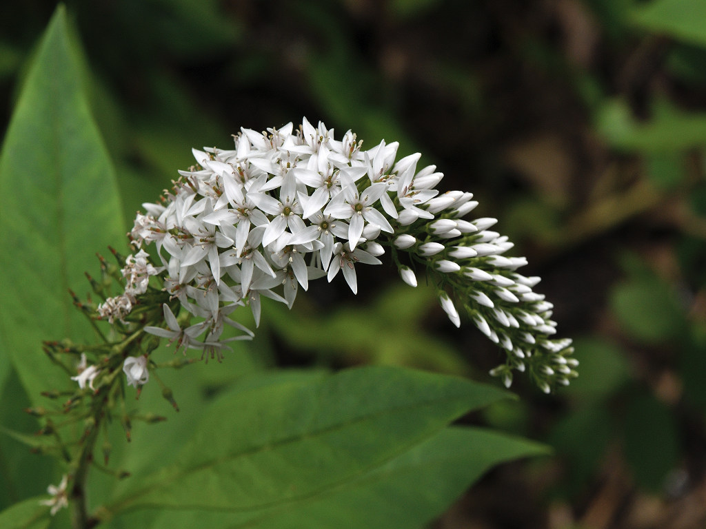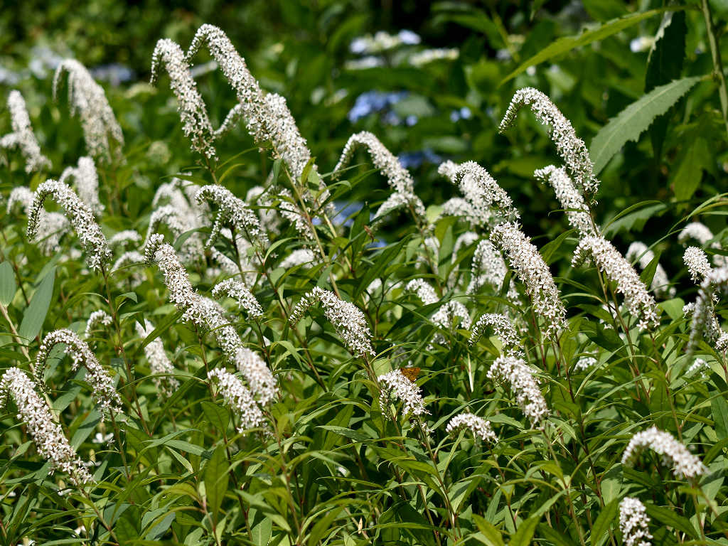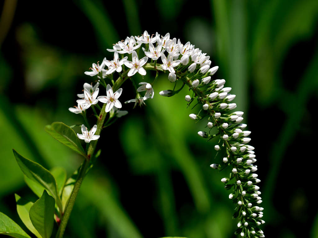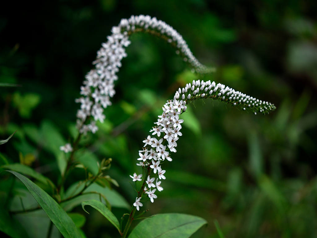 根元のほうから先端に向けて 白い花が一斉に同じ方向に咲き上がっていく
