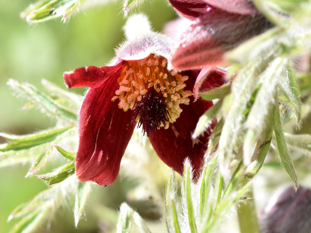 花弁状のガクの外側に白い毛が沢山生えていて、内側は赤黒い色 6枚のガク片が「筒状になっていてやや下向きの咲く