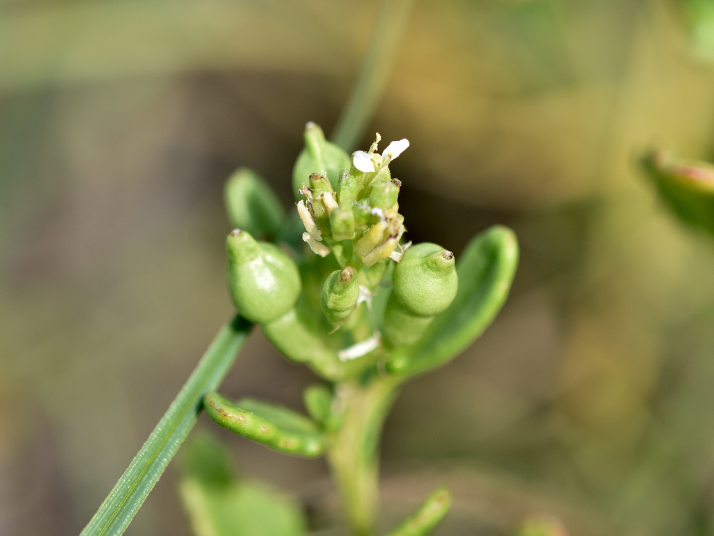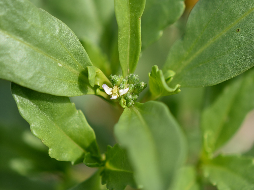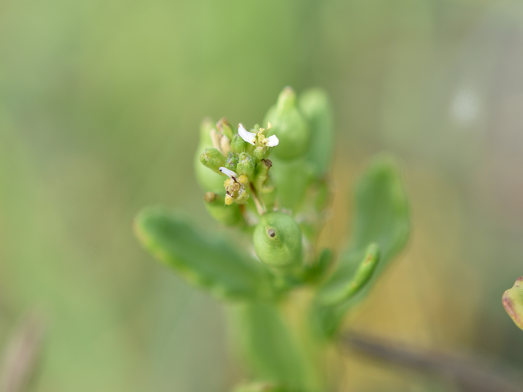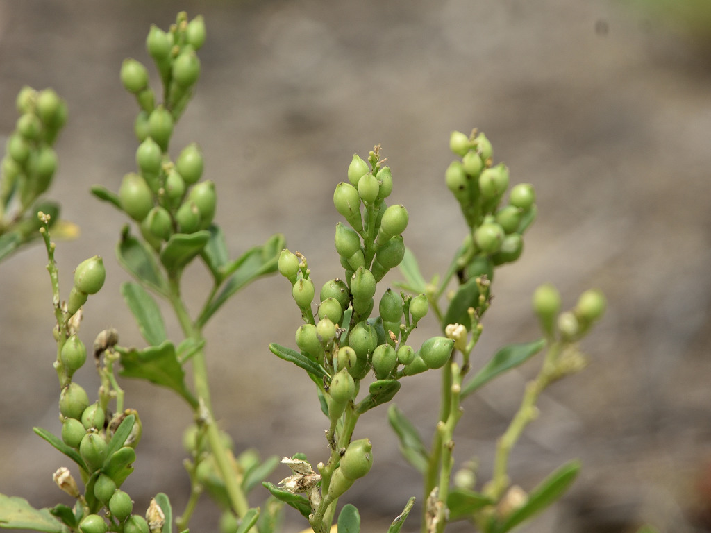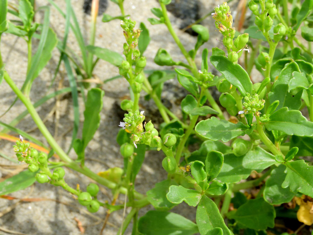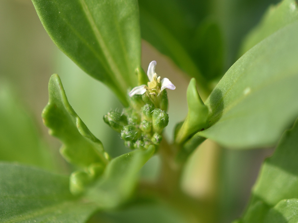 北アメリカ原産の帰化植物 全体が多肉質で枝先や葉腋から伸びる総状花序に直径約8ミリの白色〜淡紅色の花を多数つける。花弁、萼は4個、雄しべは6個