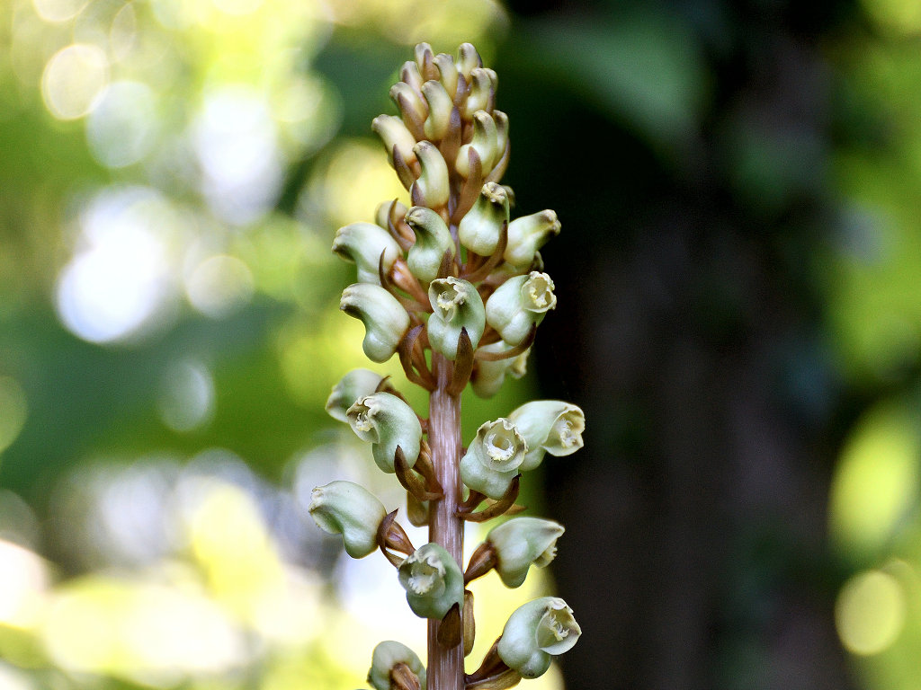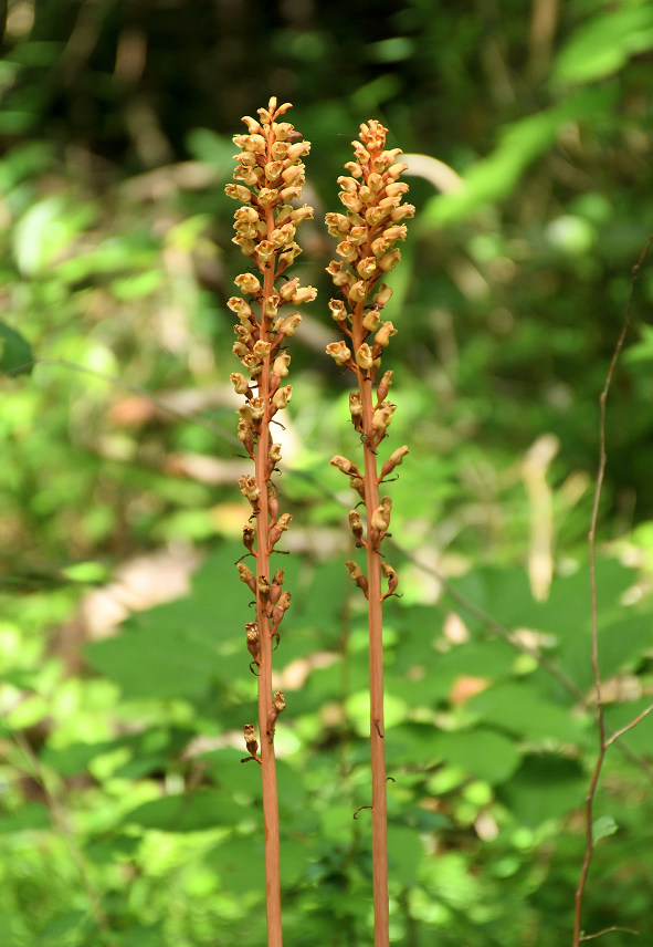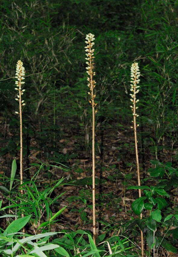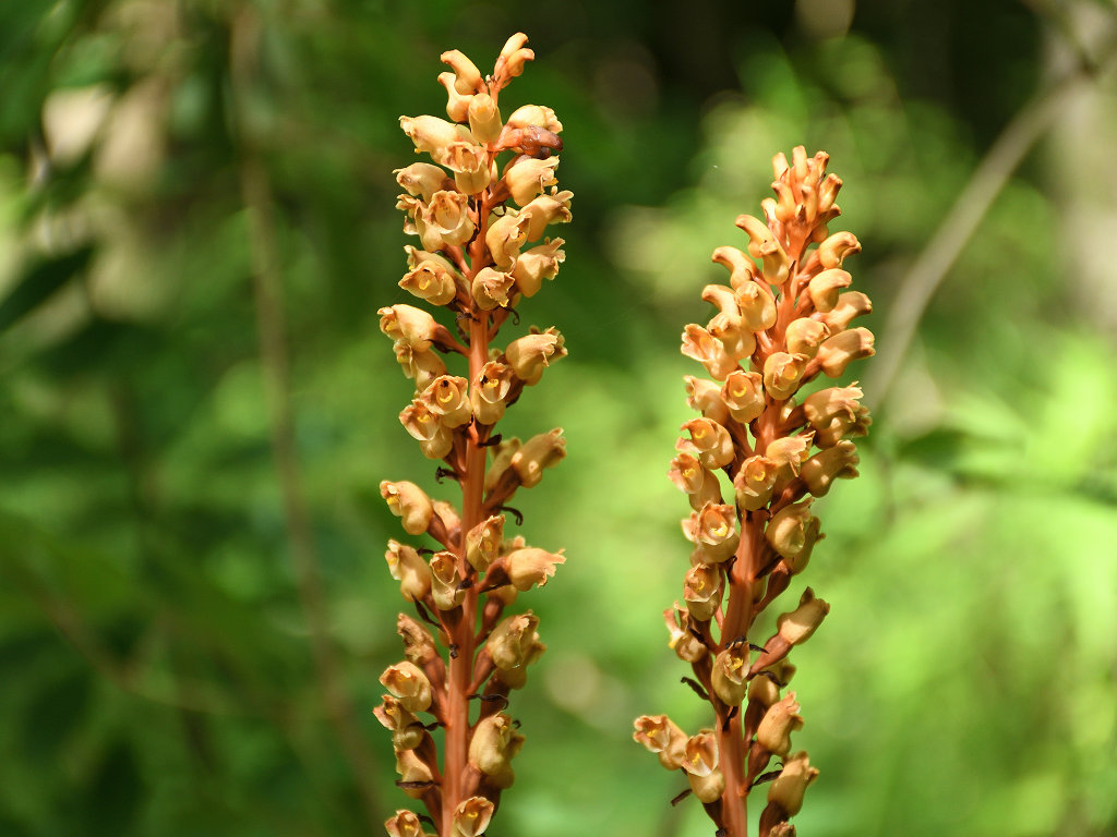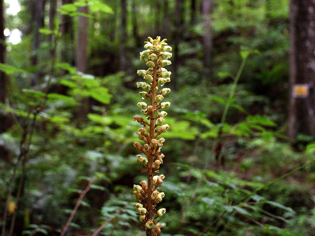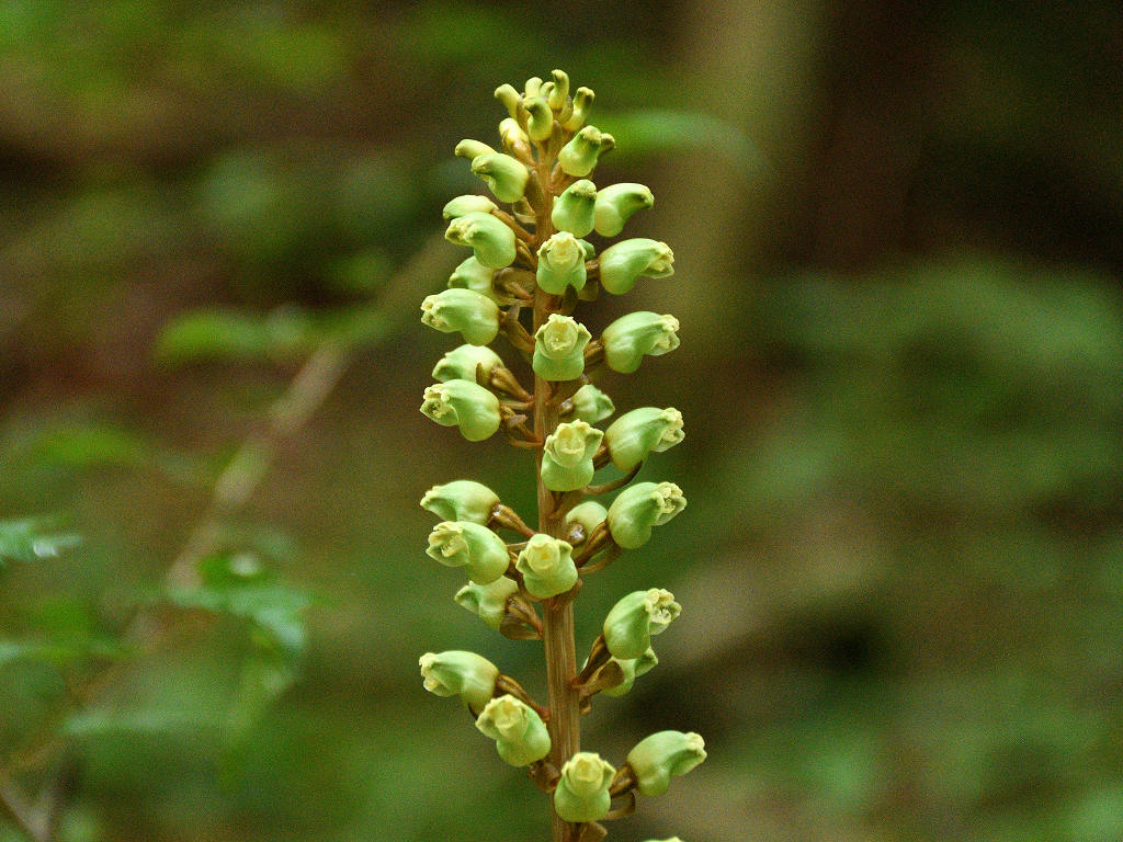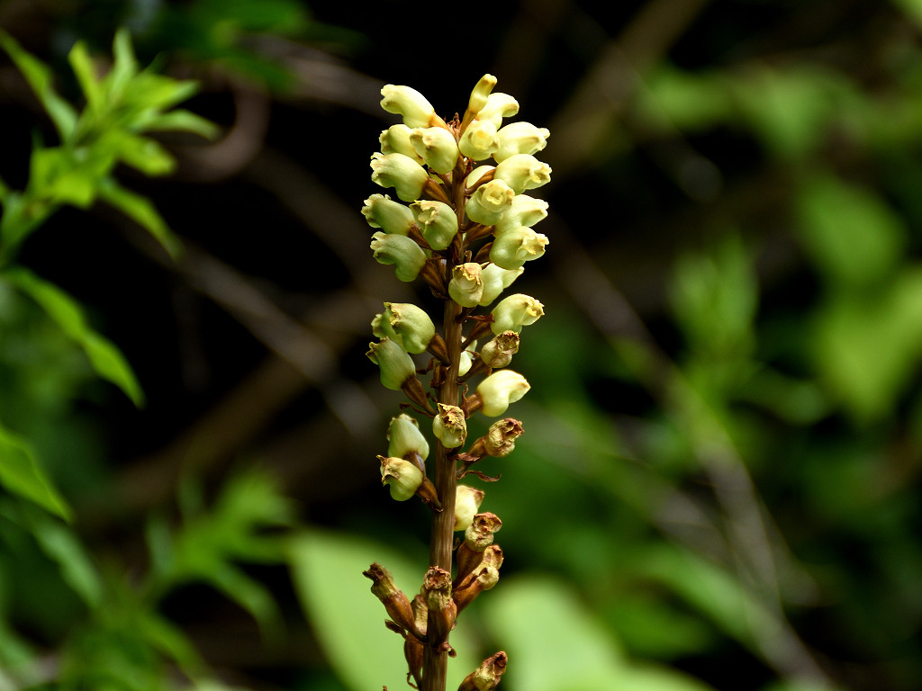 坪形の花 茎に穂状に付く 緑葉のないランで地下の菌根がナラタケ菌と共生し養分を作る 光合成をしない葉緑素を持たない腐生植物