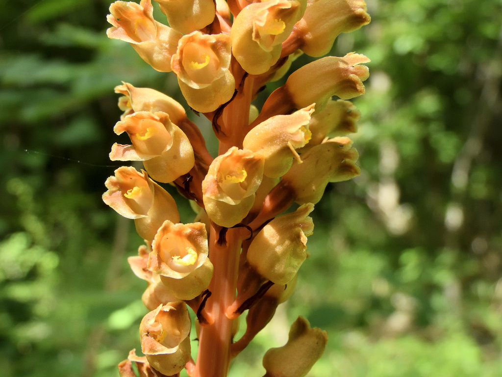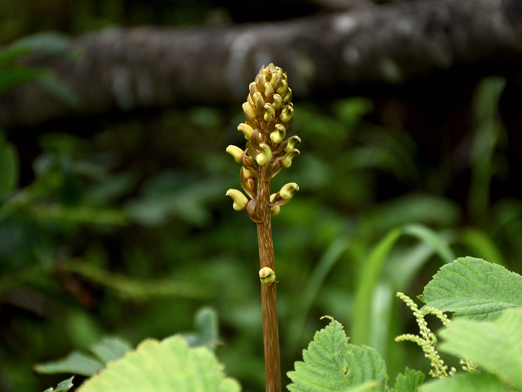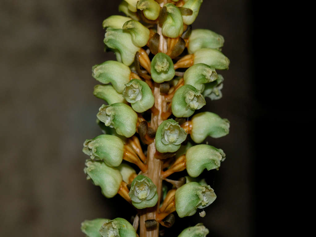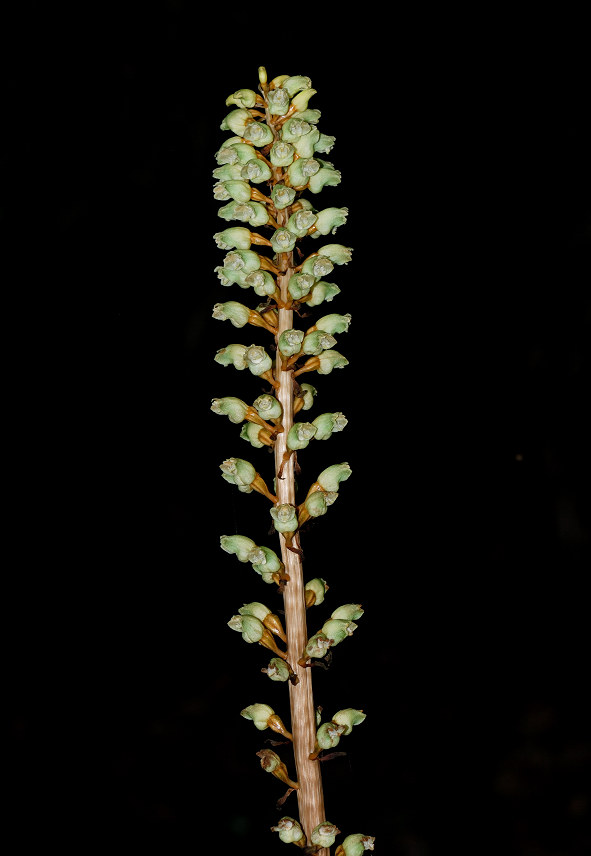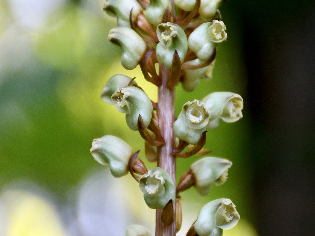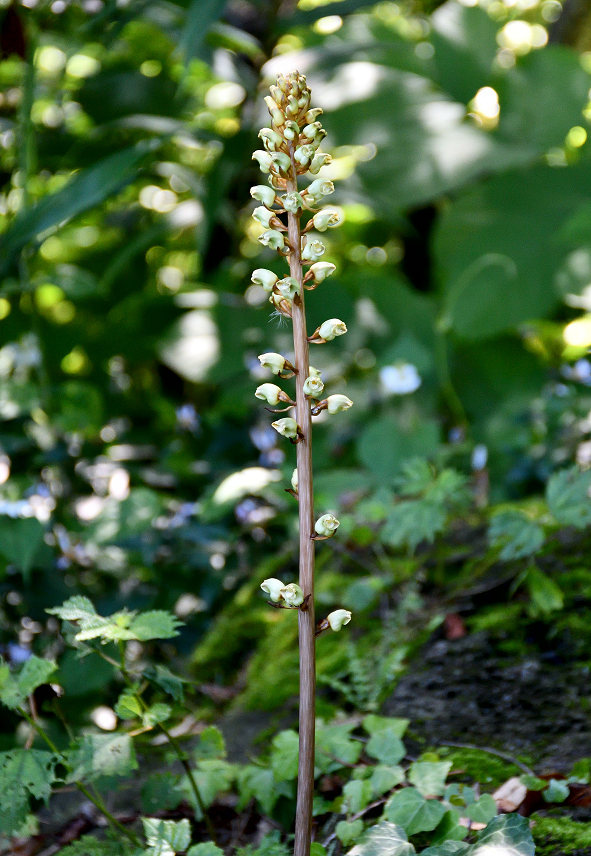 坪形の花 茎に穂状に付く 緑葉のないランで地下の菌根がナラタケ菌と共生し養分を作る 光合成をしない葉緑素を持たない腐生植物