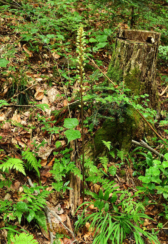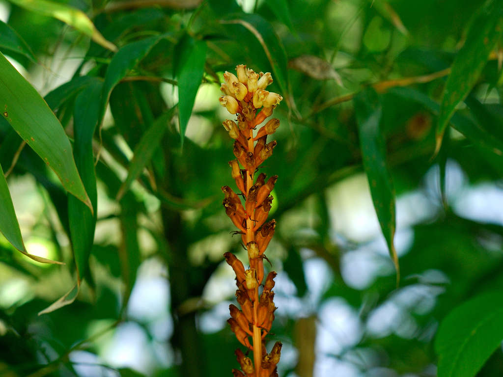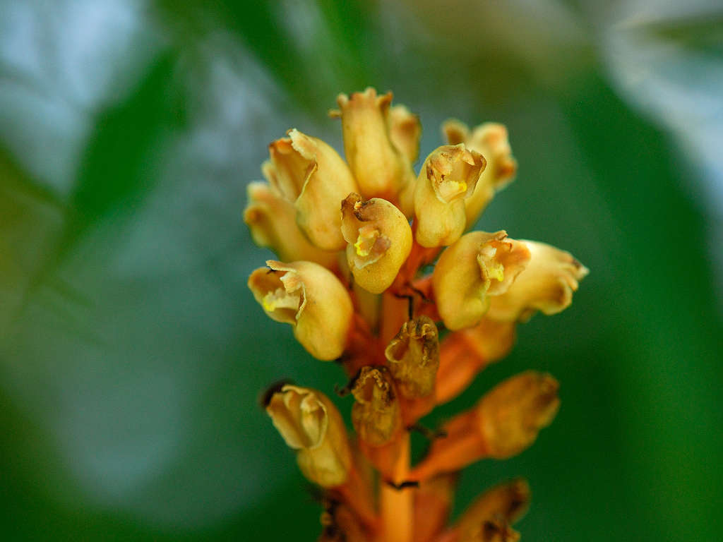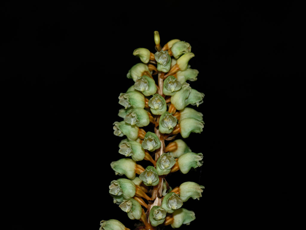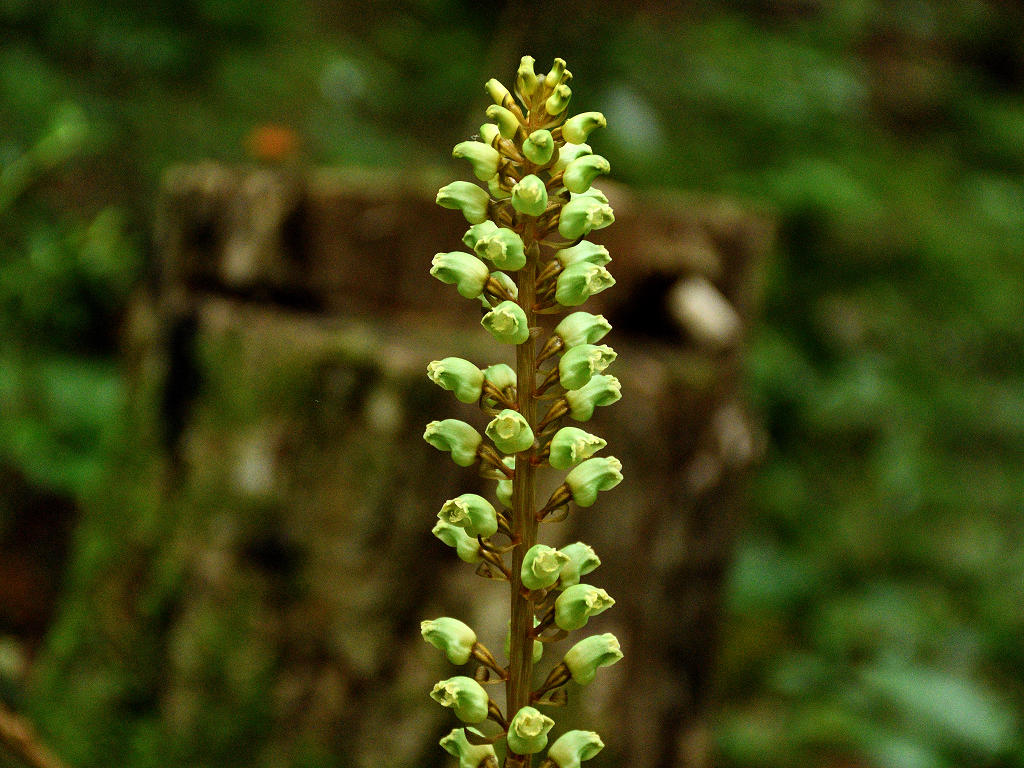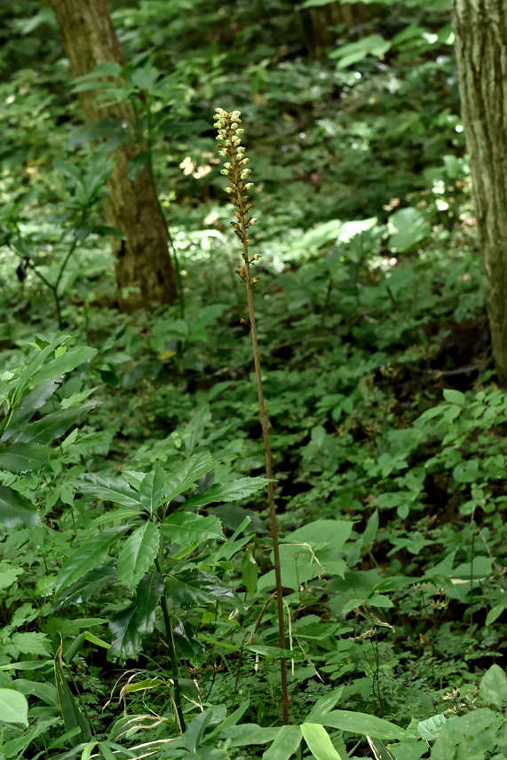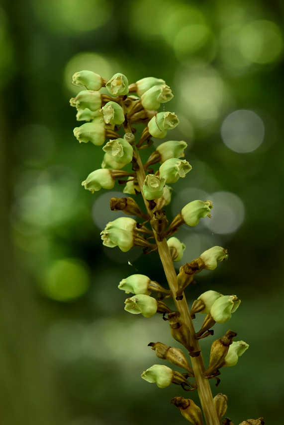 坪形の花 茎に穂状に付く 緑葉のないランで地下の菌根がナラタケ菌と共生し養分を作る 光合成をしない葉緑素を持たない腐生植物