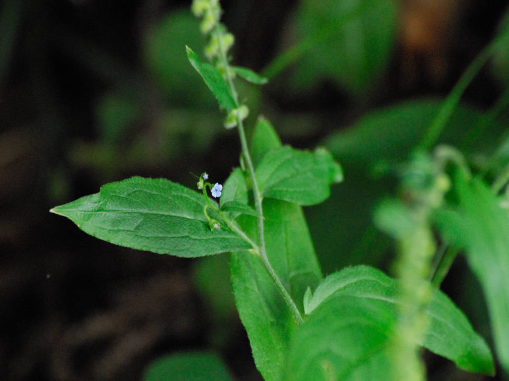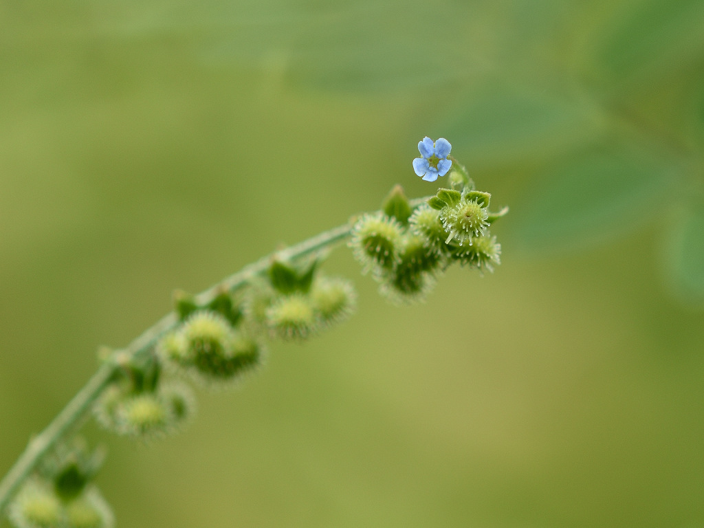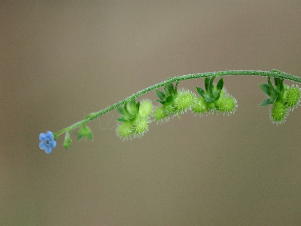 全体に毛が多く、茎の下部には長さ2o以上の開出毛がある 花序枝の先はしばしば2又分岐し、初め巻いているが、後に長く伸びて斜上する