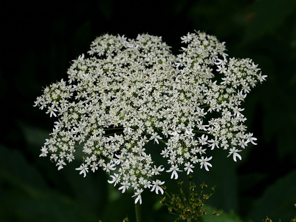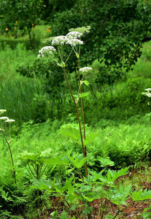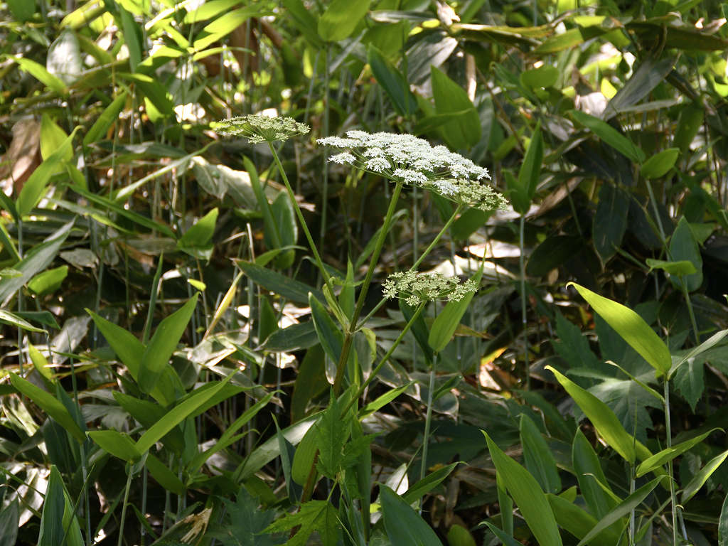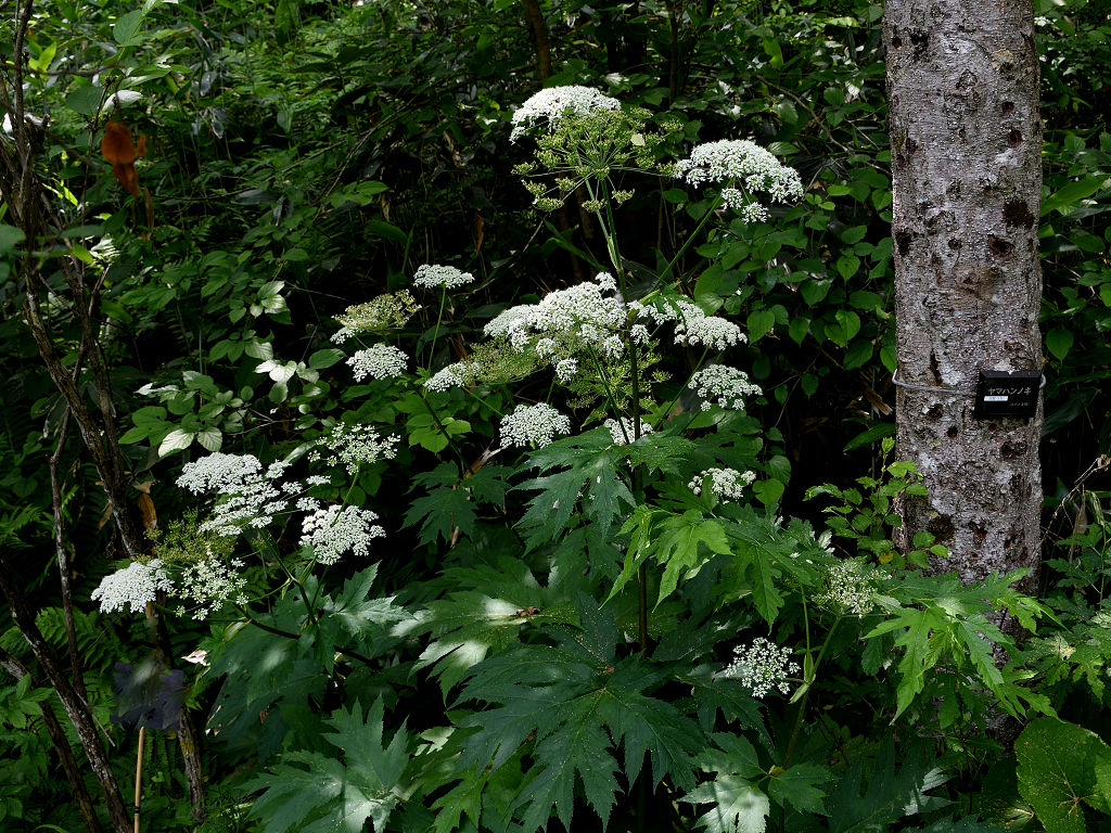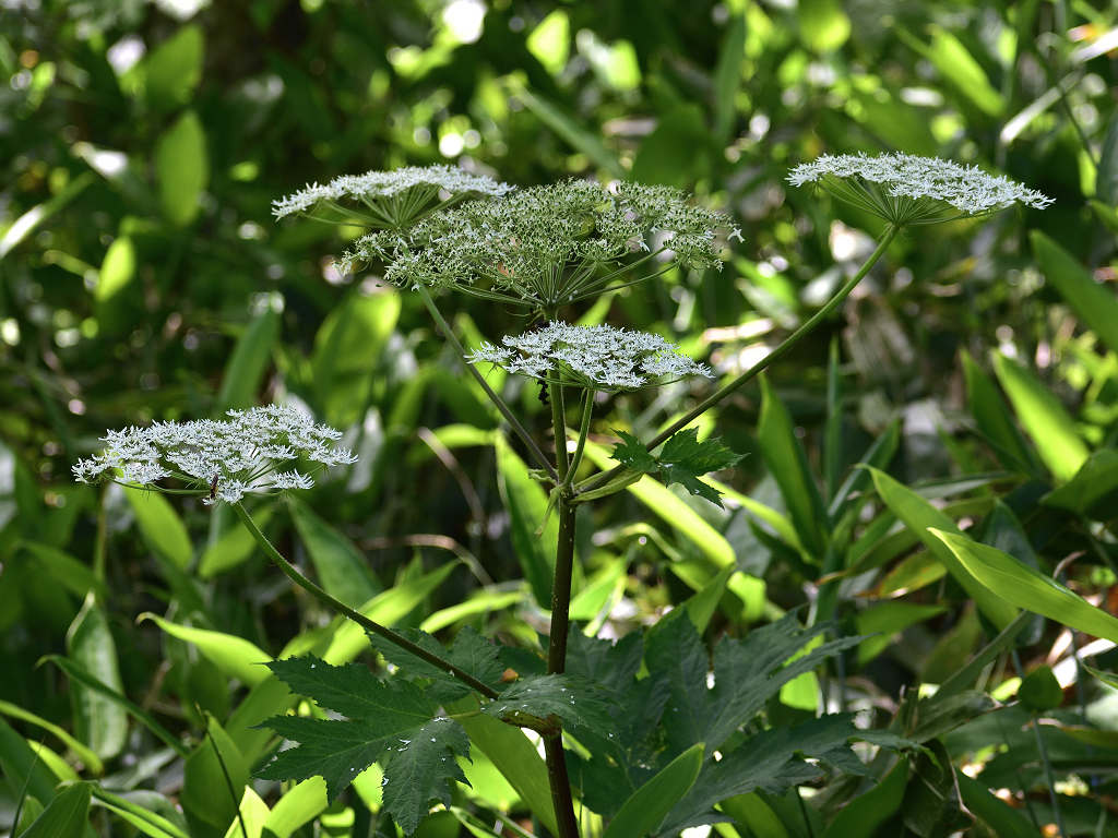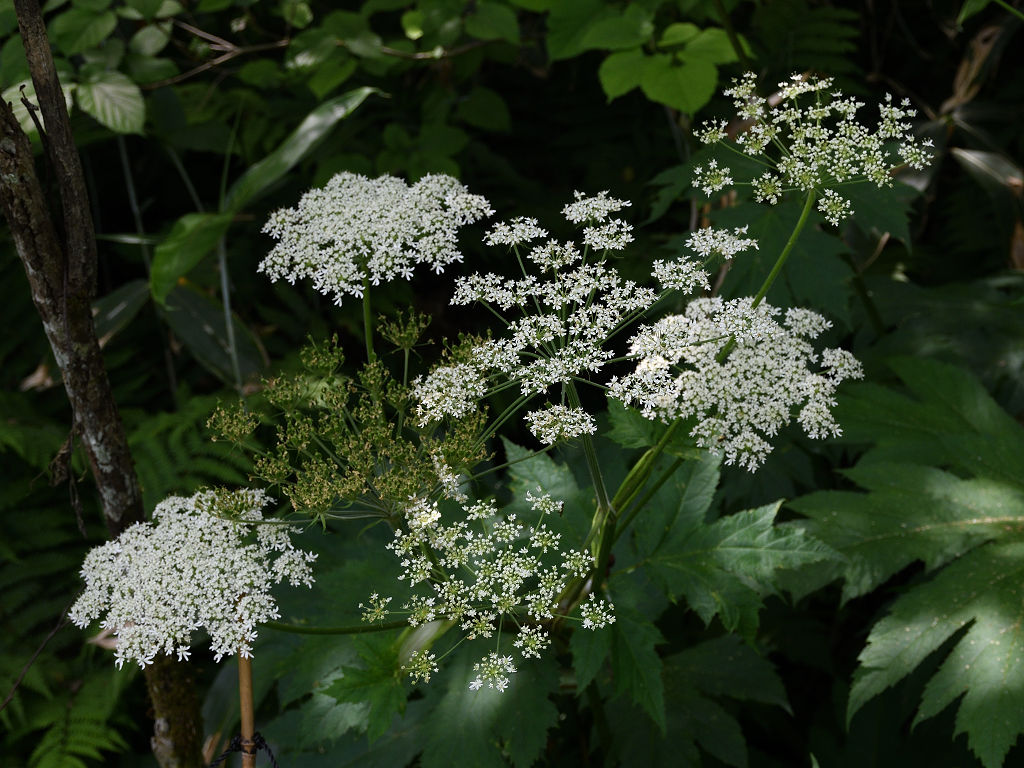 オオハナウドの葉は3出複葉で1枚が20-30センチ(ハナウドは3−5出複葉で1枚が10-20センチ 沢山の花柄に分かれ、その先に5枚の花びらが付く。これらが2−30個集まって傘形の花になる