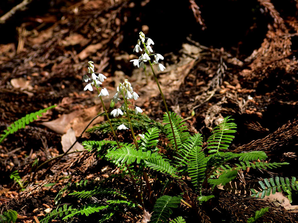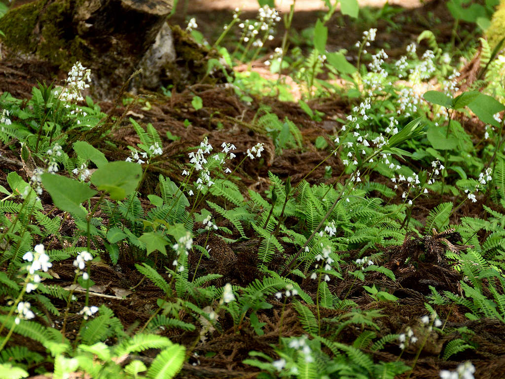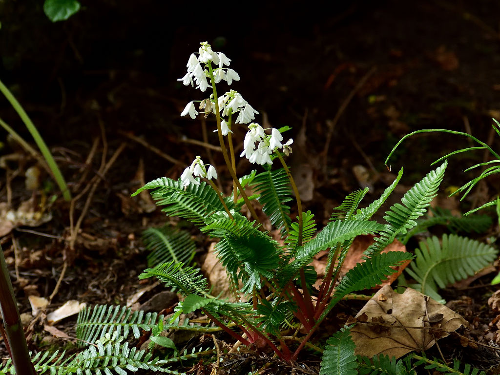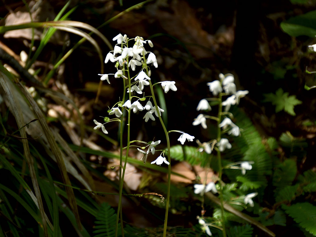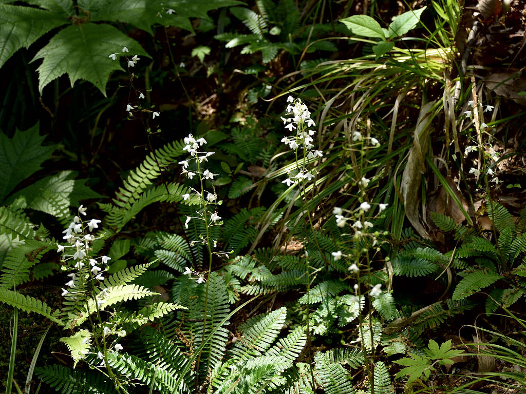 花径の上層部に白い花弁4枚の花が咲く 根元の葉はシダに似ている