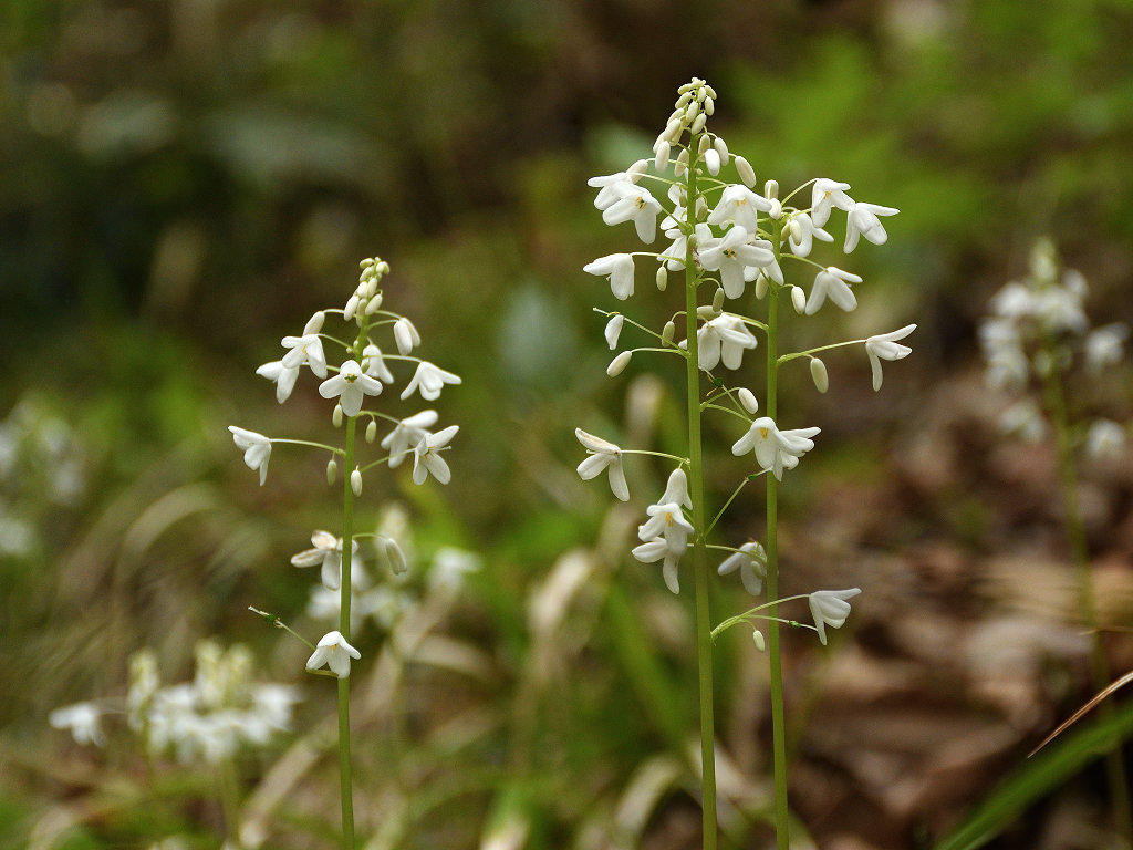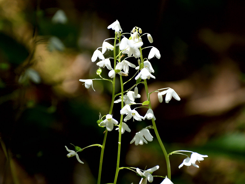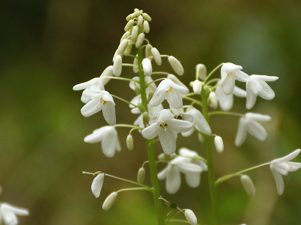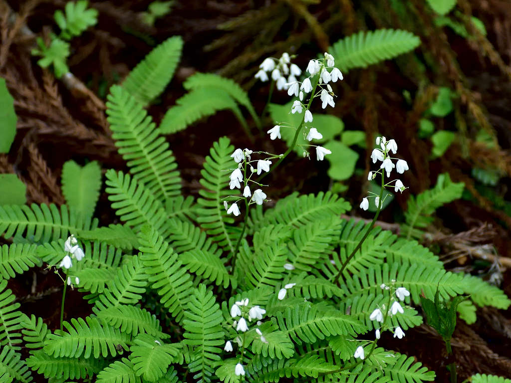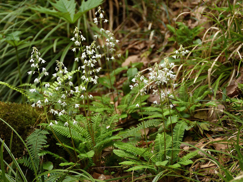 花径の上層部に白い花弁4枚の花が咲く 根元の葉はシダに似ている