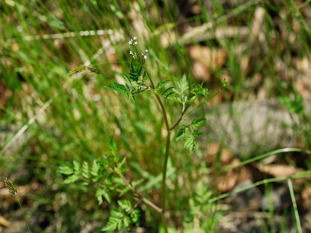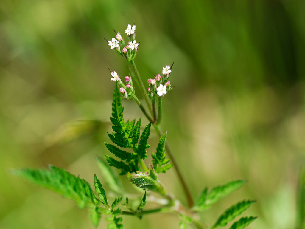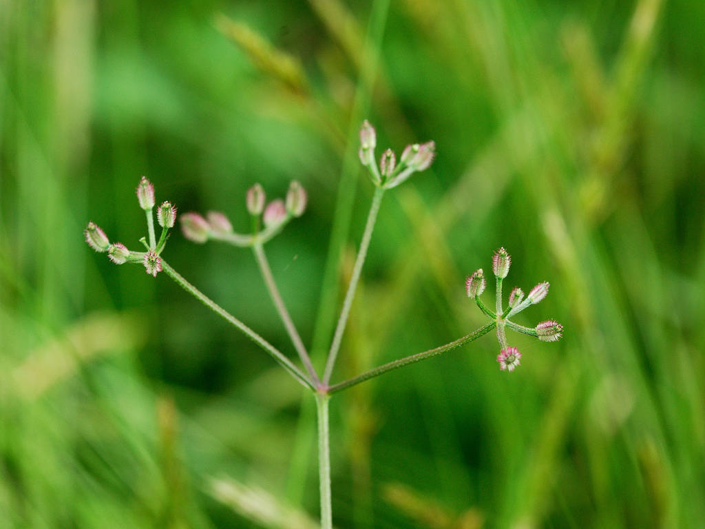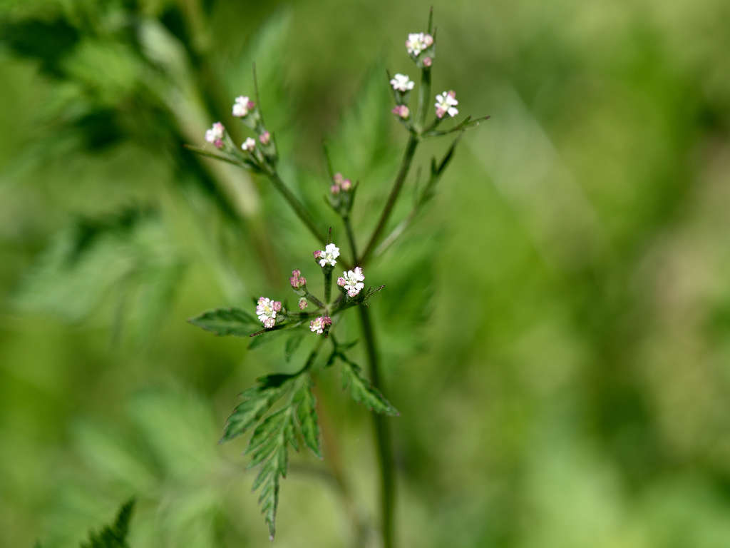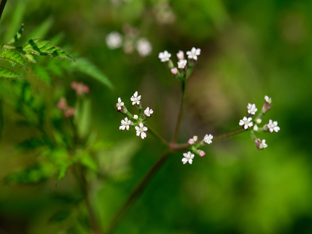 「ヤブジラミ」に似る 茎や葉が紫色を帯び 花の縁が薄くピンク色に染まる