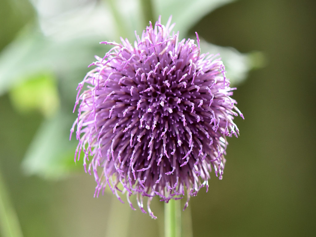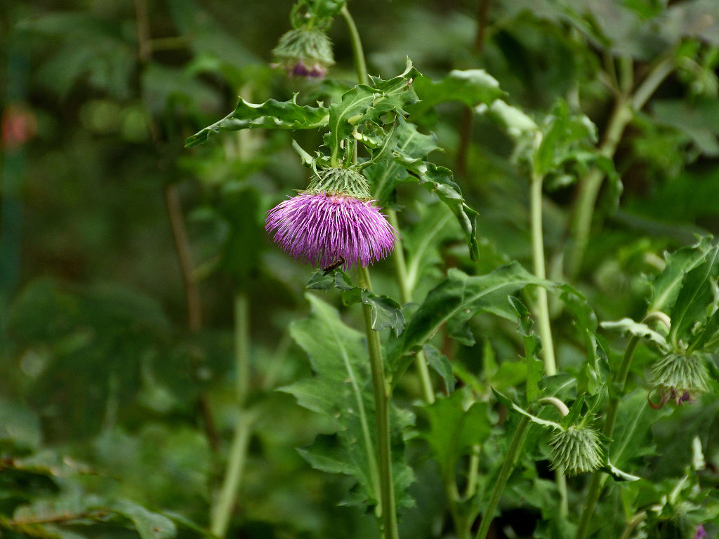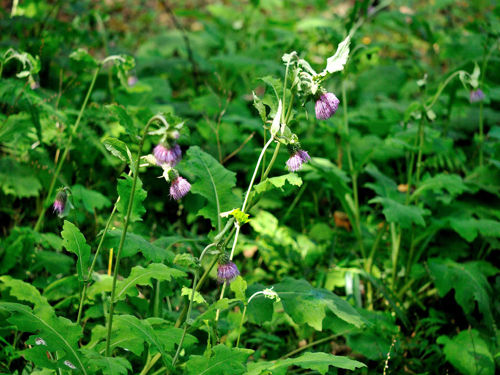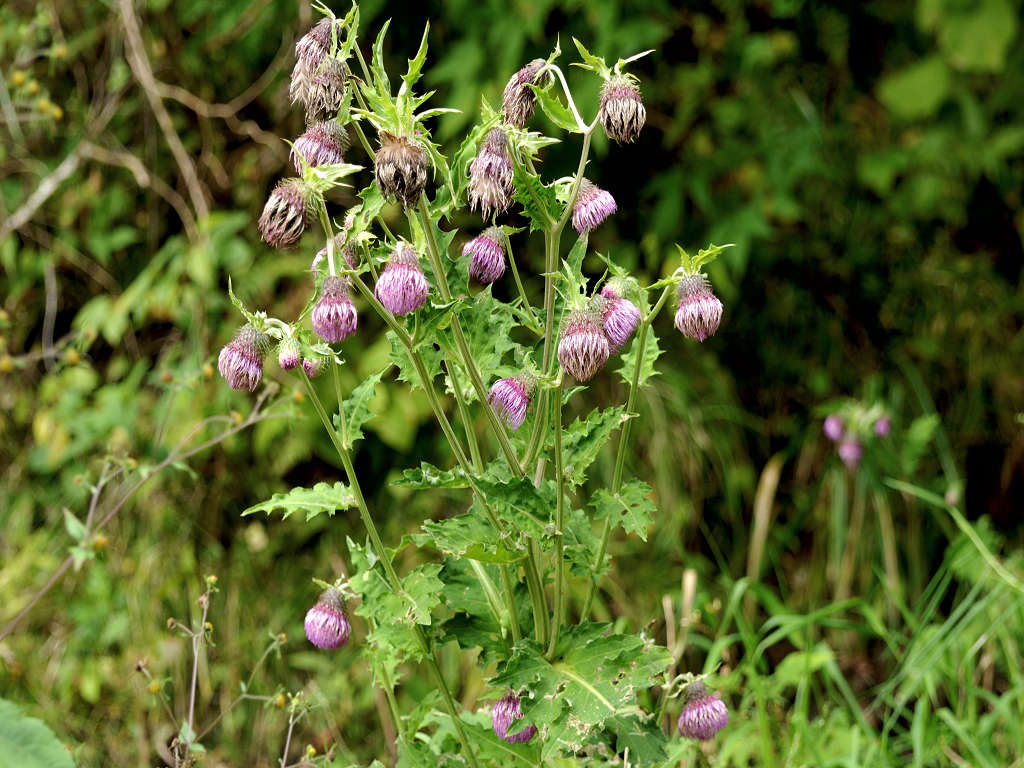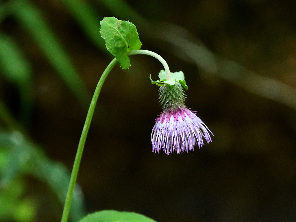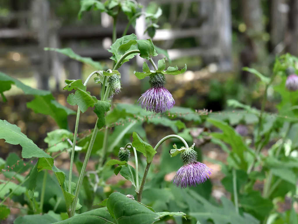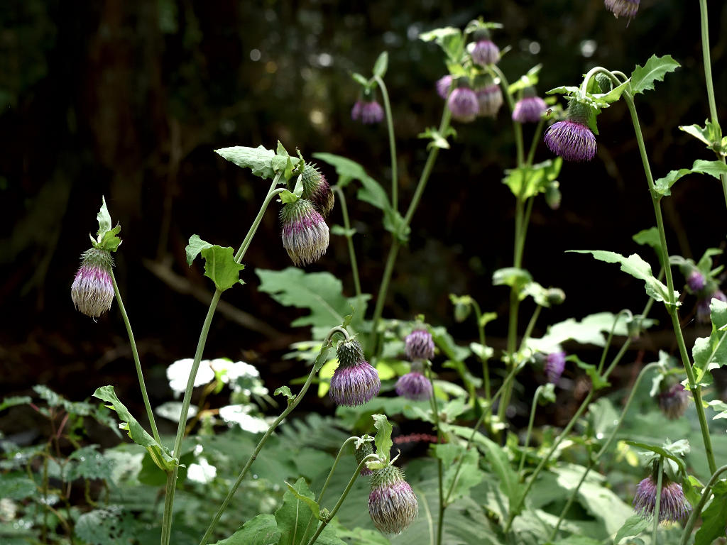 川沿いや沢の近くに生える大型のアザミで根生葉は楕円形で長さ60pにもなり、羽状に裂ける。葉は表面は毛があるのでざらつくが、裏面は無毛。茎の先に4〜6個の頭花を下向きにつける