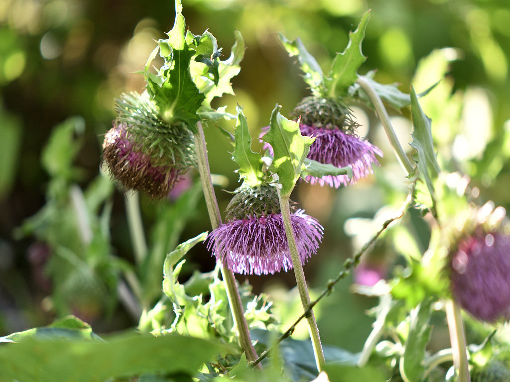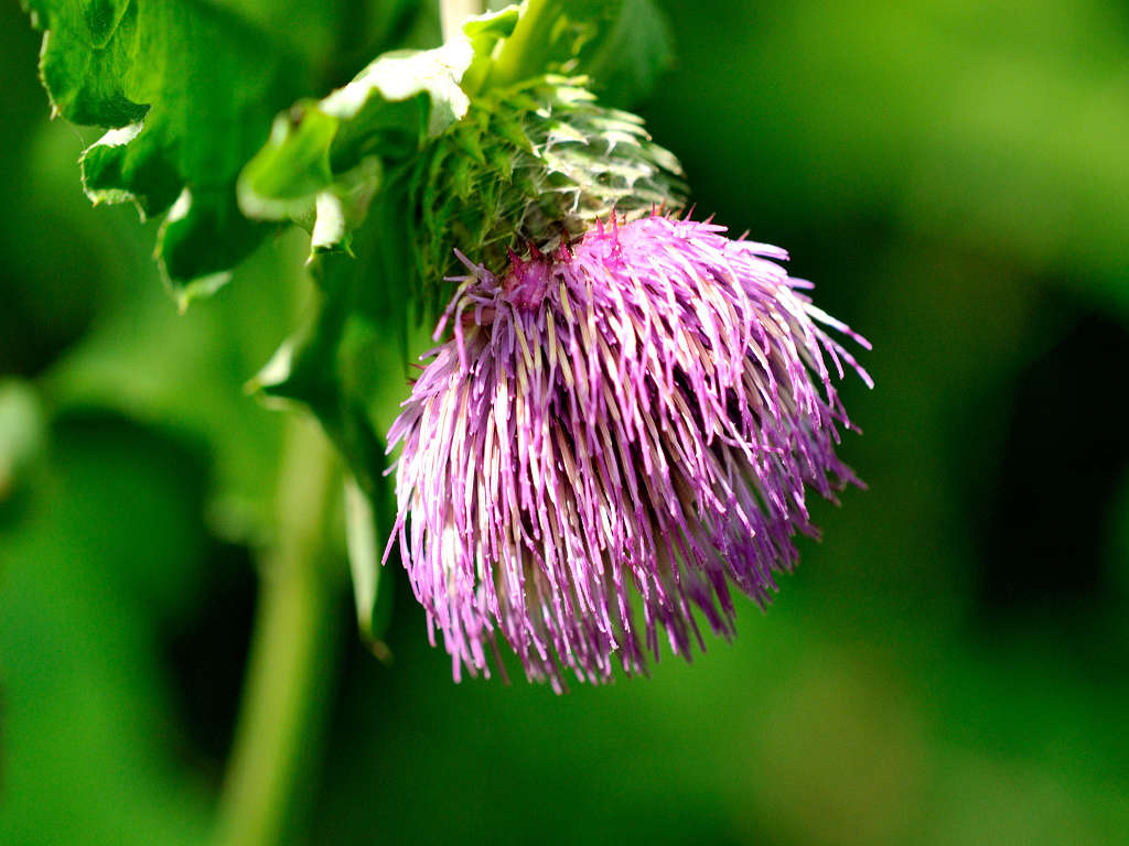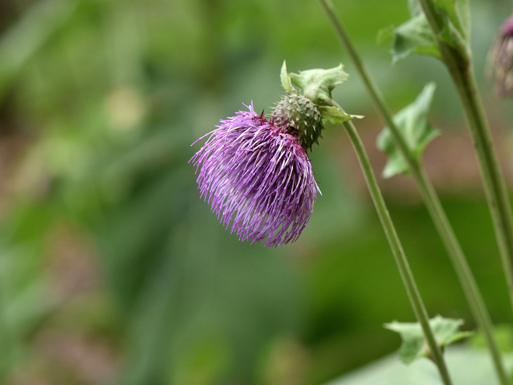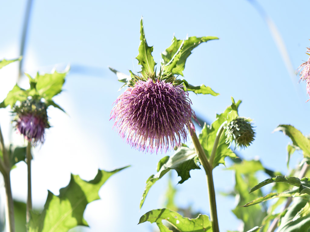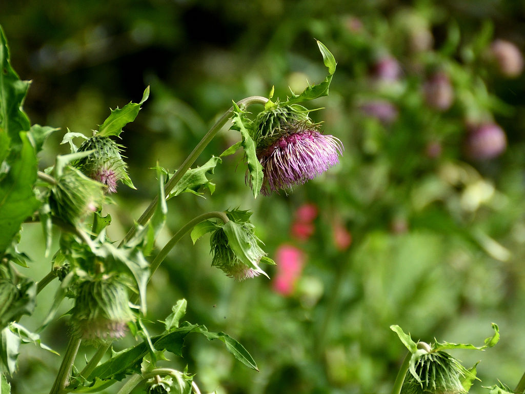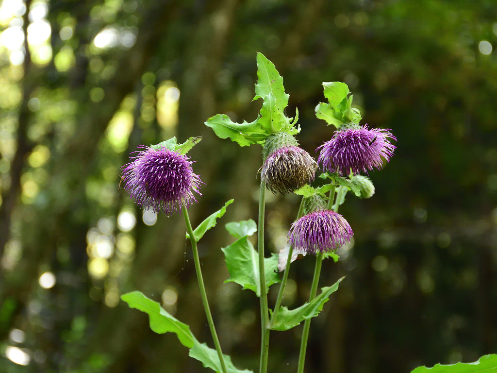 花が美しいので近寄ると、鋭い刺に「おどろく=あさむ」 「あさむ」が「アザミ」に。 沢や川の側の湿り気のある所に咲くので「サワ」が付いた