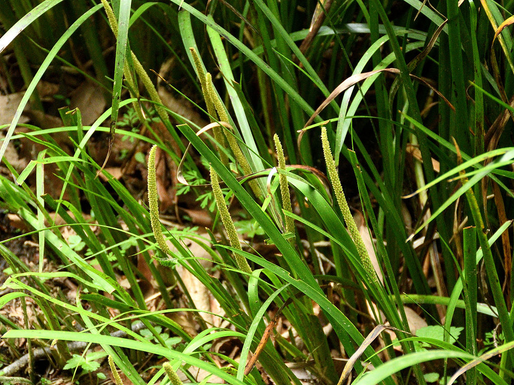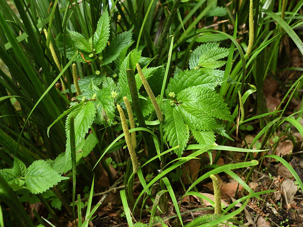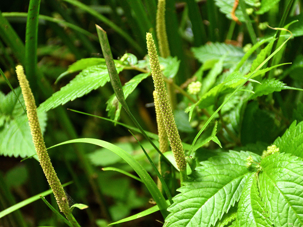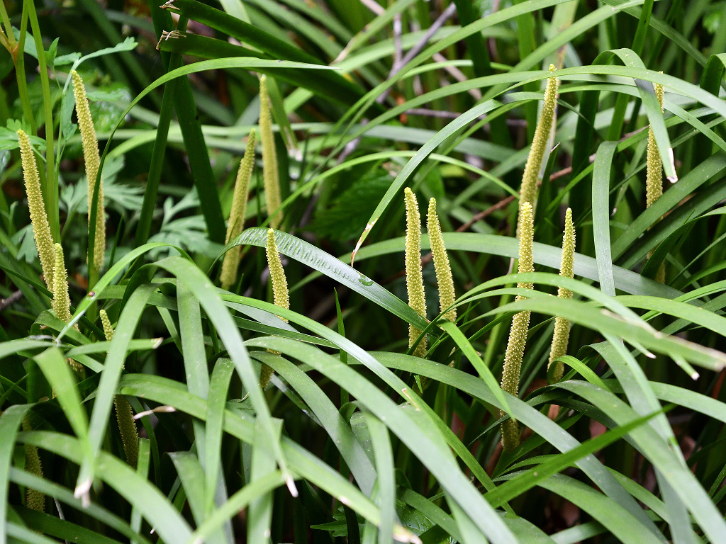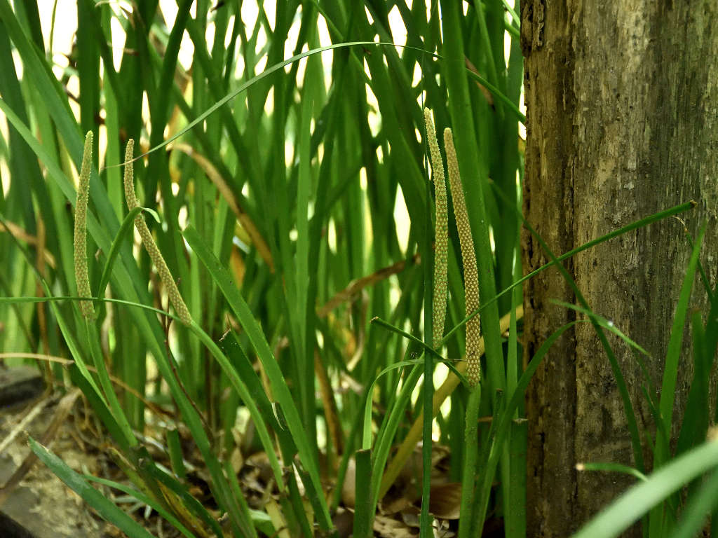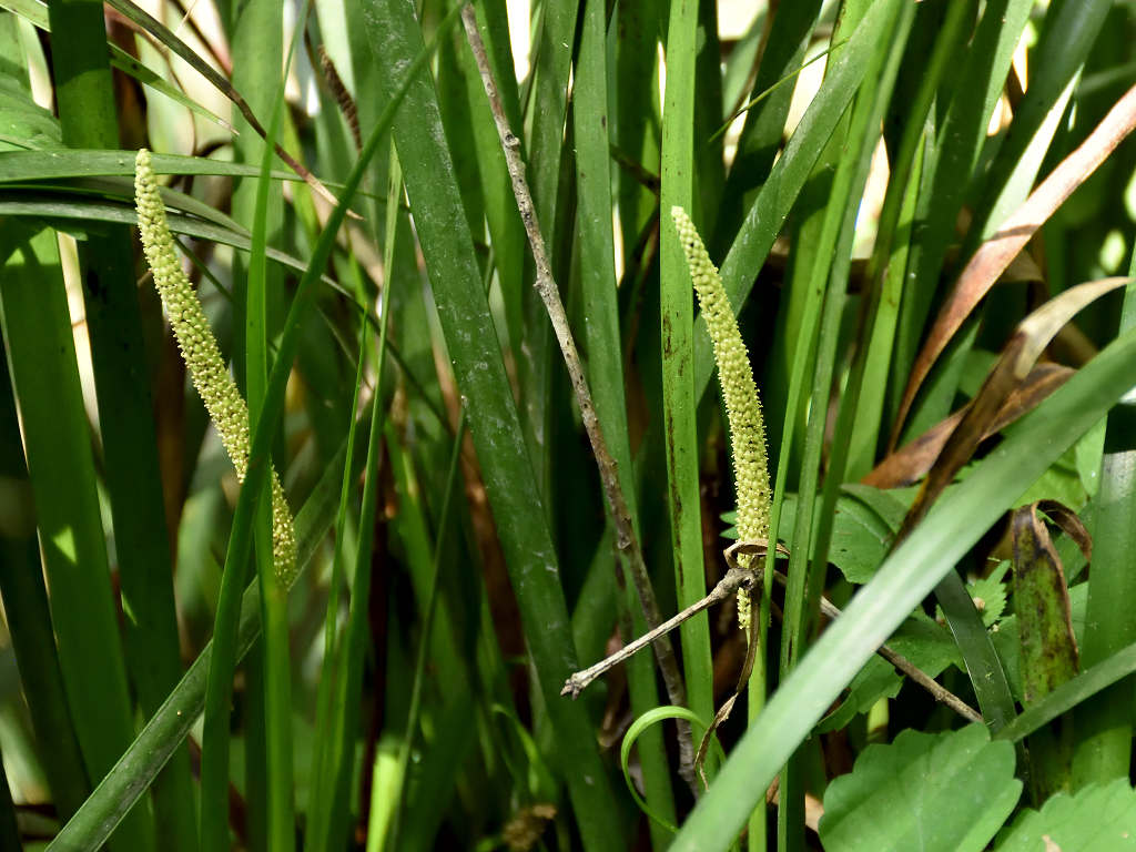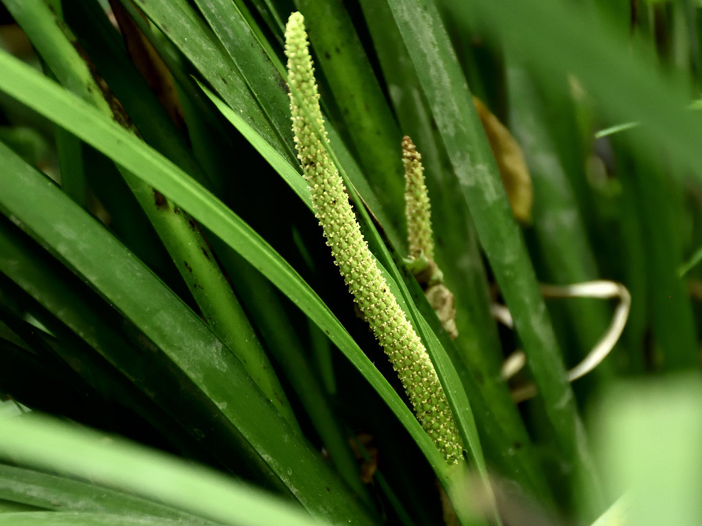 淡黄色の細長い肉穂花序(にくすいかじょ)をつける