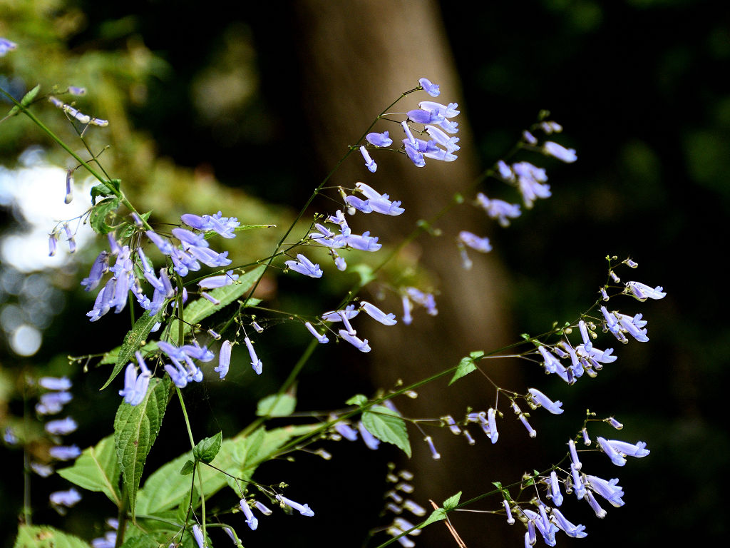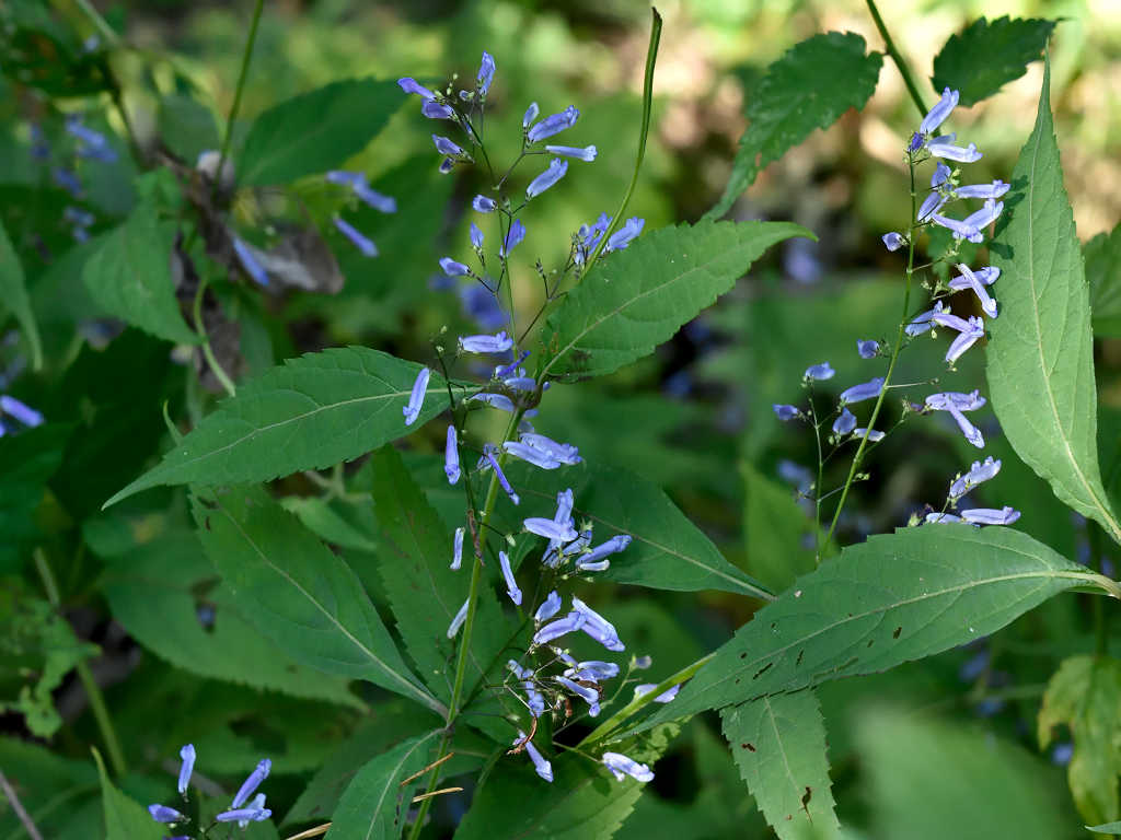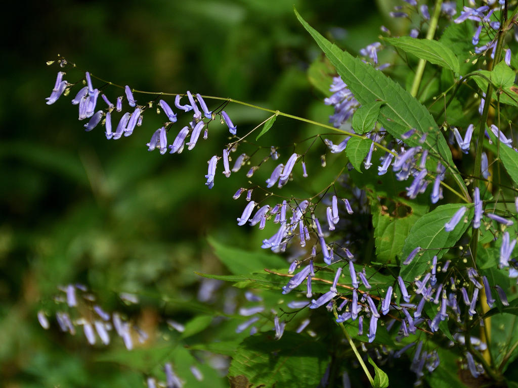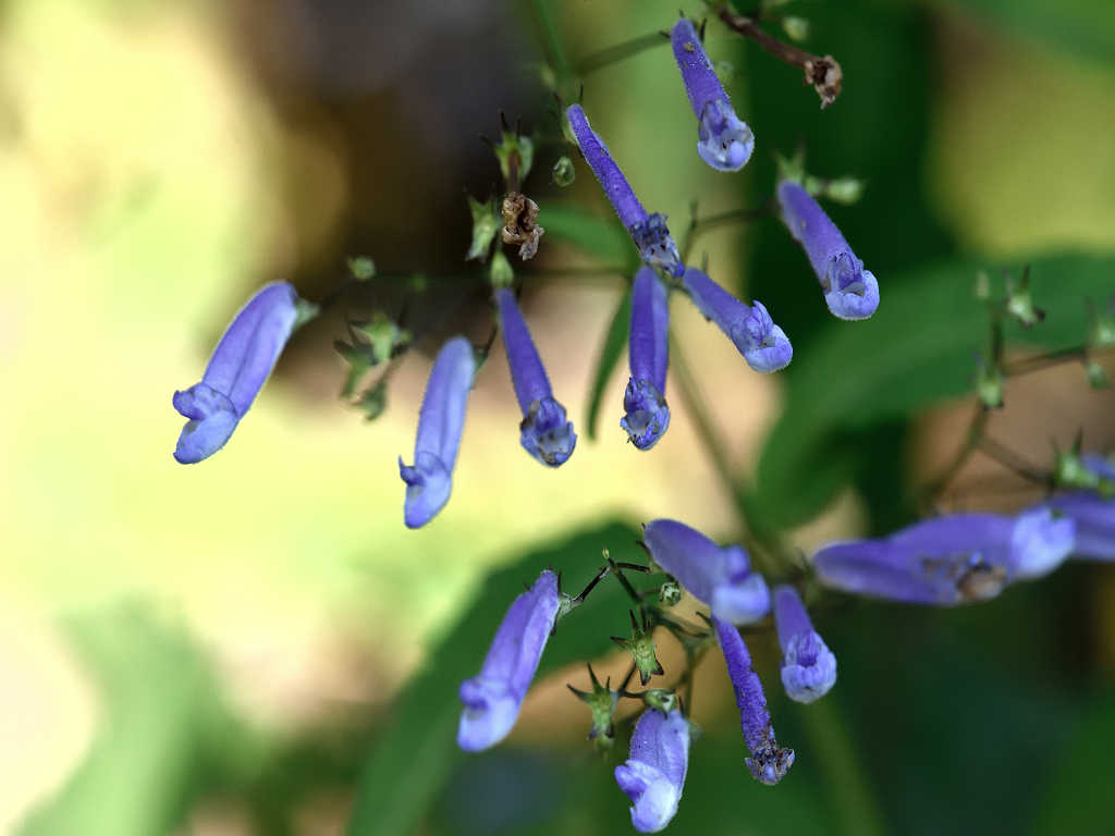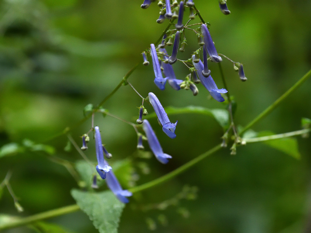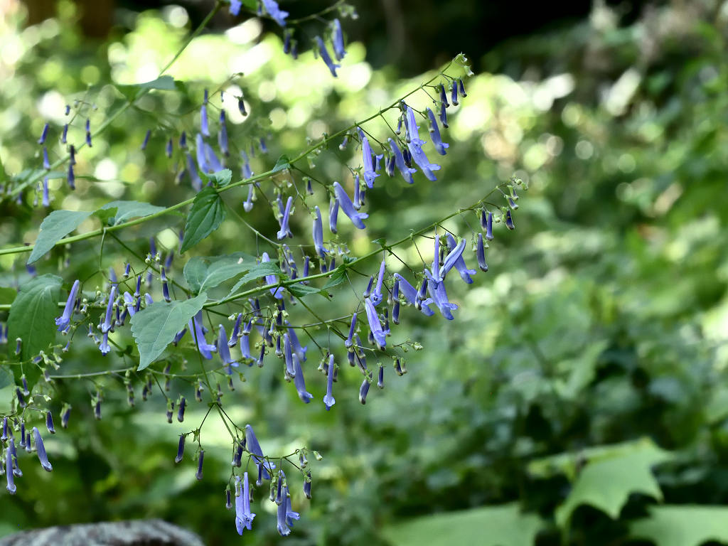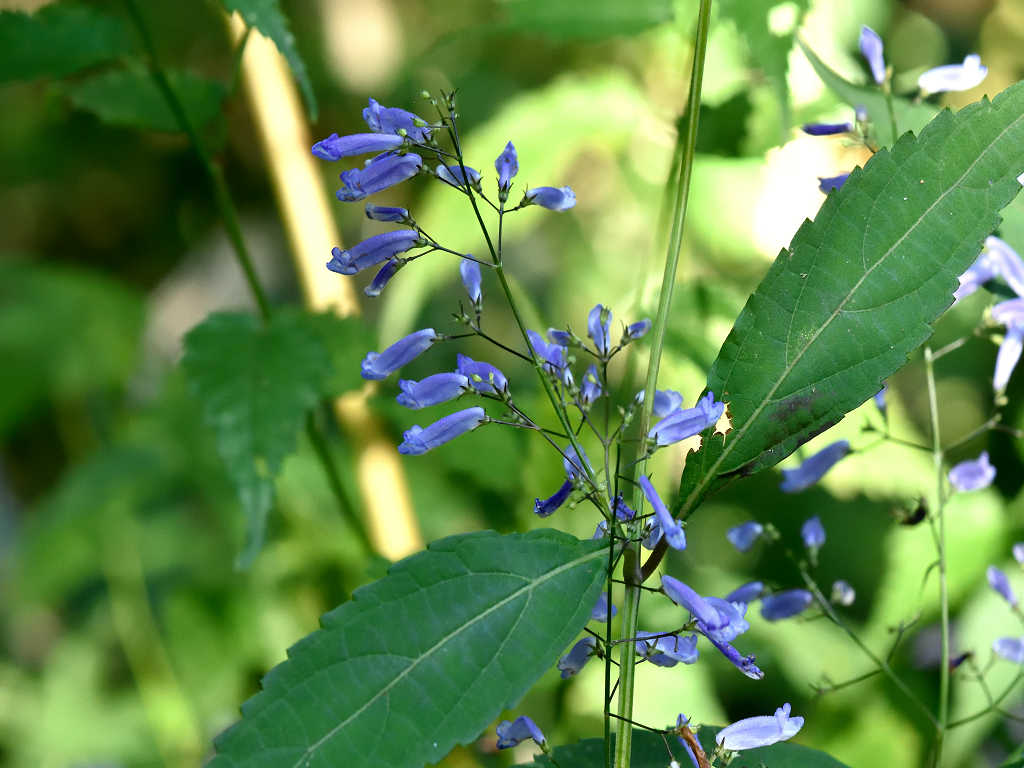 茎は細く上に伸び枝分かれし、多数の細長い柄を出しその先に青色の先が唇状の花を付ける
