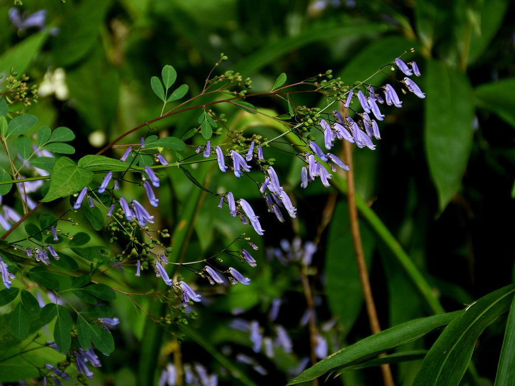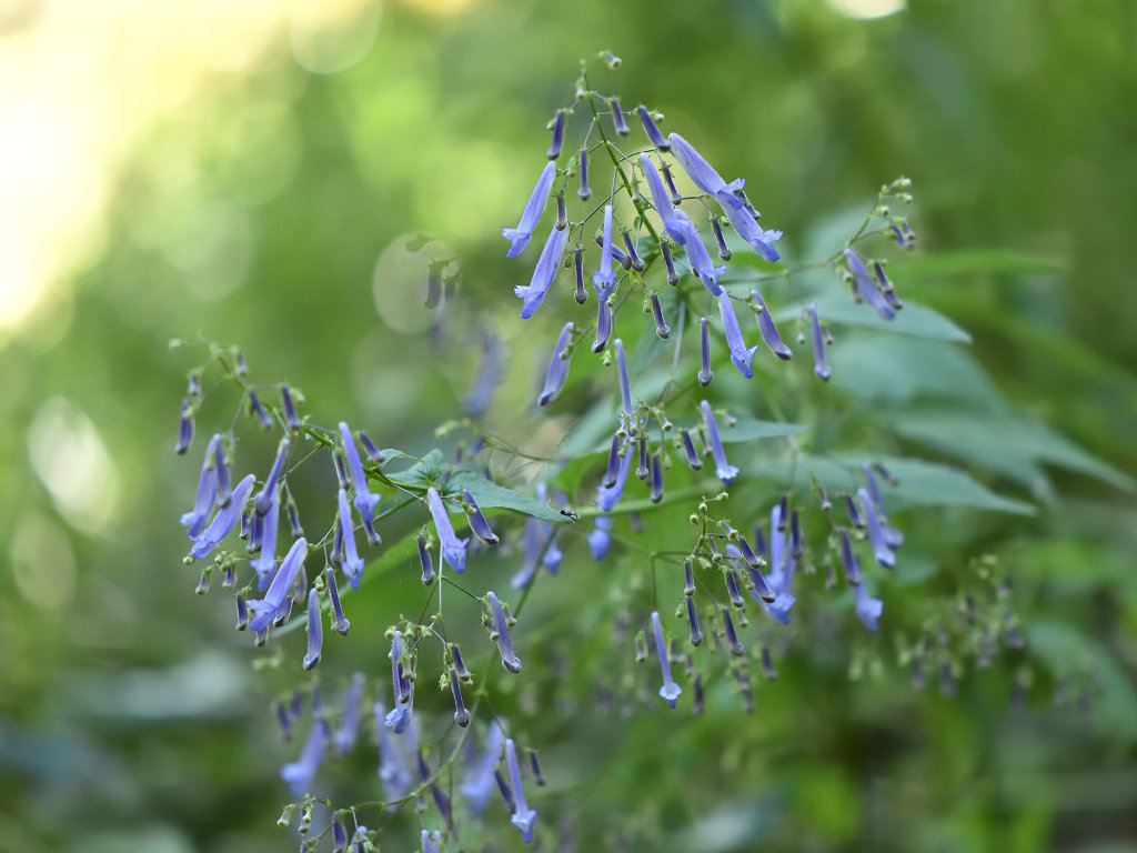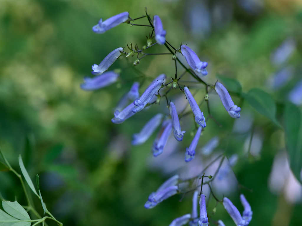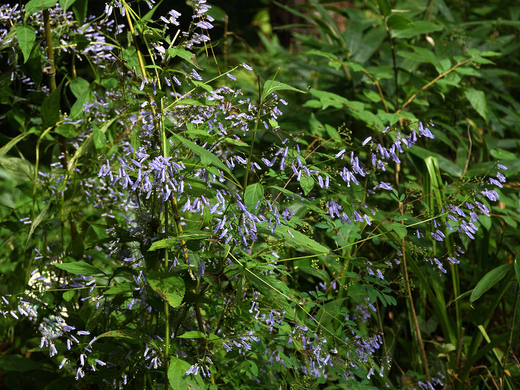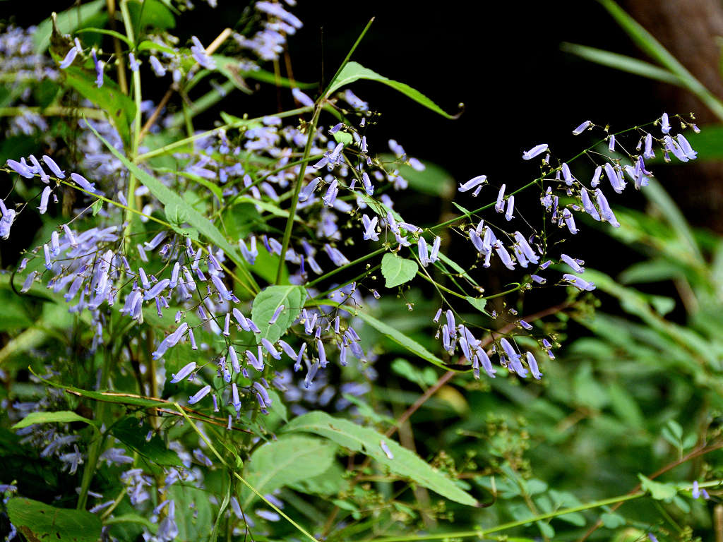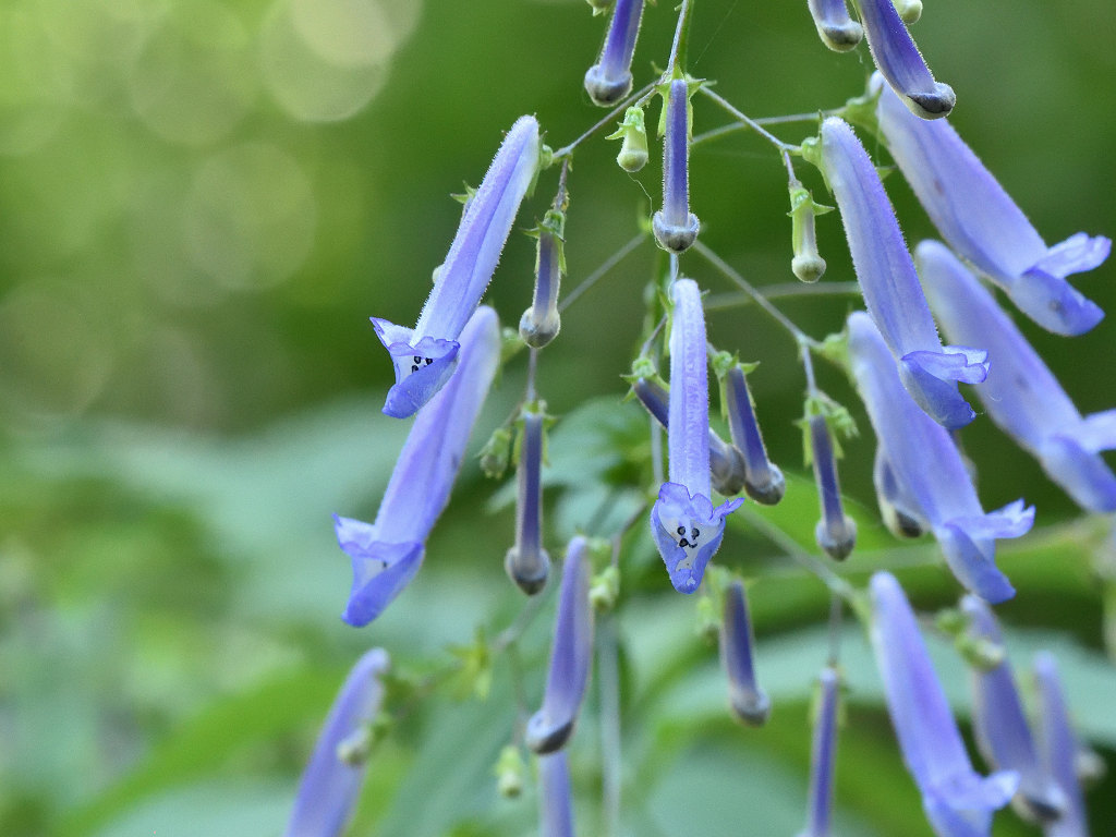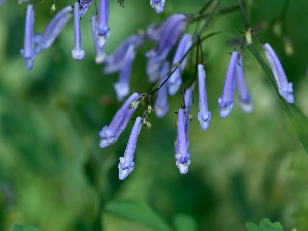 茎は細く上に伸び枝分かれし、多数の細長い柄を出しその先に青色の先が唇状の花を付ける