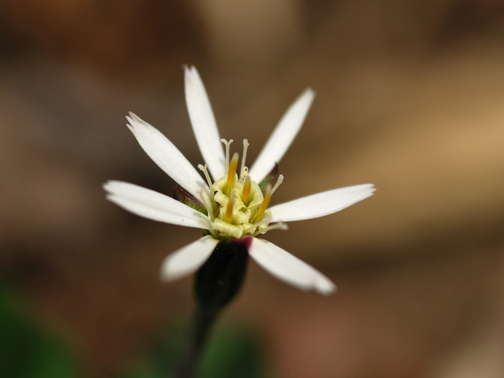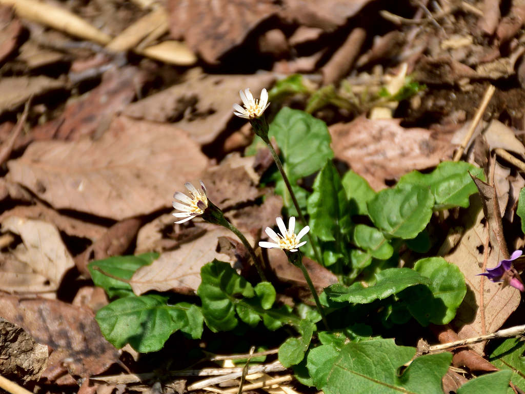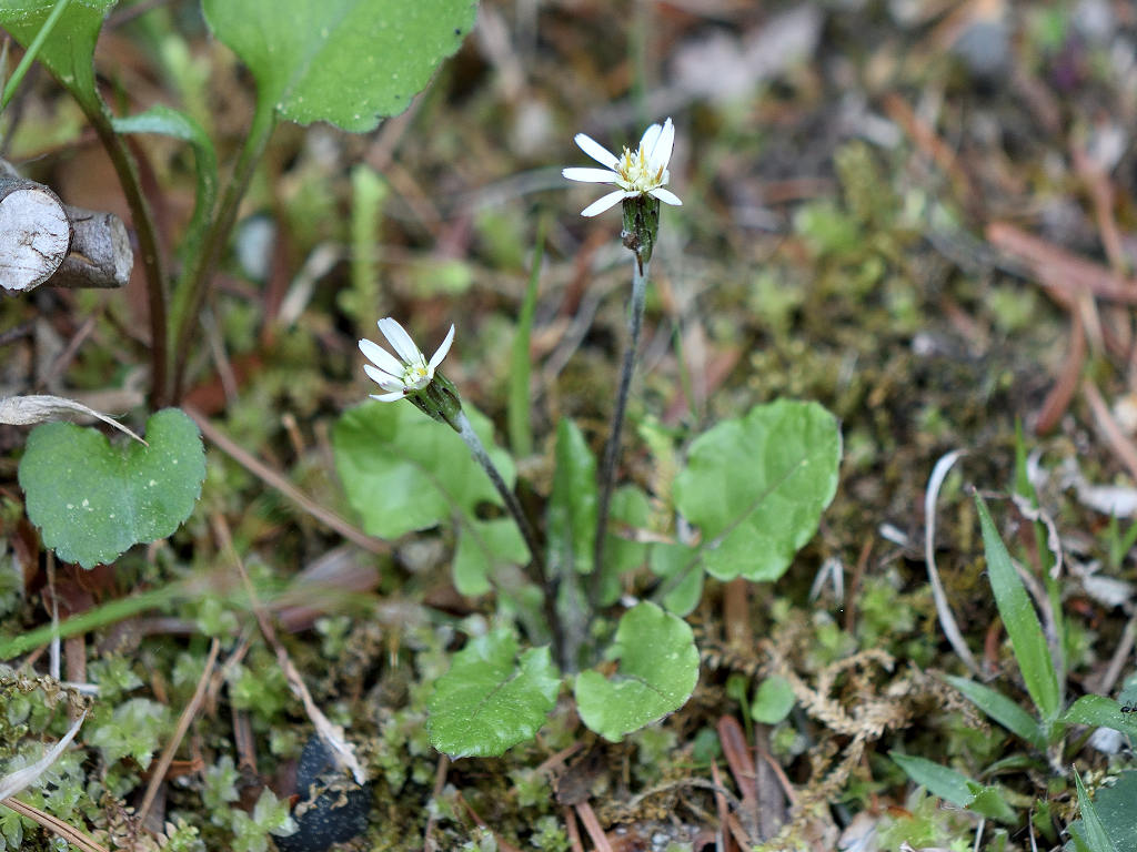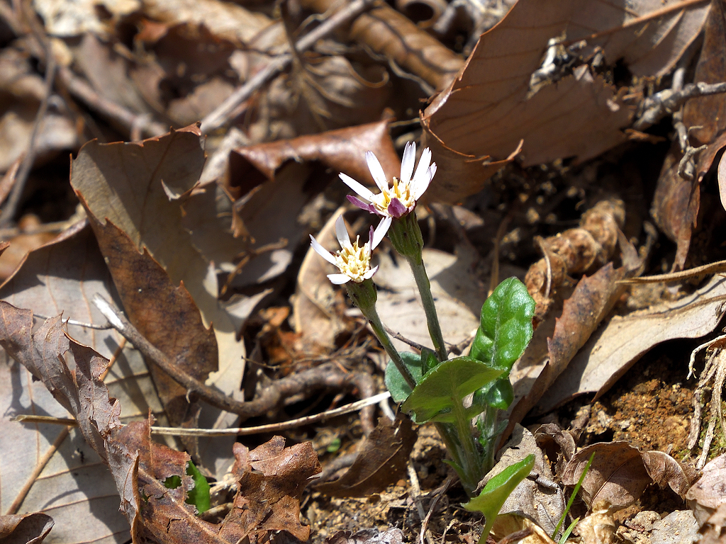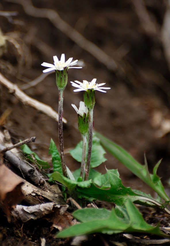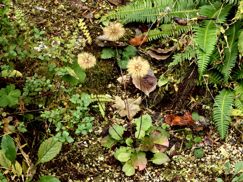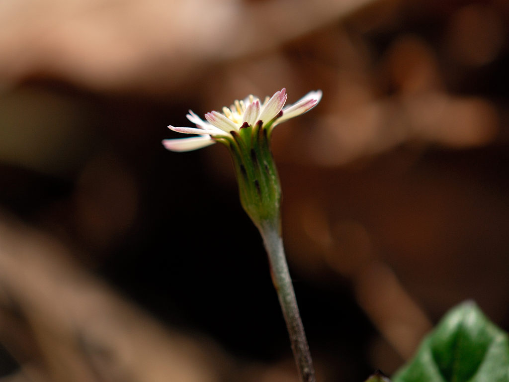 花は舌状花 内側は白色 外側は赤紫色 秋の閉鎖花は槍の穂先に似て実を付ける