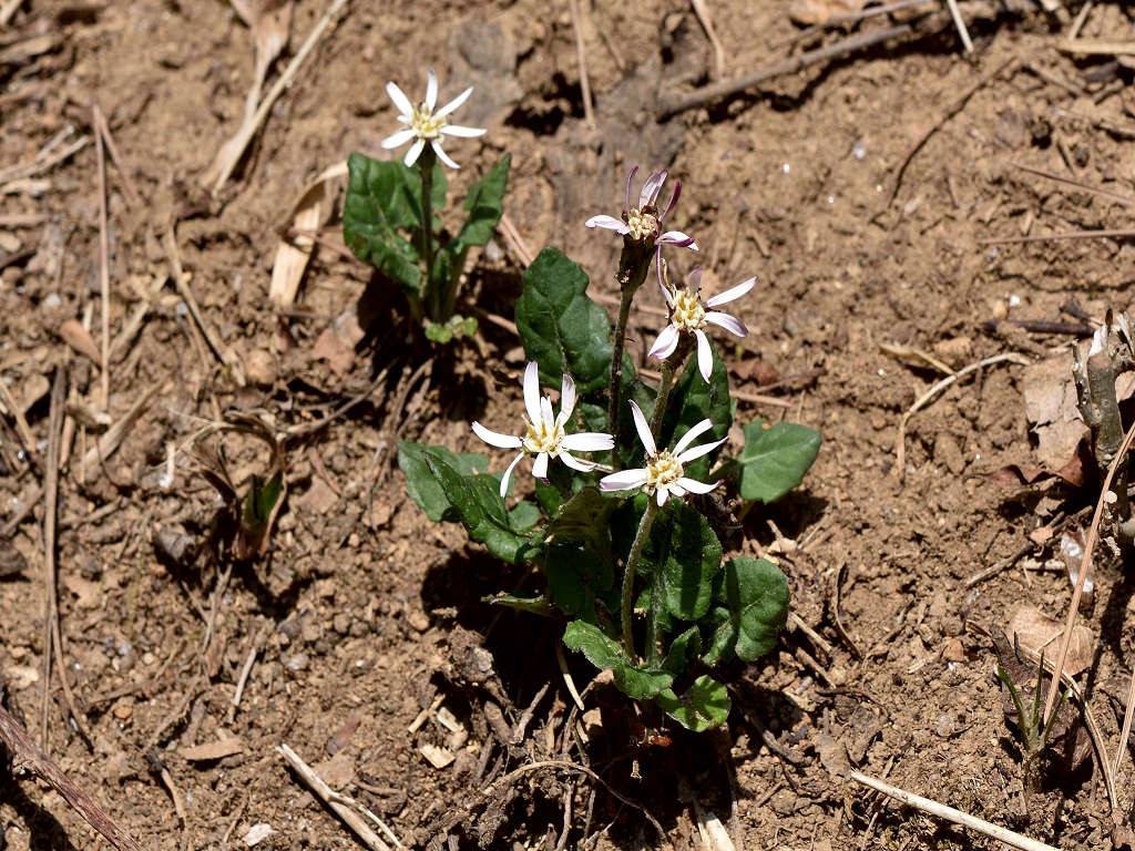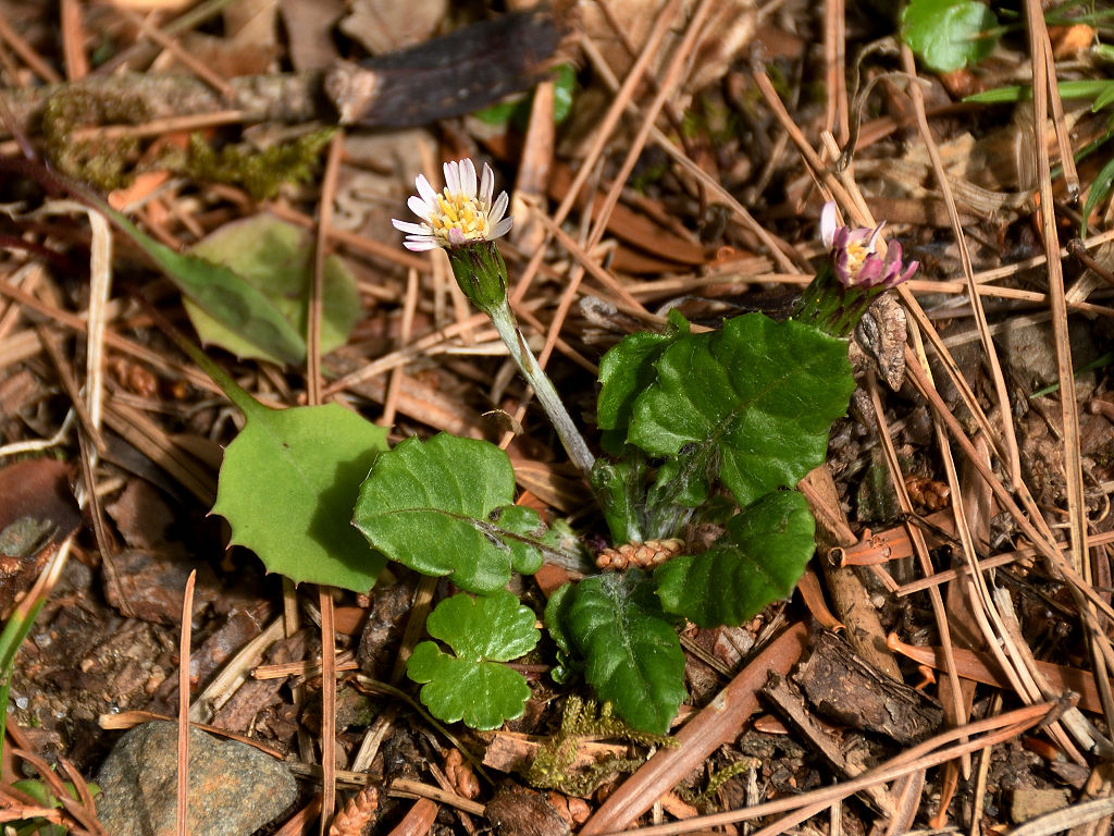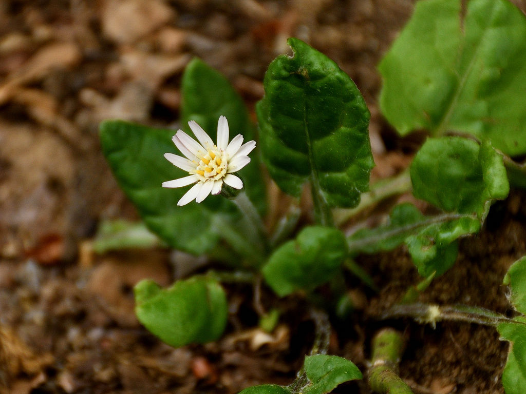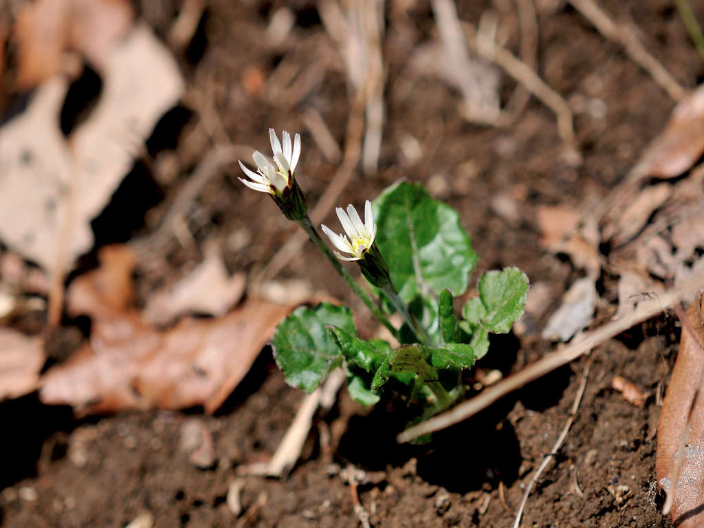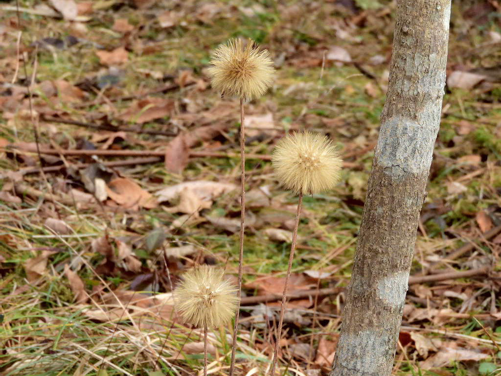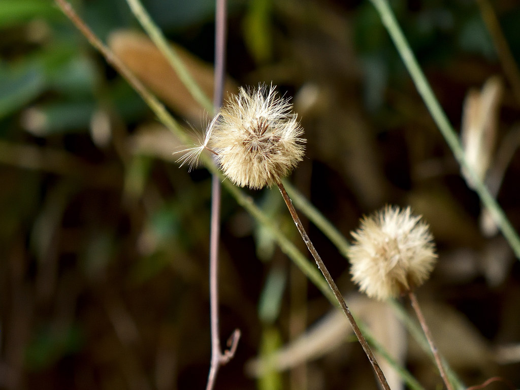 花は舌状花 内側は白色 外側は赤紫色 秋の閉鎖花は槍の穂先に似て実を付ける