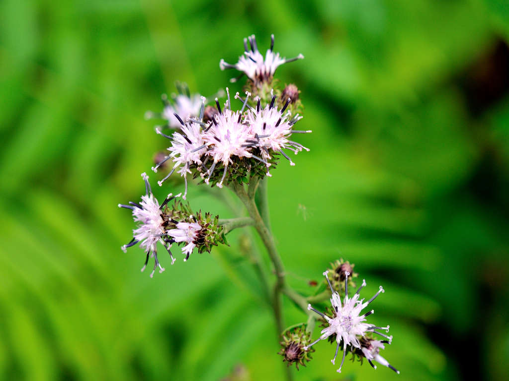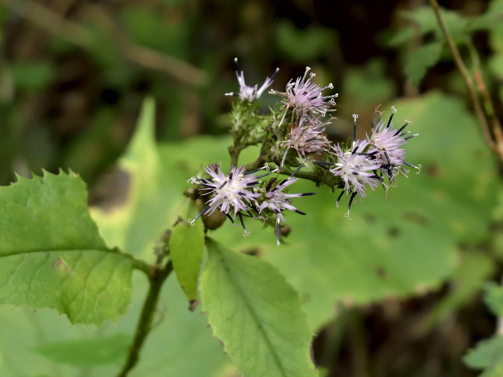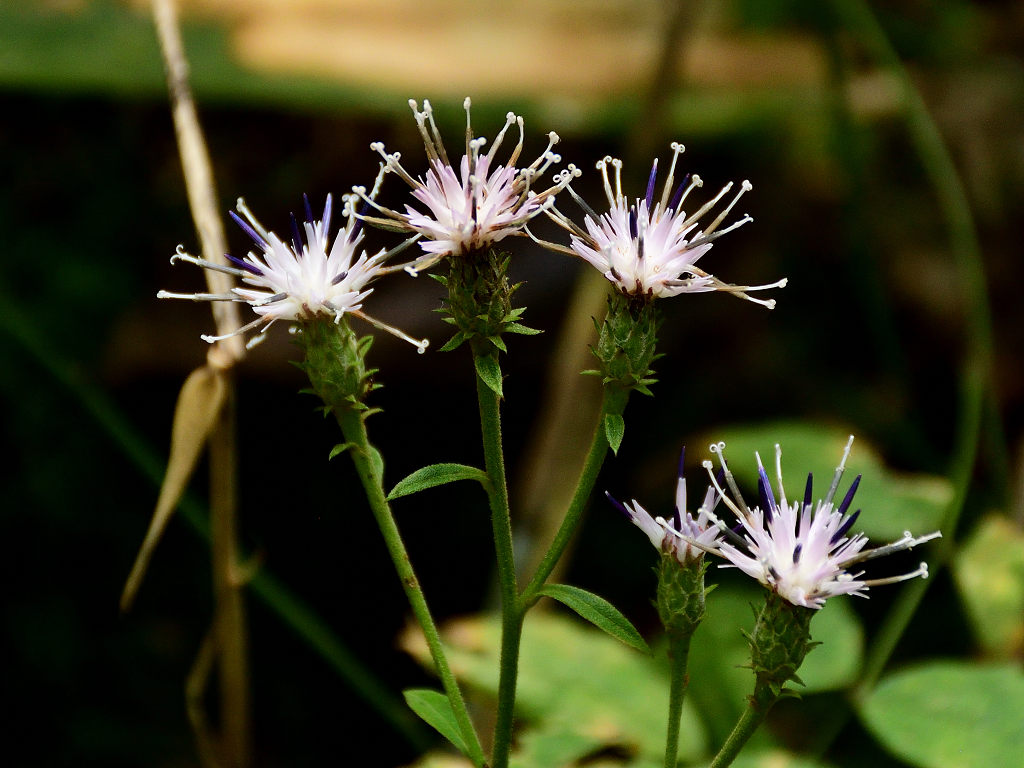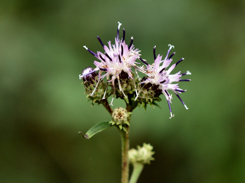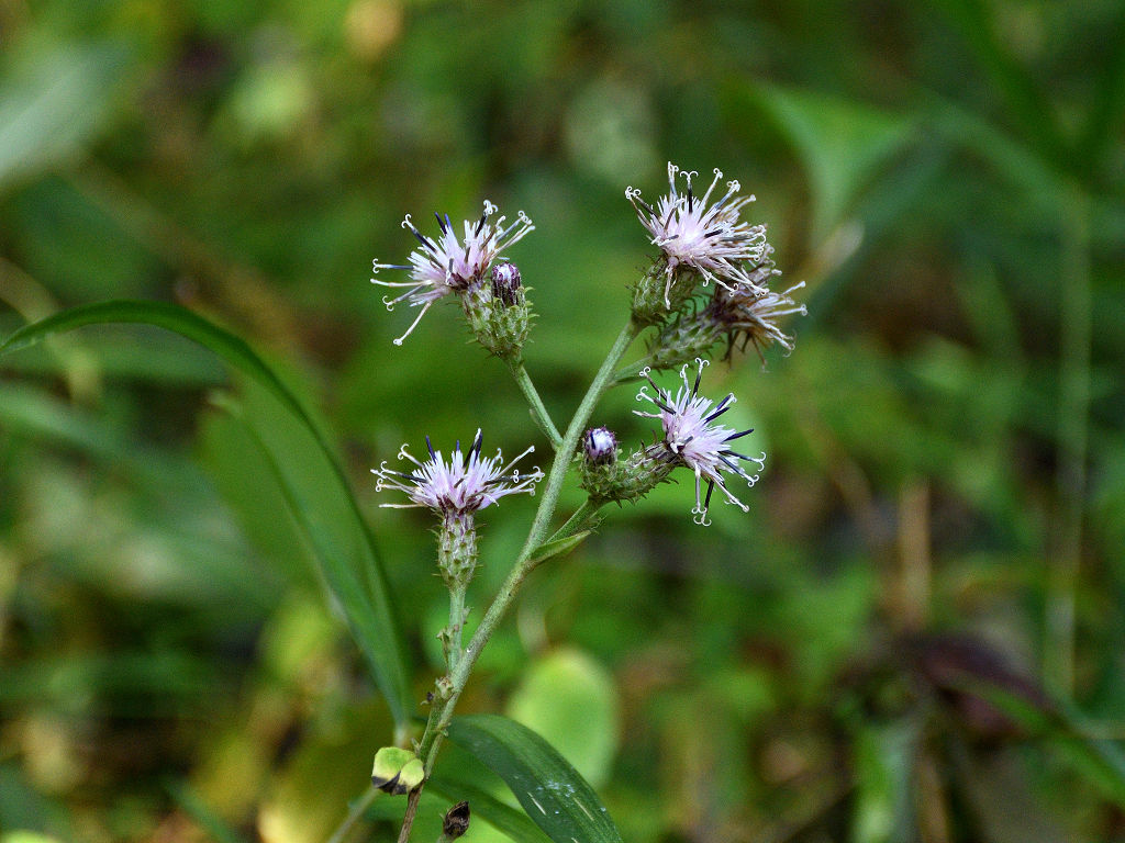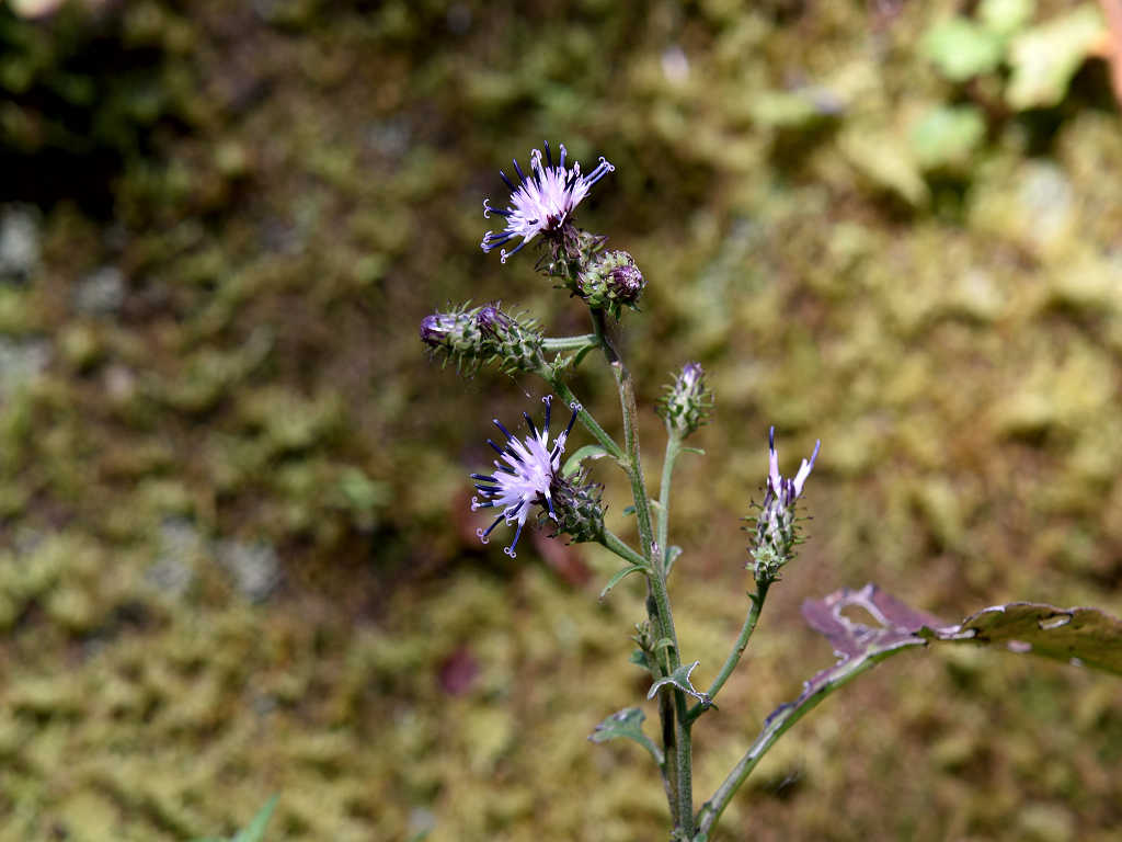 茎には狭い翼がある やや濃いピンクの頭花を、散房状に多数つける