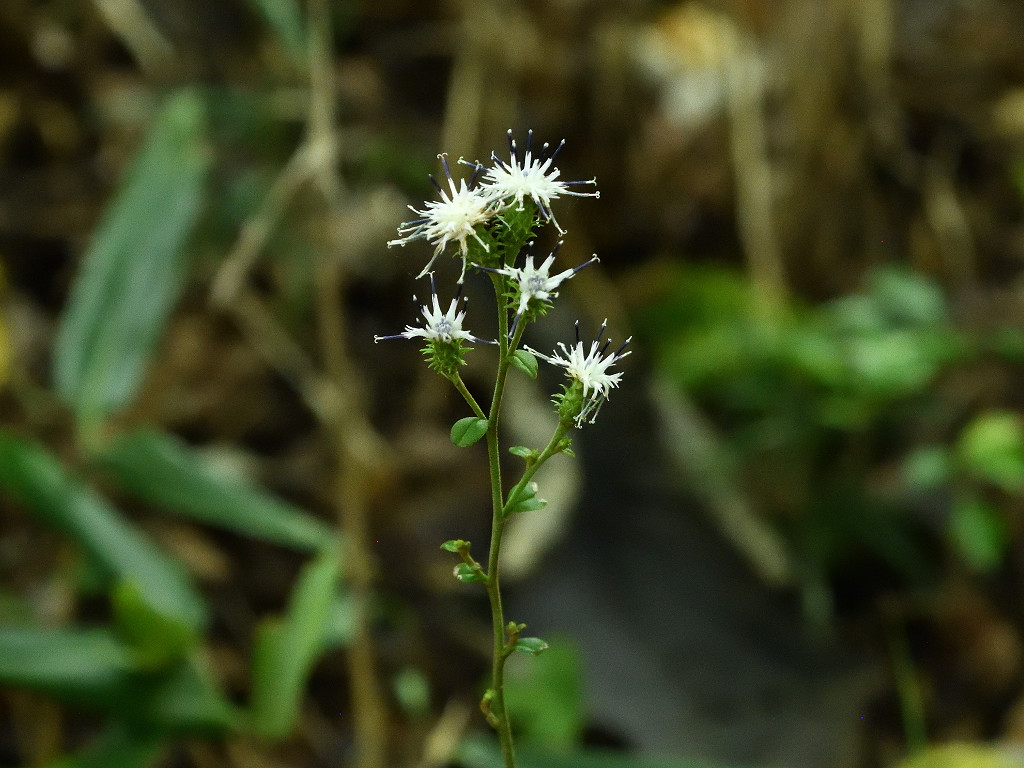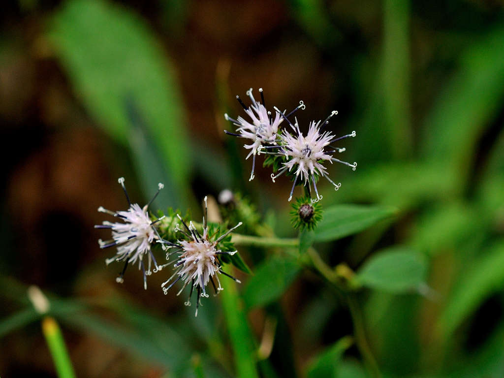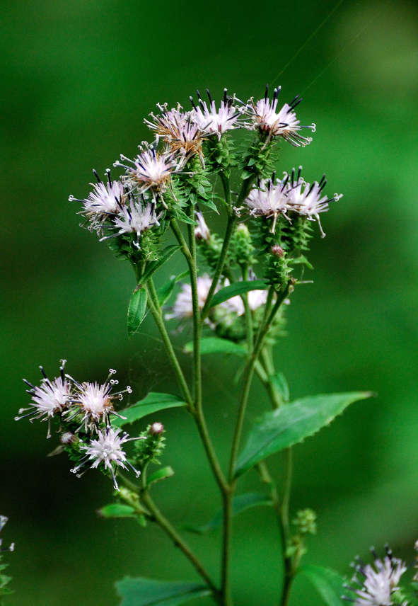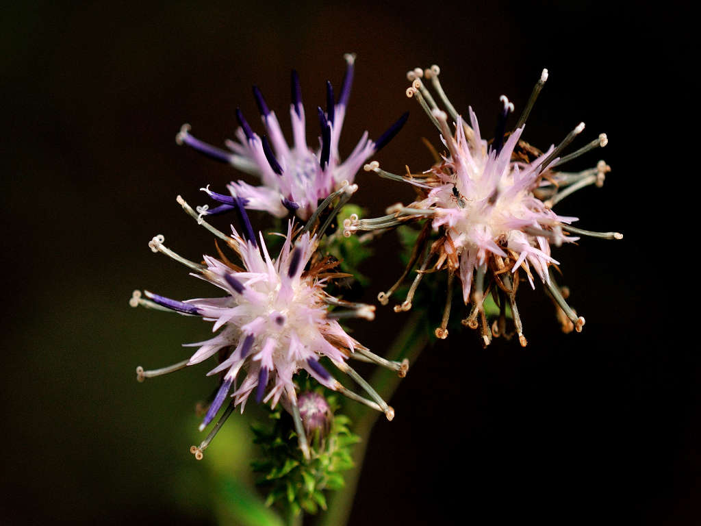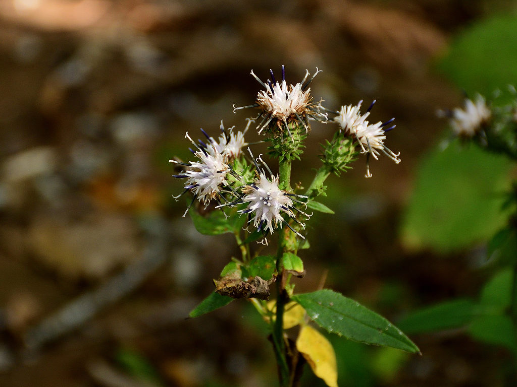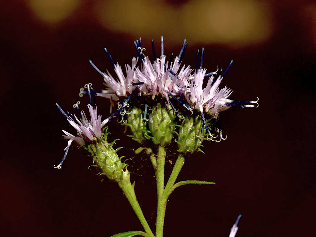 茎には狭い翼がある やや濃いピンクの頭花を、散房状に多数つける